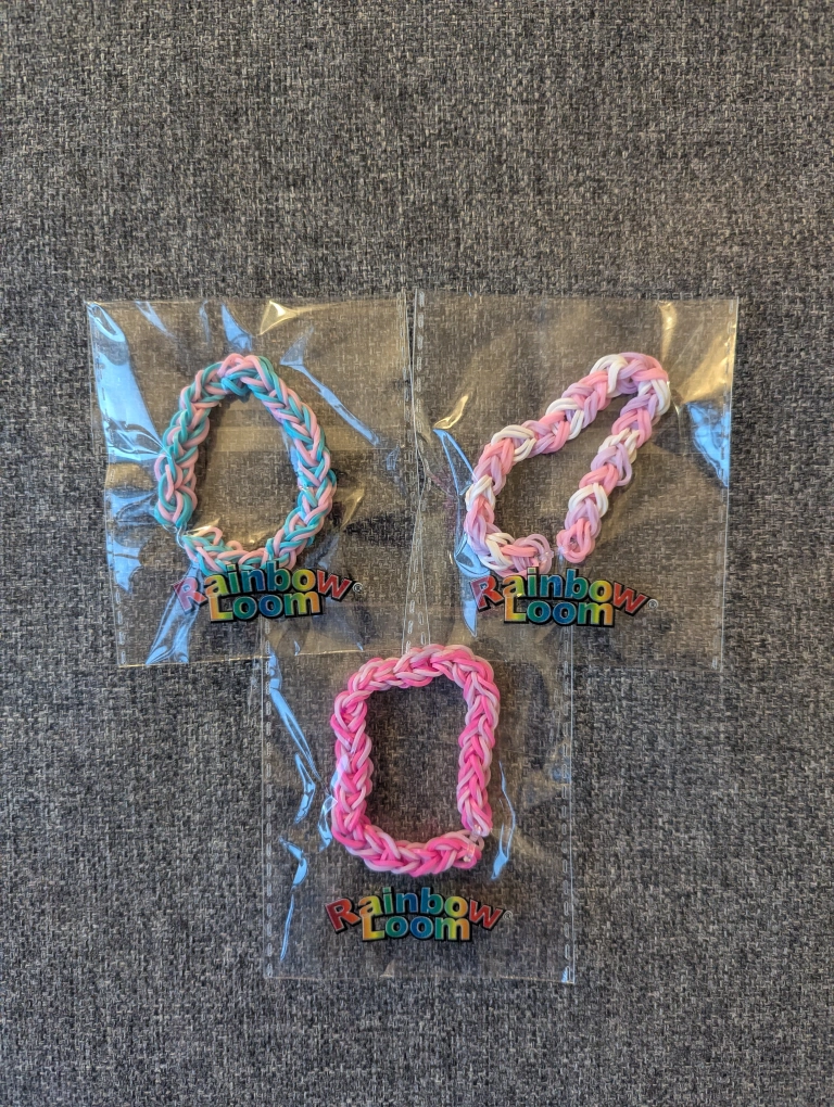 Selling three brand new Rainbow Loom bracelets still in their original packaging! They're colourful and fun for kids to wear or trade with friends.