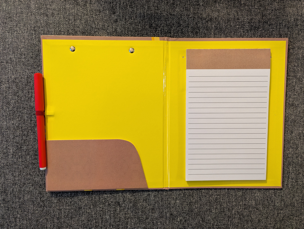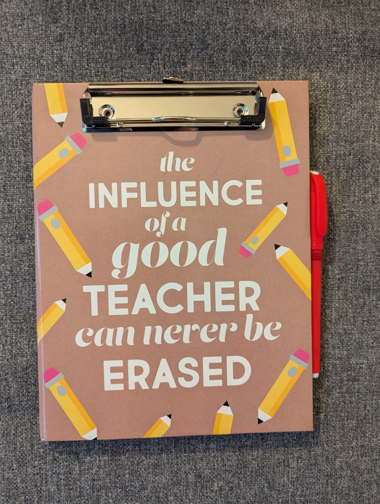 This is a brand new clipboard with a pen included! It features a cute design with pencils and a positive message for teachers. Inside, there's a notepad and a pocket for storing papers. Perfect gift for any teacher!