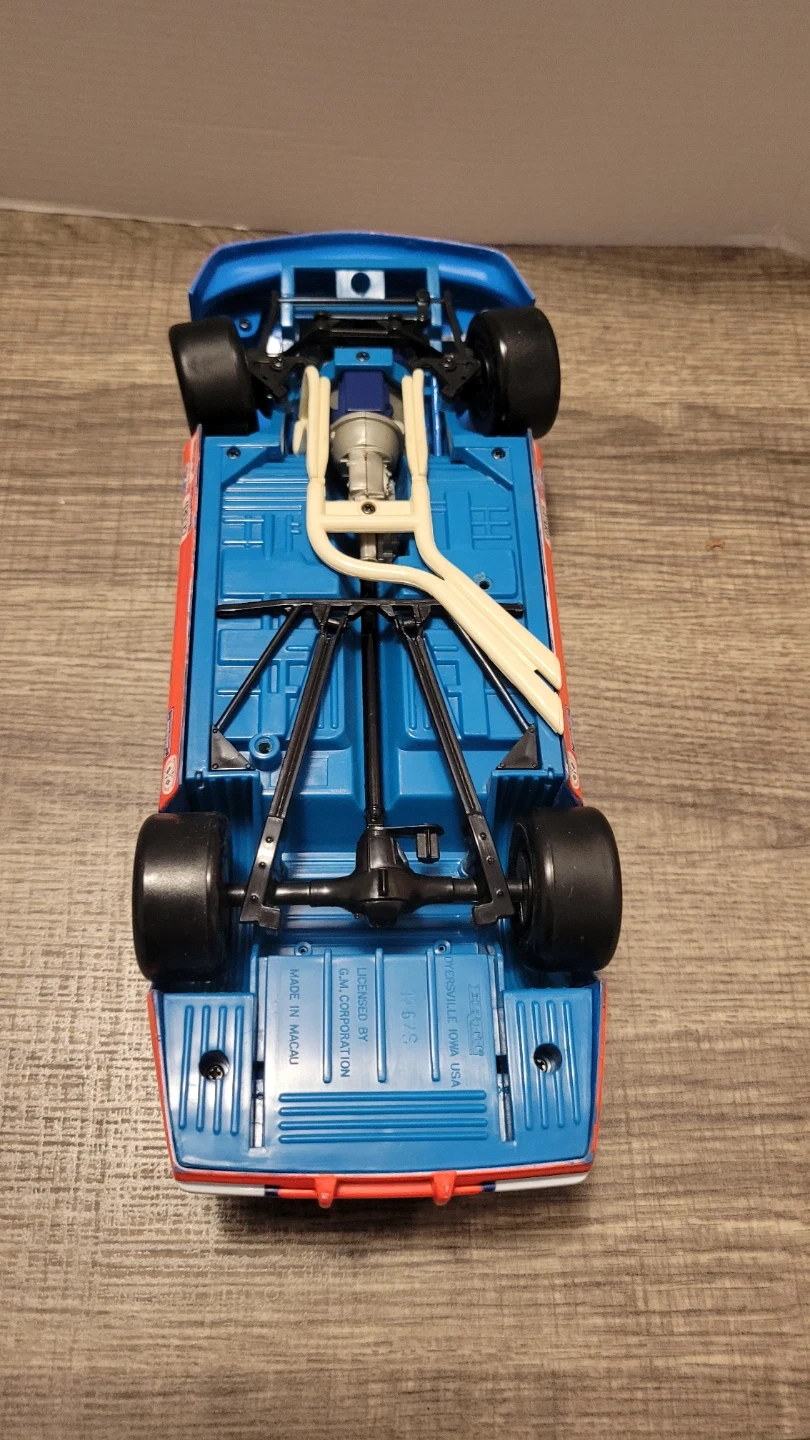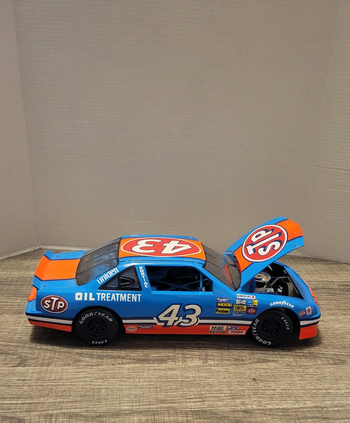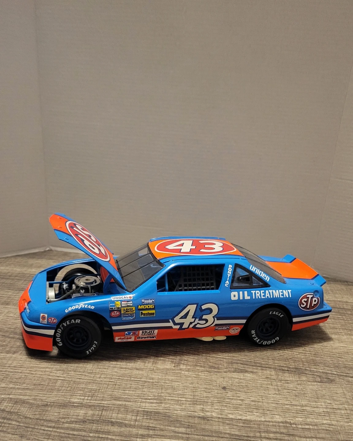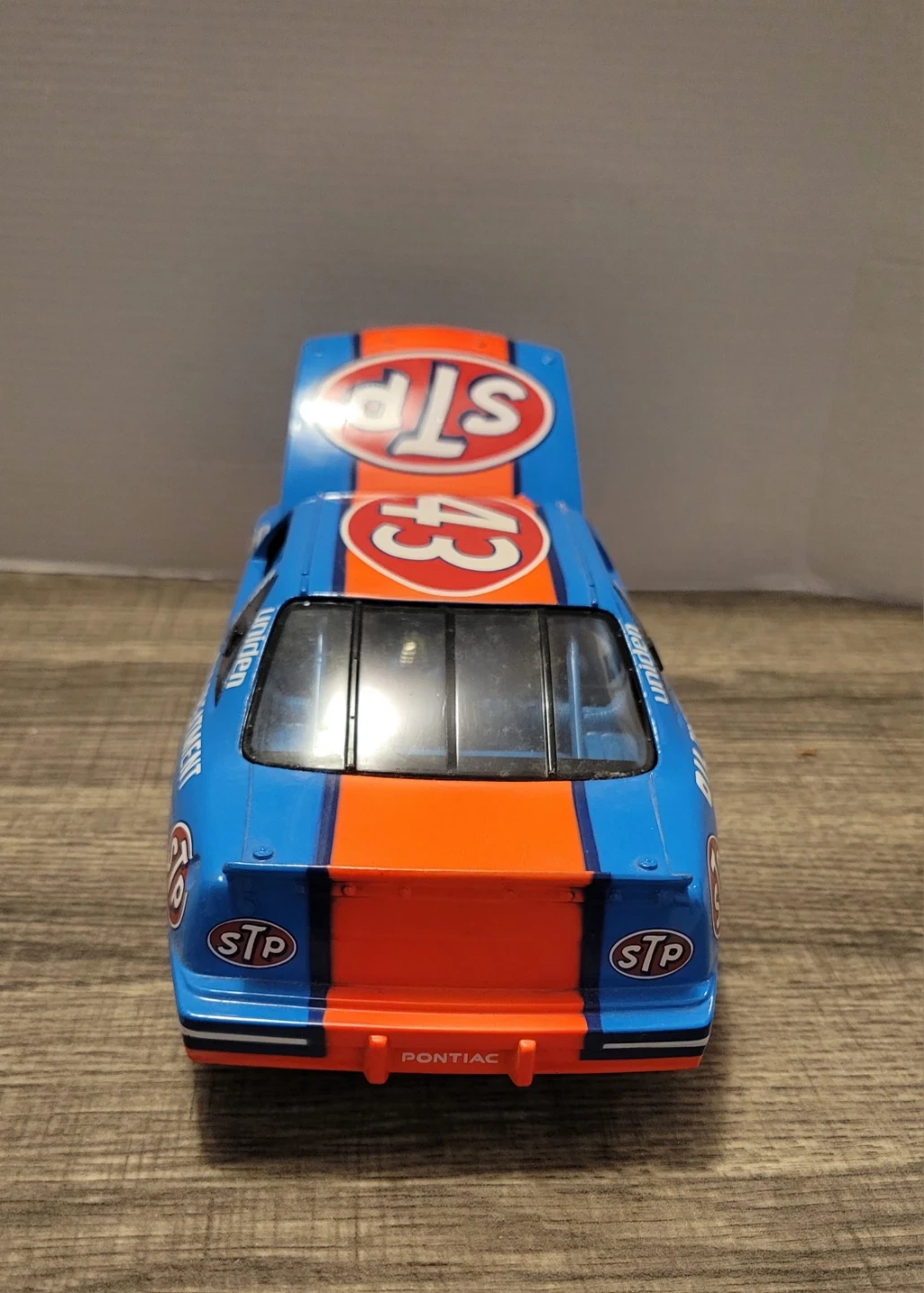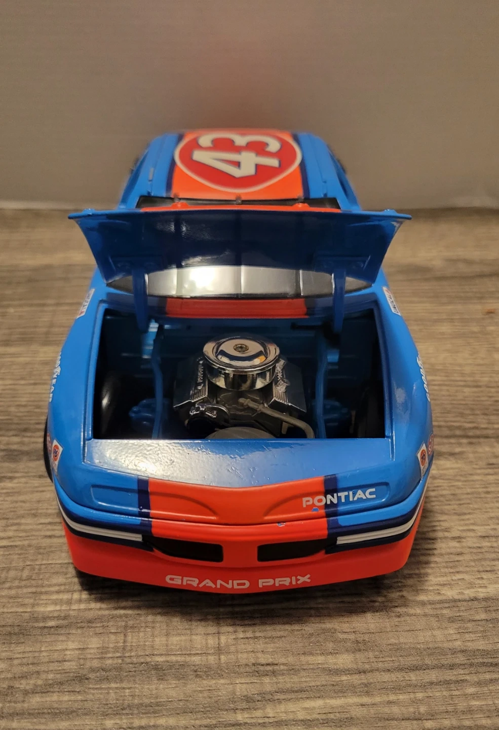 Selling a diecast model of the #43 Pontiac Grand Prix race car. It's blue and orange with lots of cool details and sponsor logos. The hood opens up to show the engine!