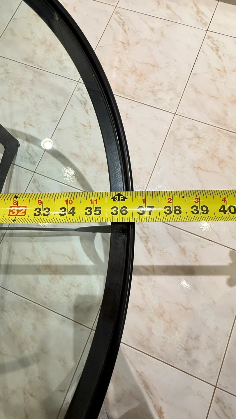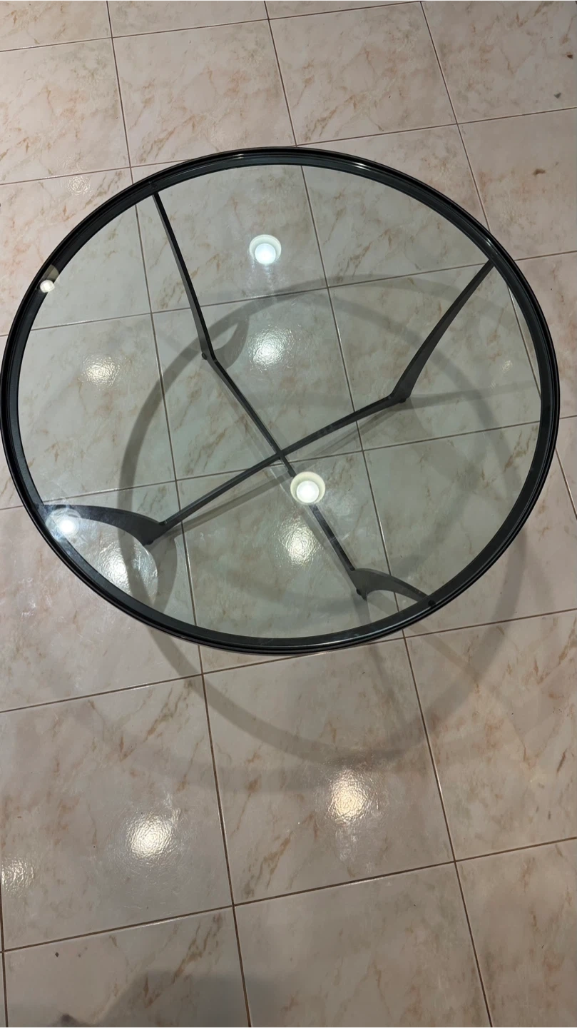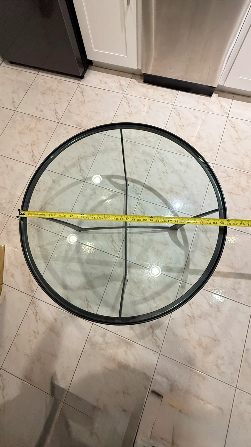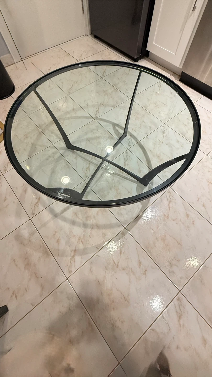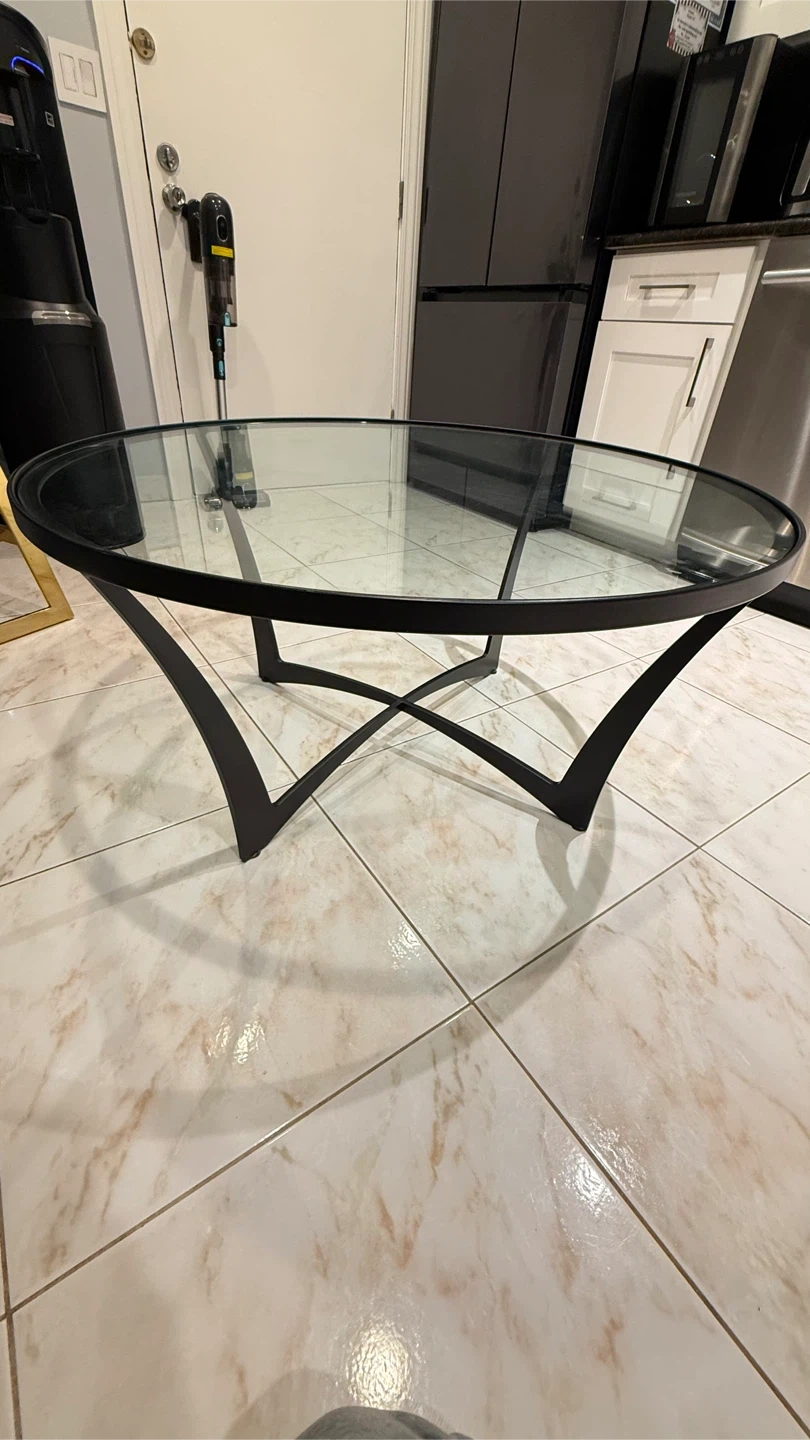 Selling a round coffee table with a glass top! The table measures about 36 inches in diameter. It features a sleek black frame and a clear glass surface. Perfect for any living room!Carleston Forge