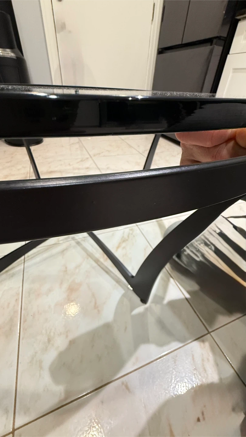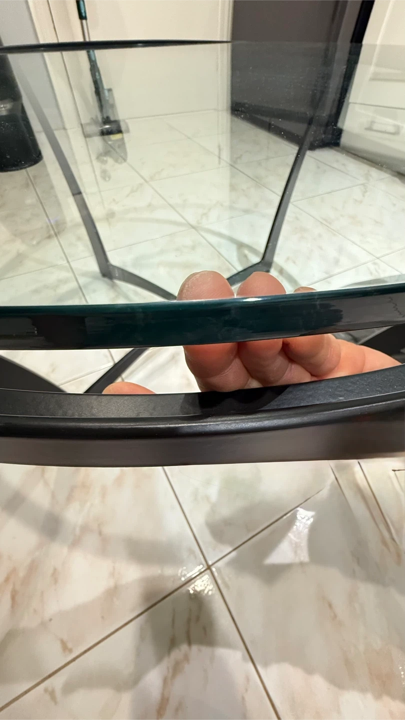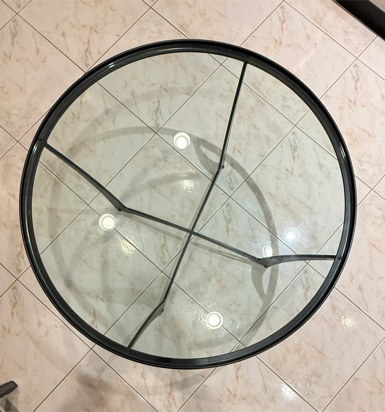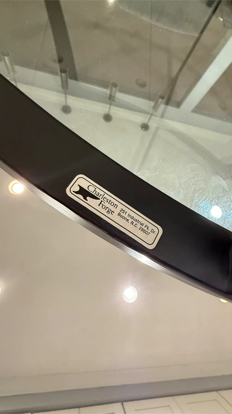 Selling a round coffee table with a glass top! The table measures about 36 inches in diameter. It features a sleek black frame and a clear glass surface. Perfect for any living room!Carleston Forge
