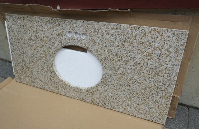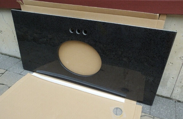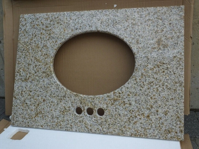 LUXO MARBRE Natural Granite Vanity Countertop Brand New Granite vanity countertop with half bullnose edge for Oval sink. Beautiful with vanity 30" x 21" or 48" x 21". Real natural stone. Undermount hardware included. Colour : Rust Yellow 31" X 22" - $100 . For size 49" X 22" - $150 Black 49" X 22" - $150