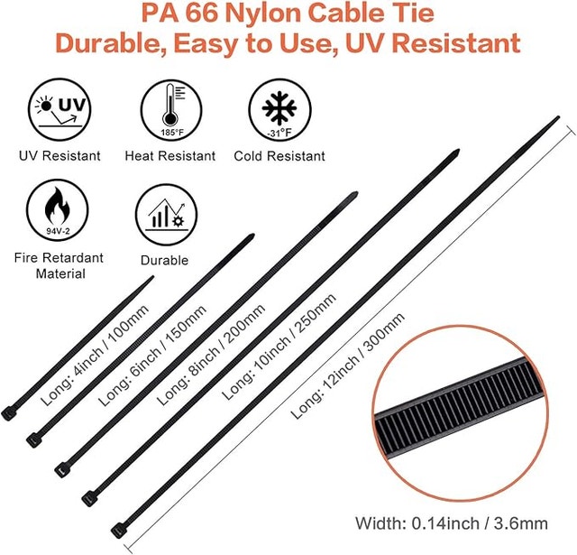 Made of industrial strength nylon 6/6 fire resistant material, the cable straps are flexible to be used in temperatures ranges from -31℉ to +185℉ (-35℃ to +85℃), uv resistant for outdoor.