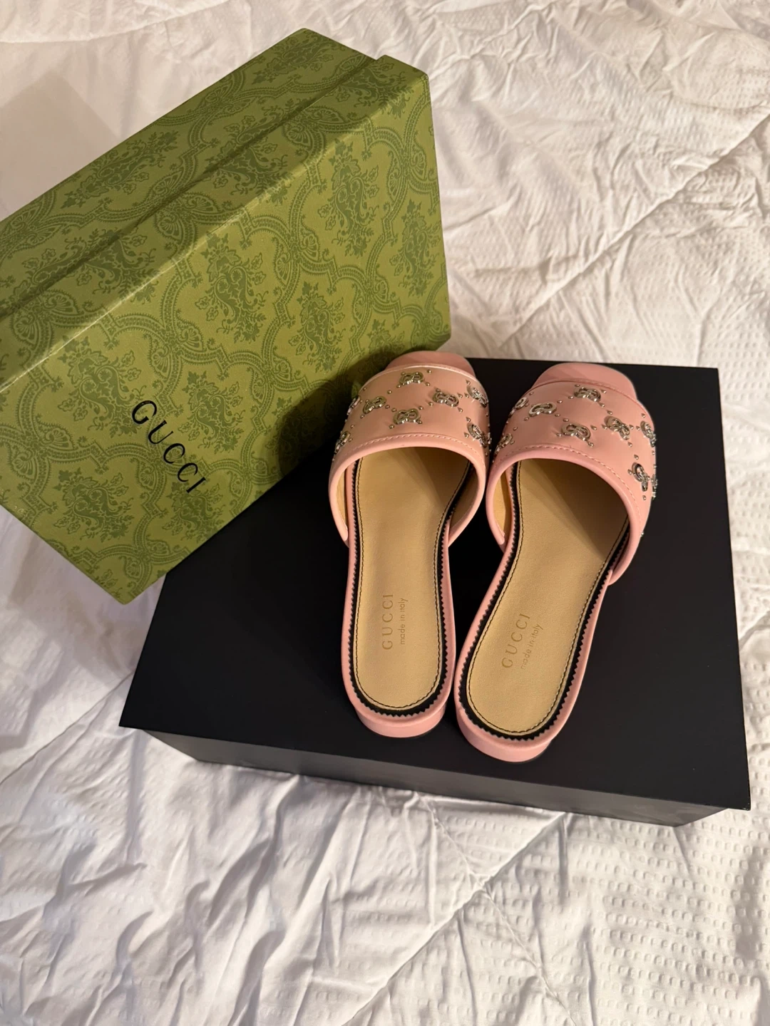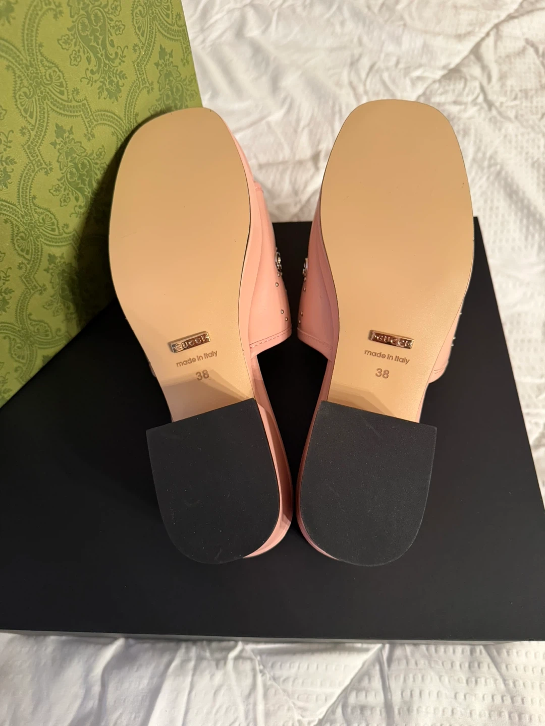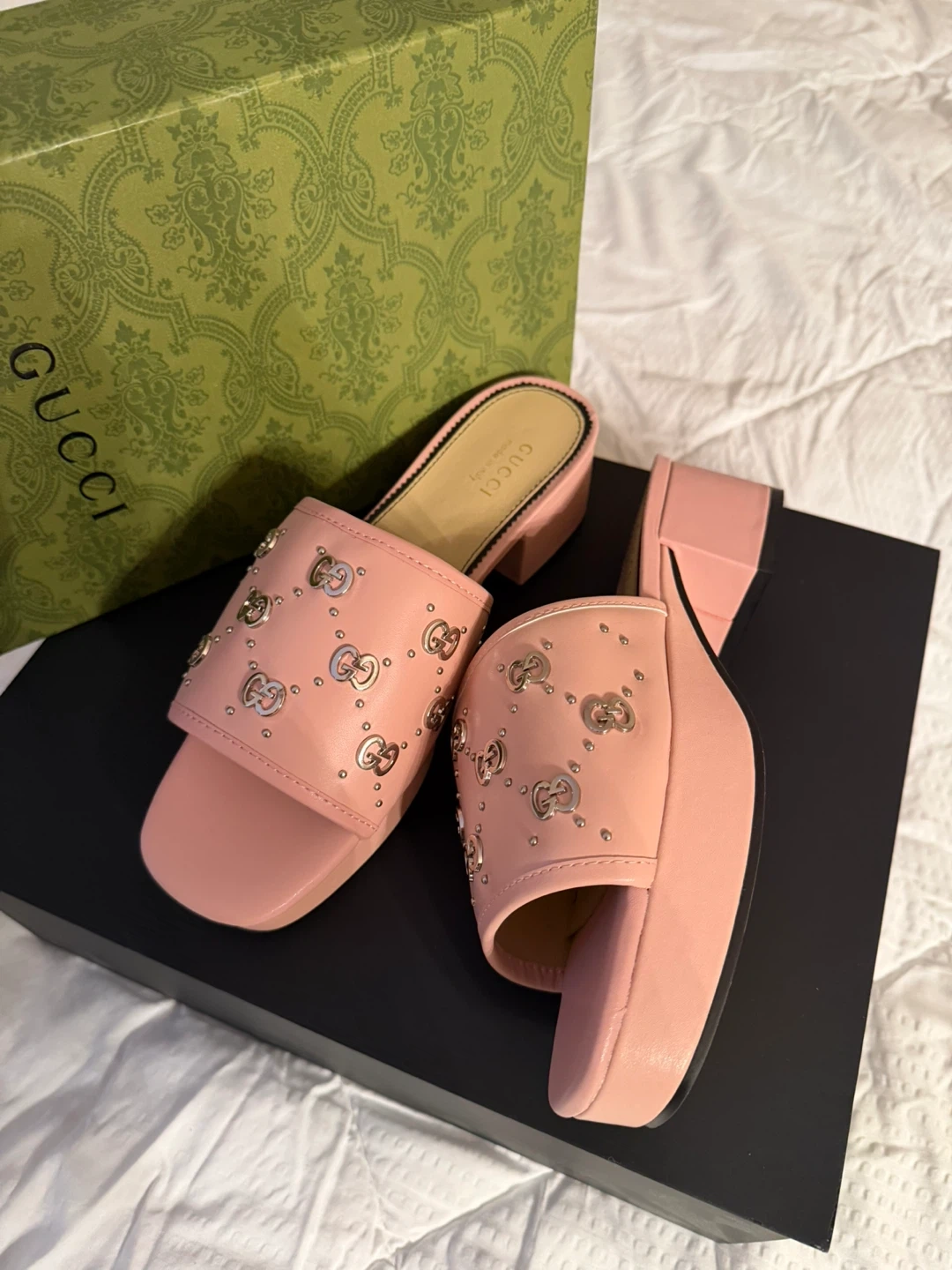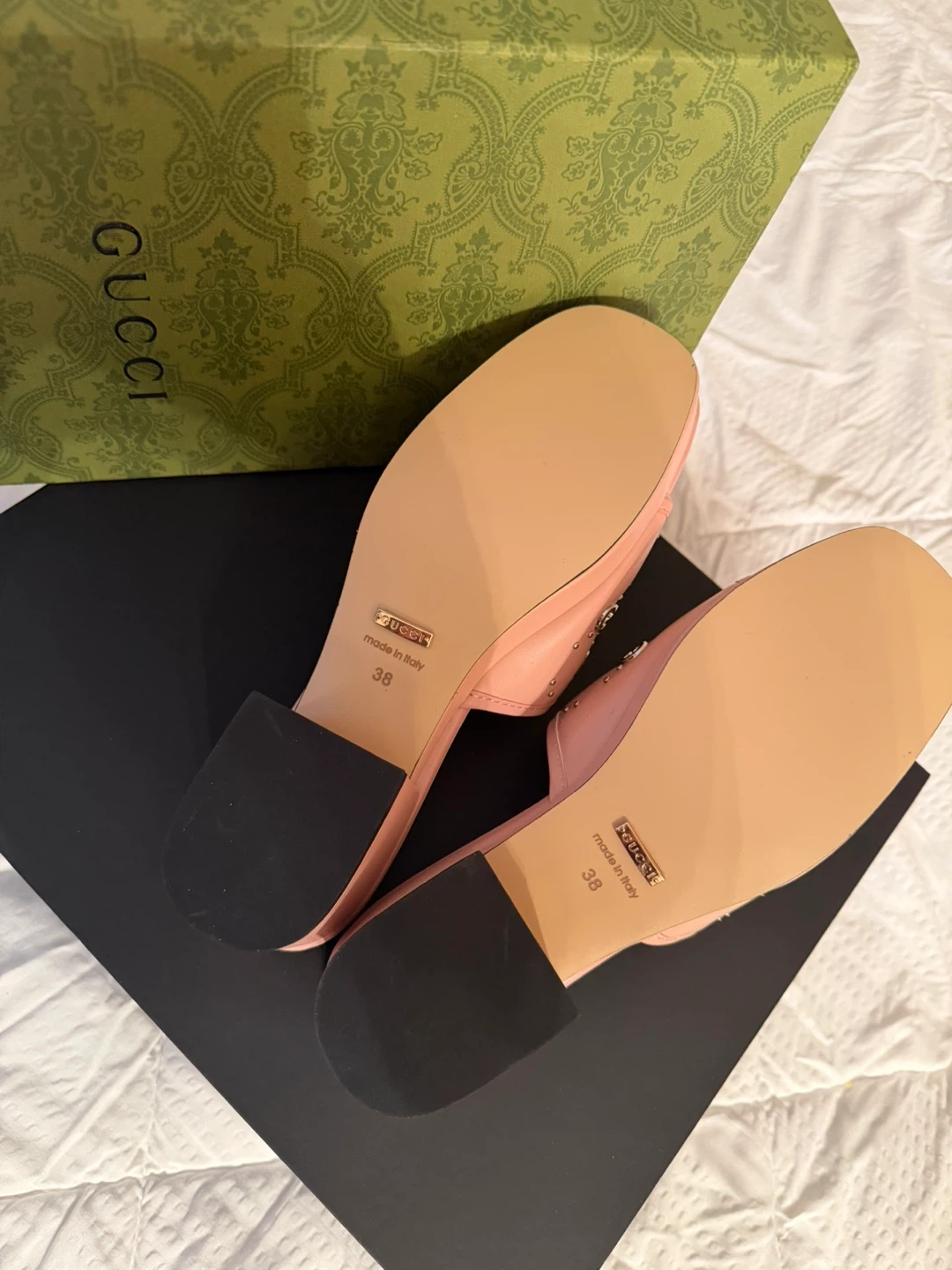 These adorable Gucci slides are perfect for adding a touch of luxury to your everyday look! They feature a beautiful pink leather with studded detailing. The size is 38. Comes with the original box!