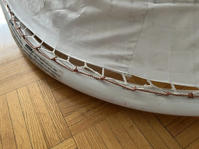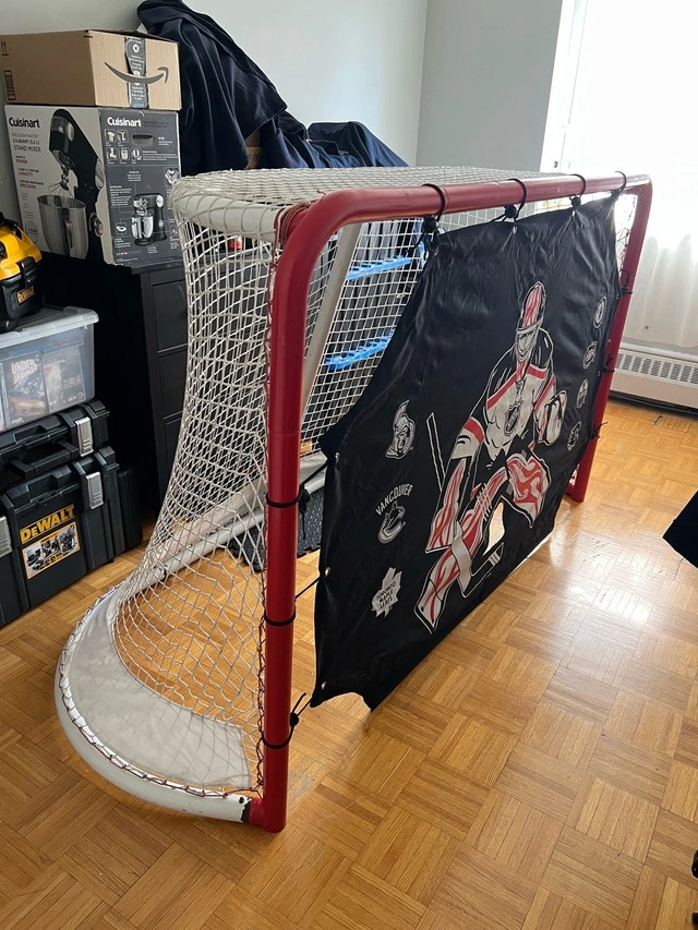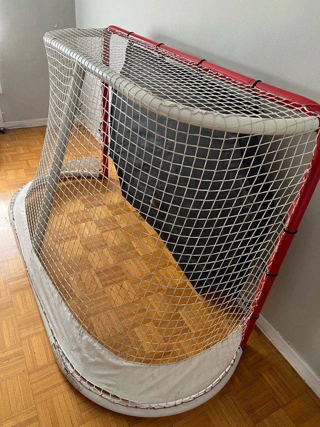 Excellent strong and full assembly! Few rusty from snow wet, hockey net pole heavy duty steel. Hockey shooter target board included. Hockey net mesh excellent! I decide to sell it because we moved to apartment from old townhouse place. Thank you