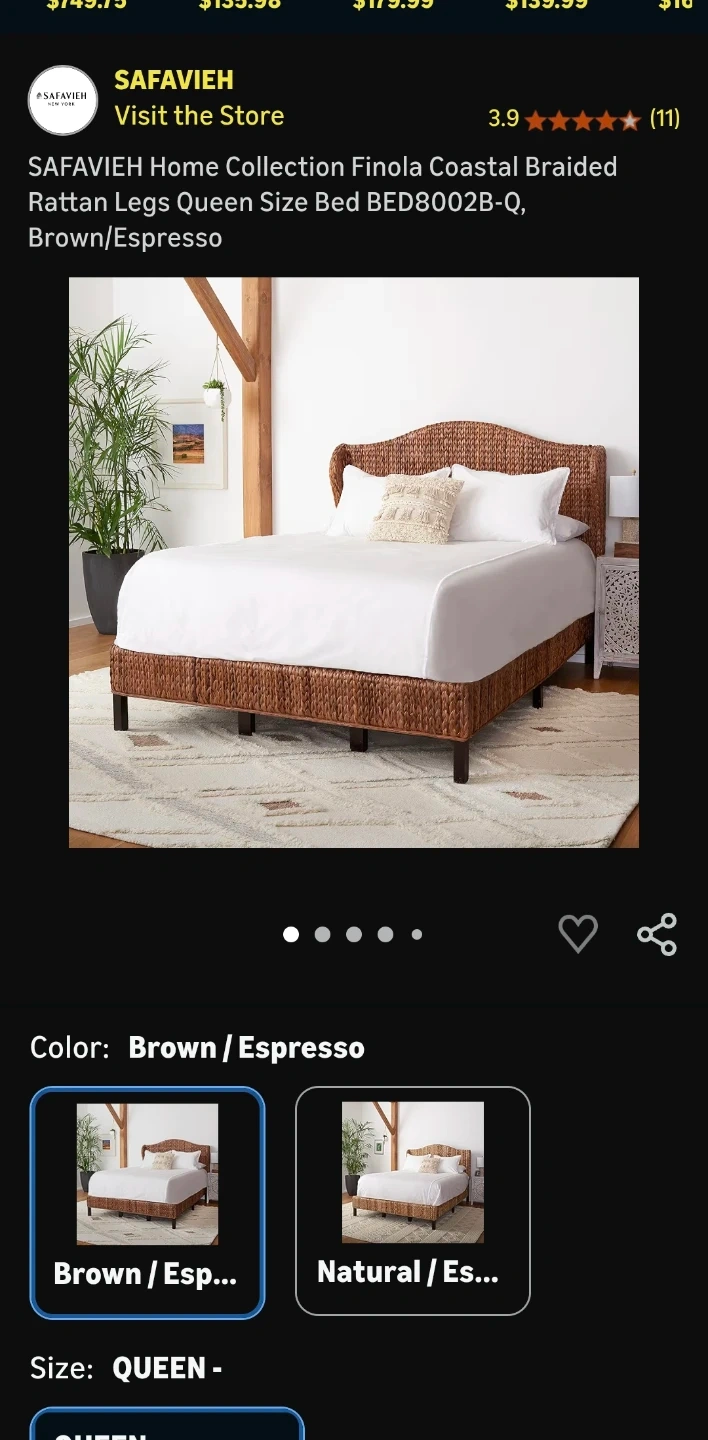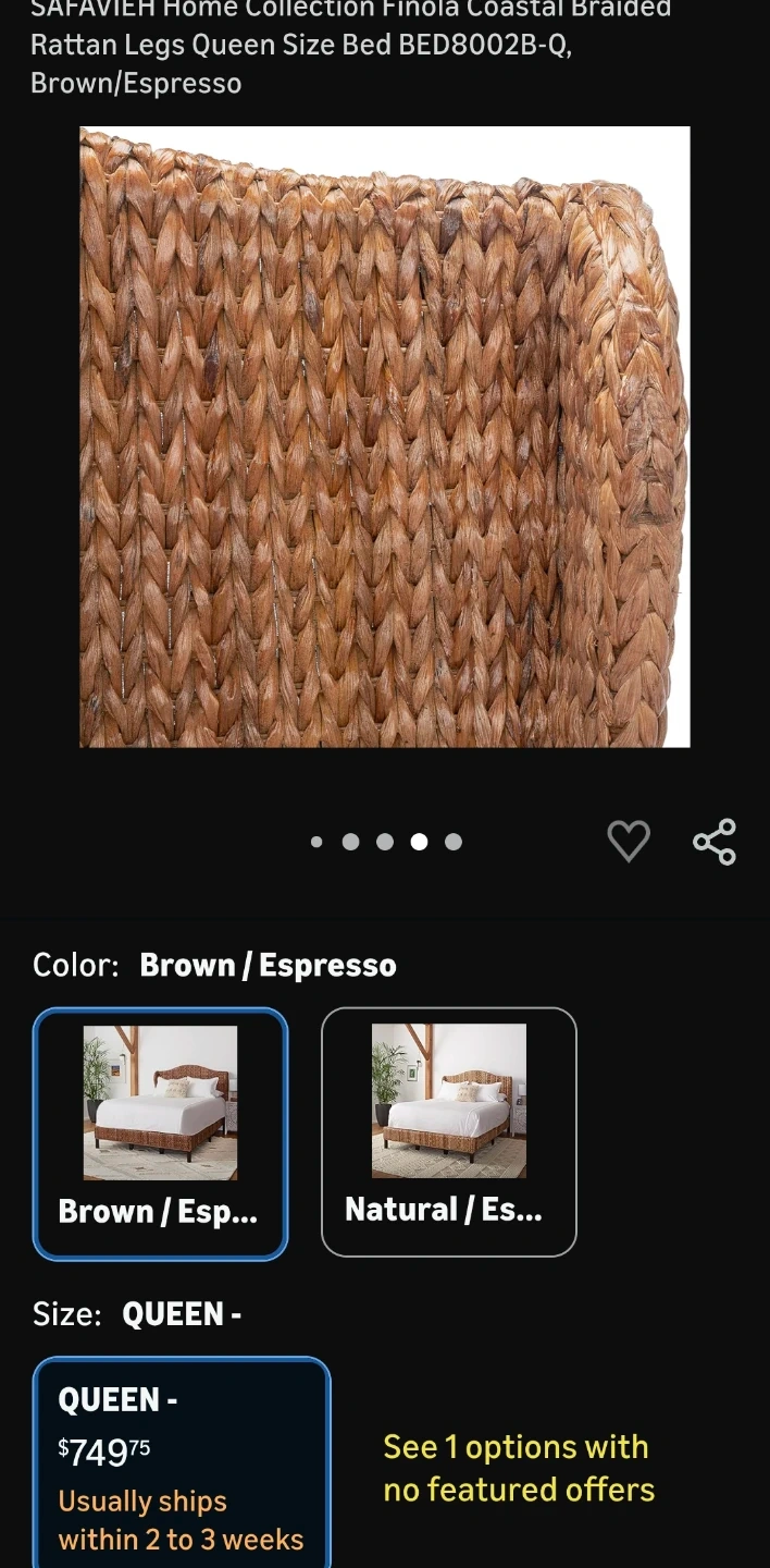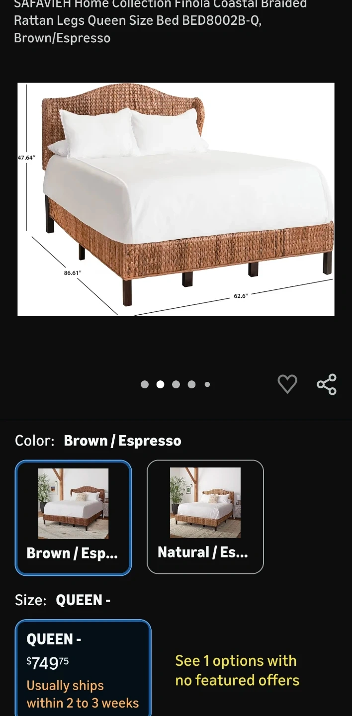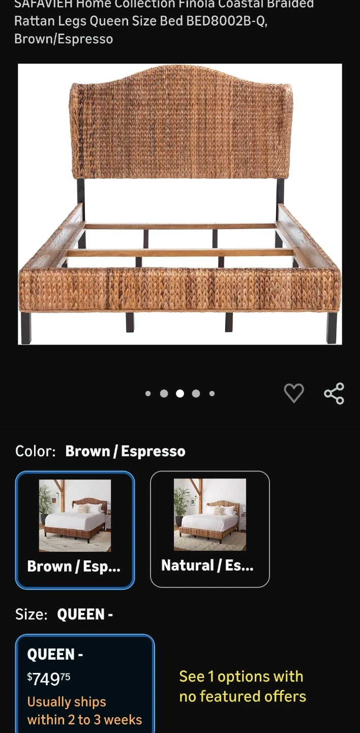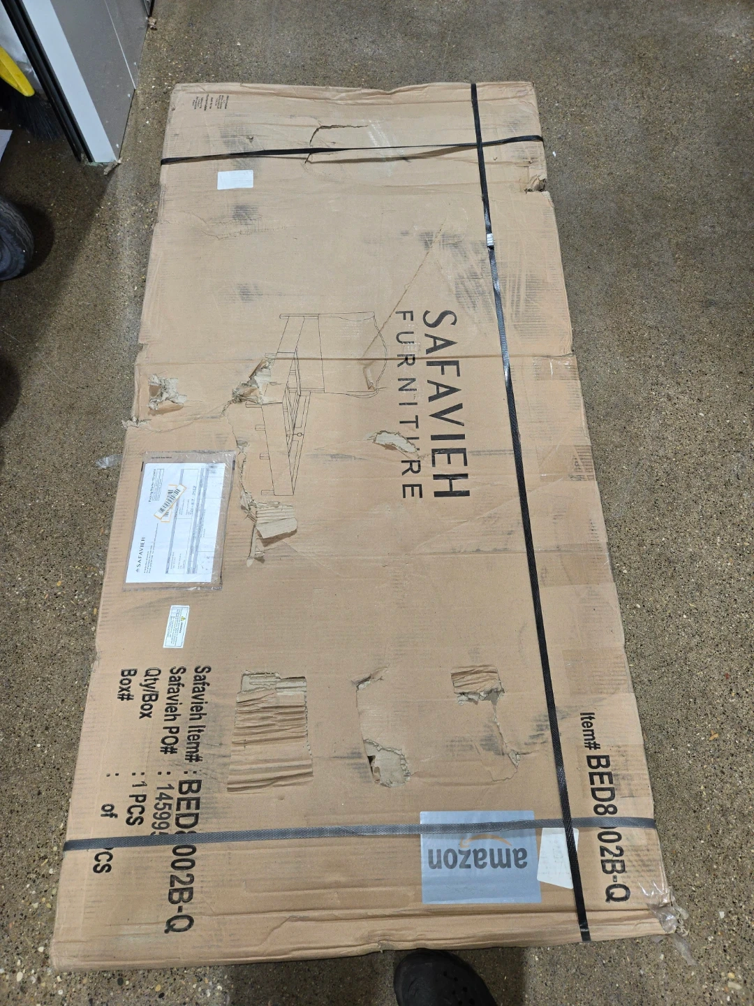 Selling a brand new, still in the box, SAFAVIEH Home Collection Finola Coastal Braided Rattan Legs Queen Size Bed (BED8002B-Q) in Brown/Espresso. This queen-sized bed will add a touch of coastal charm to your bedroom!