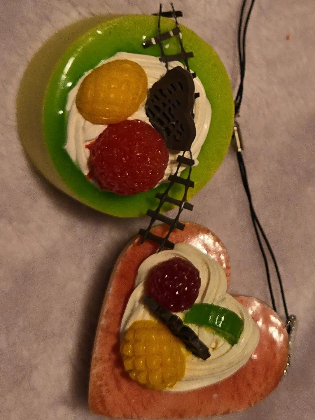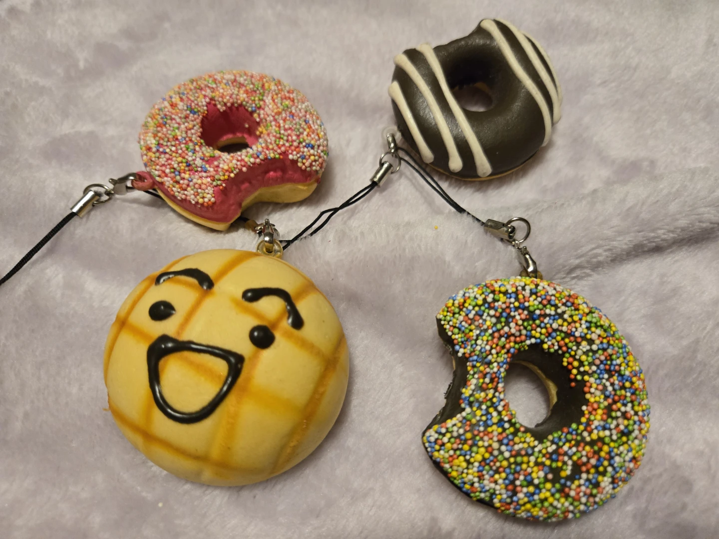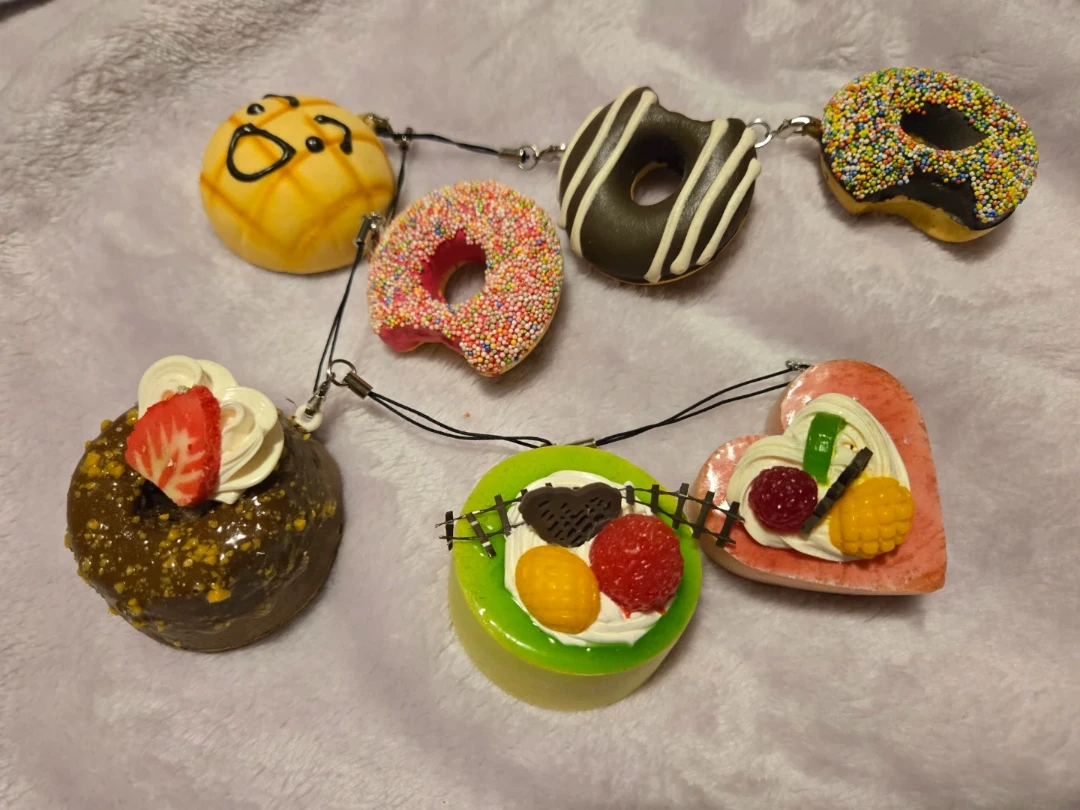 A collection of squishy cute cake and donut keychains! They are in great condition and ready to add some fun to your keys or bag.