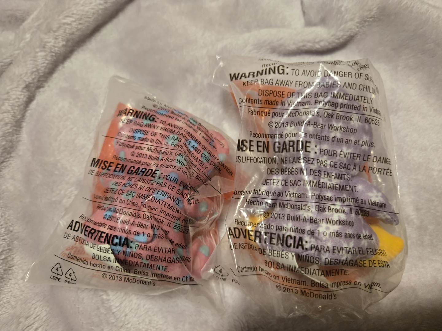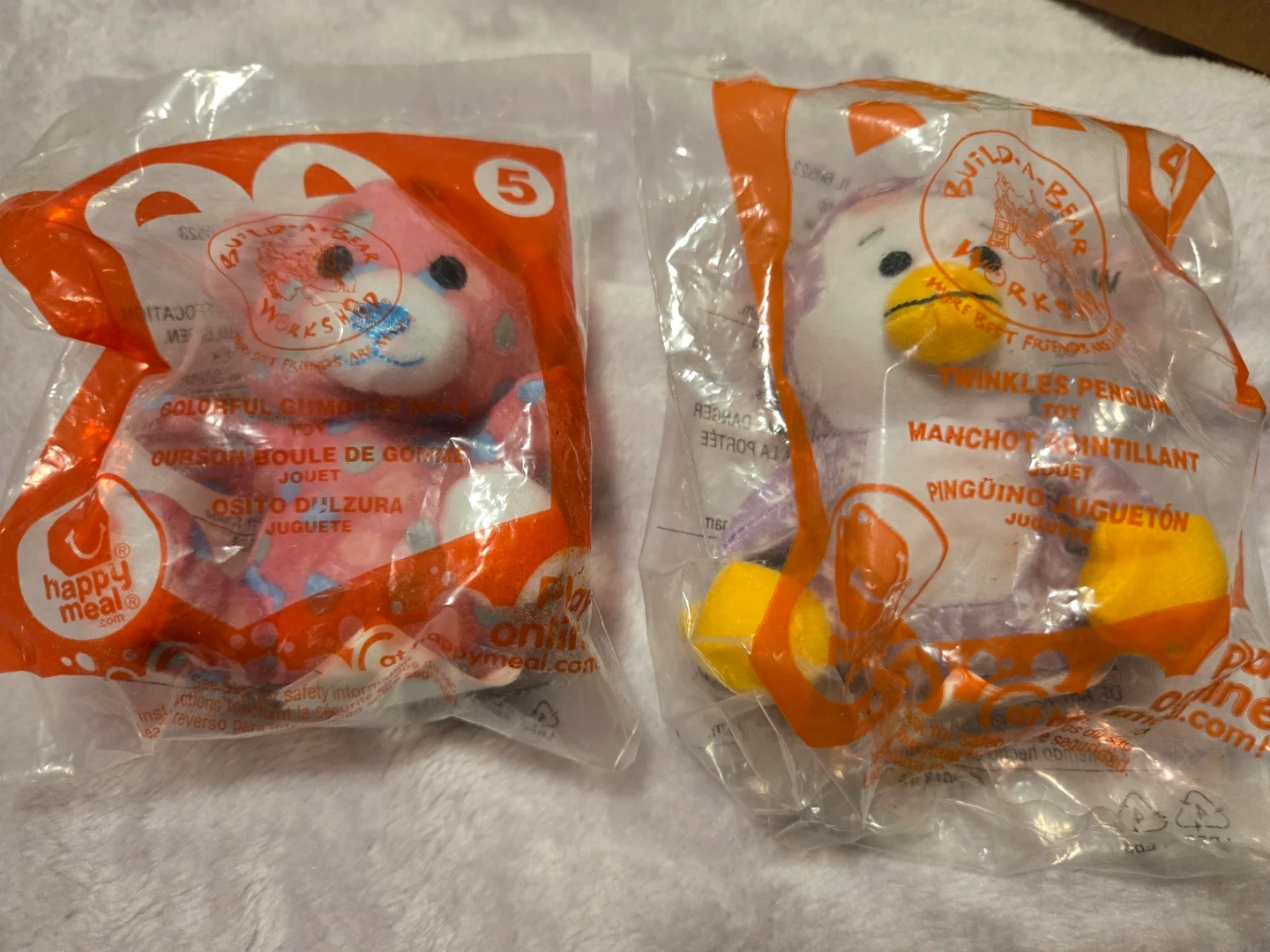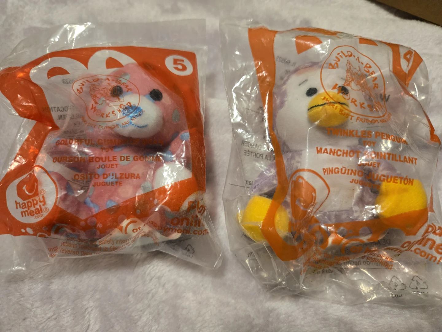 Two new Build-A-Bear Workshop toys from McDonald's Happy Meals. One is a colourful gummy bear and the other is Twinkles the Penguin. Both are still sealed in their original packaging!