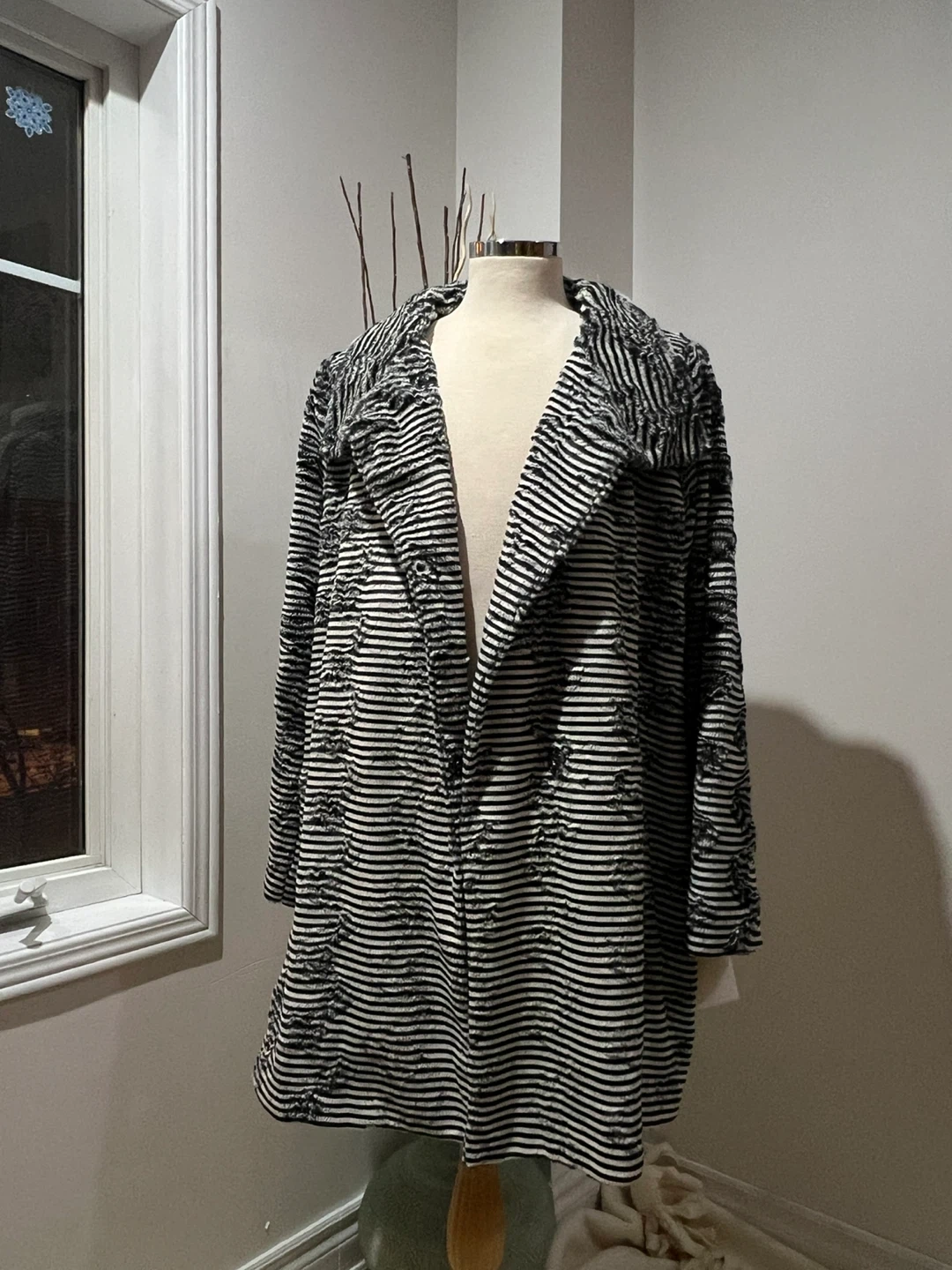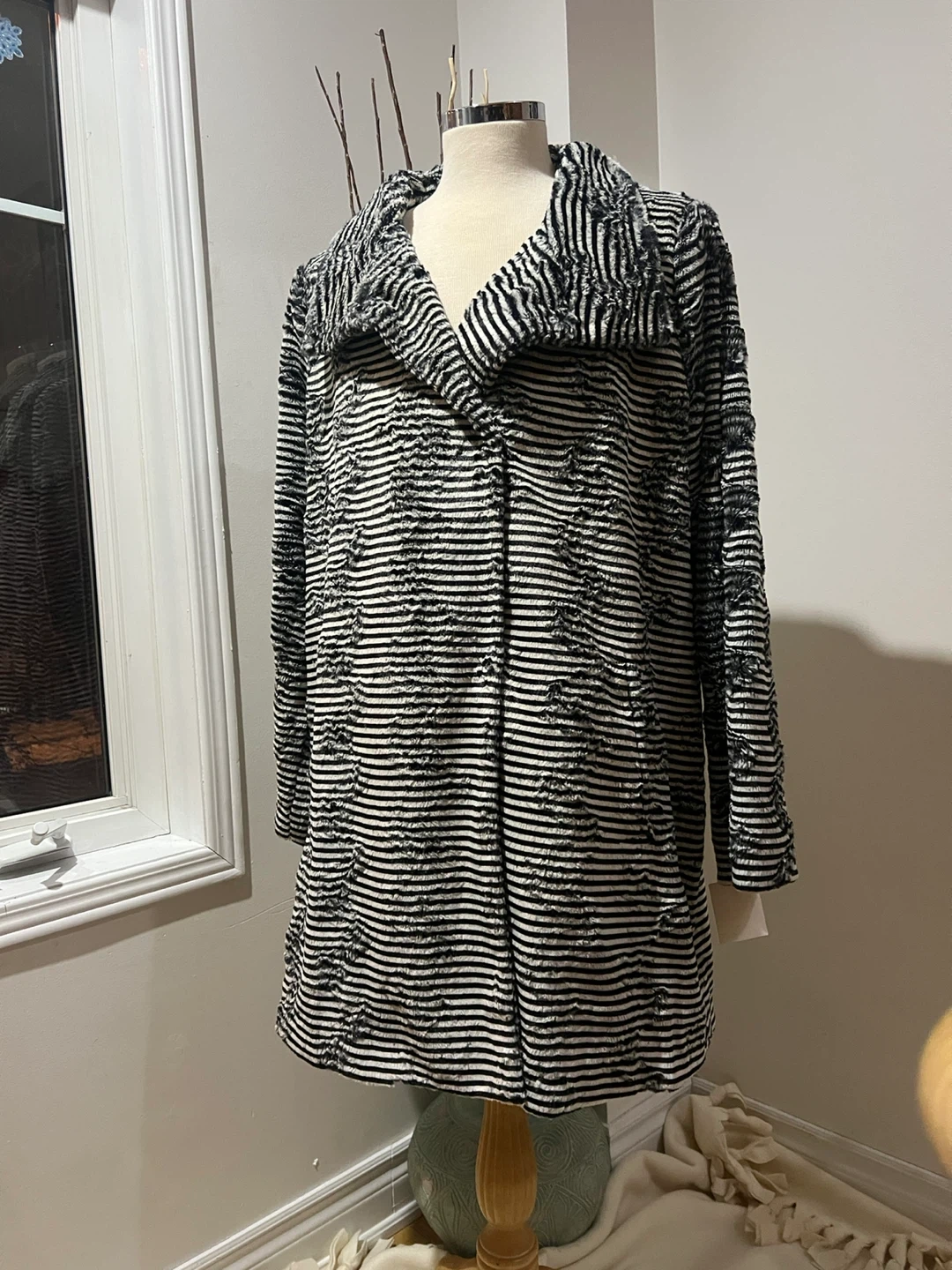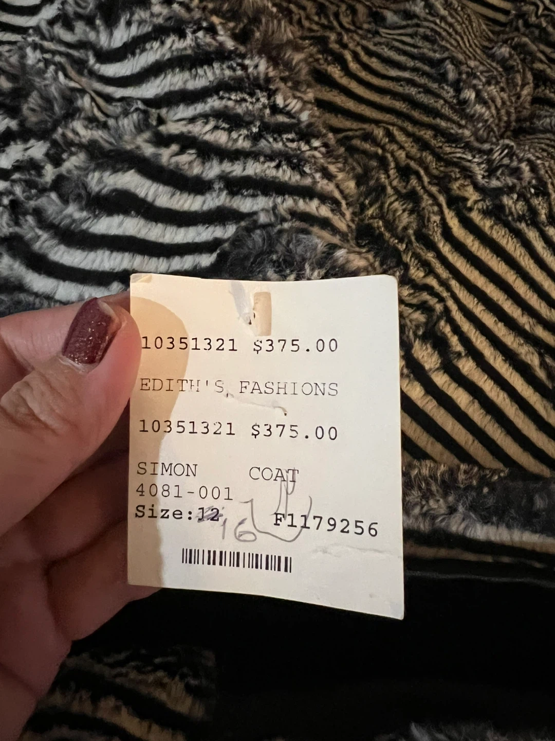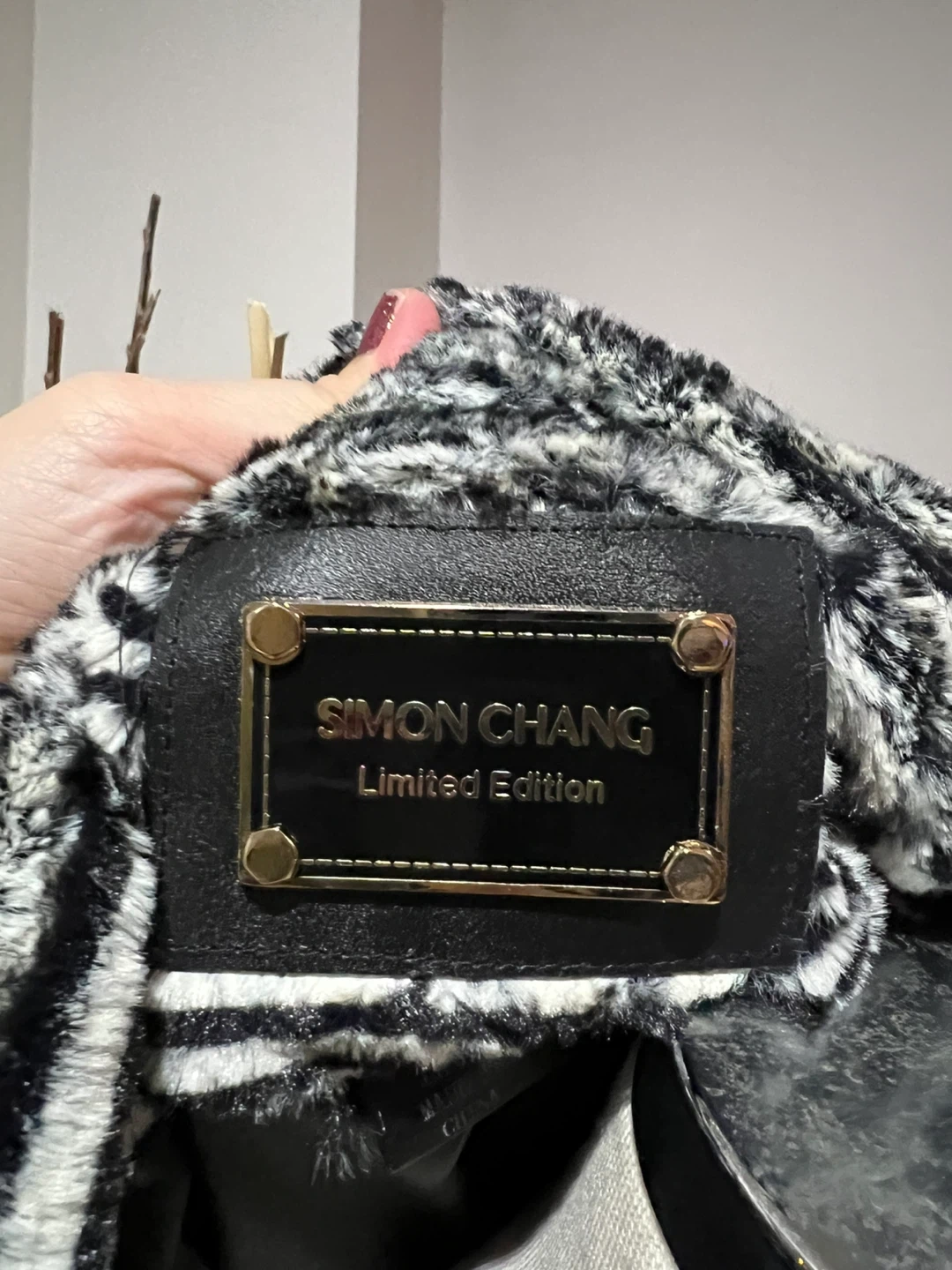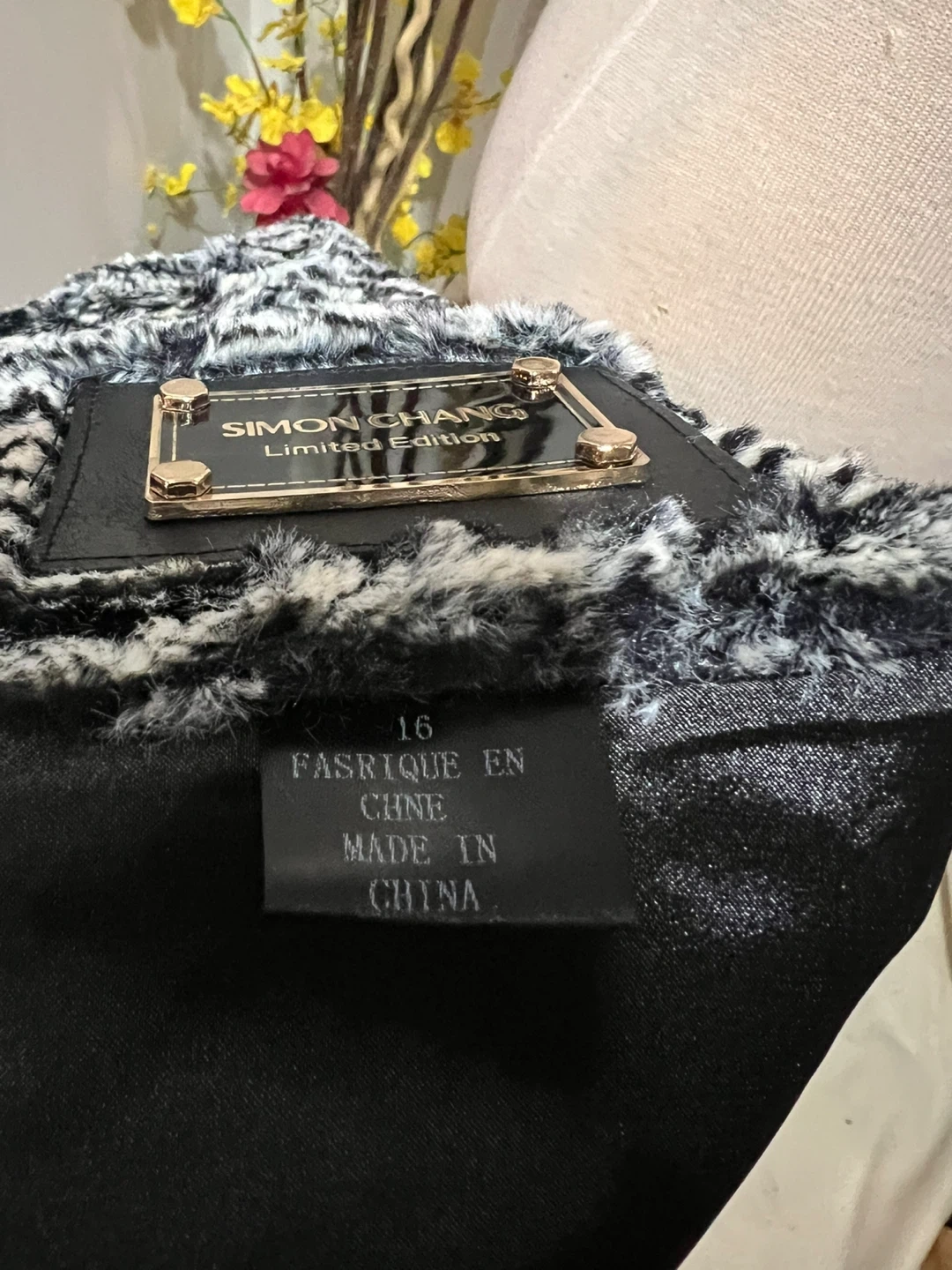 This is a Simon Chang Limited Edition coat in a size 16. It's a unique piece with a distinctive pattern. Originally bought for $375. Never been used.
