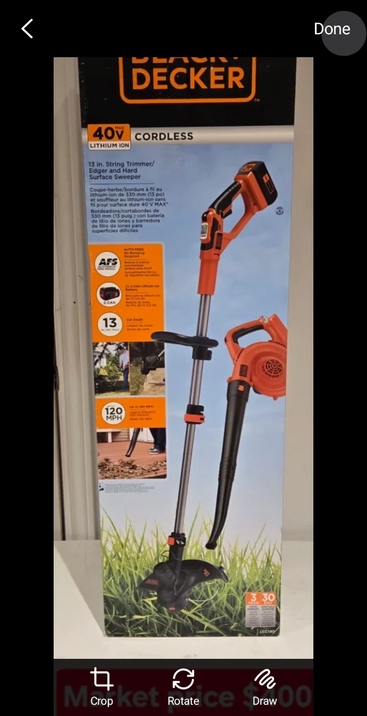 Selling a Black+Decker 40V cordless 13-inch string trimmer, edger, and hard surface sweeper! It features auto feed and can blow up to 120 mph. It comes with a 2.0Ah lithium-ion battery
