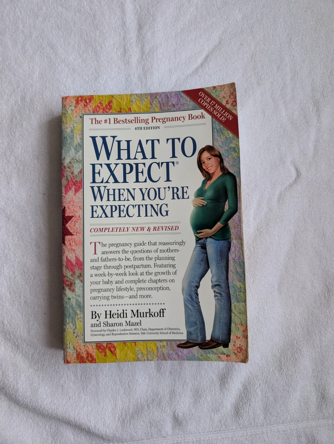 This is a used copy of "What to Expect When You're Expecting", 4th Edition, a comprehensive pregnancy guide. It reassuringly answers questions for mothers and fathers-to-be, covering everything from the planning stage through postpartum, with a week-by-week look at your baby’s growth and chapters on pregnancy lifestyle, preconception, carrying twins, and more.