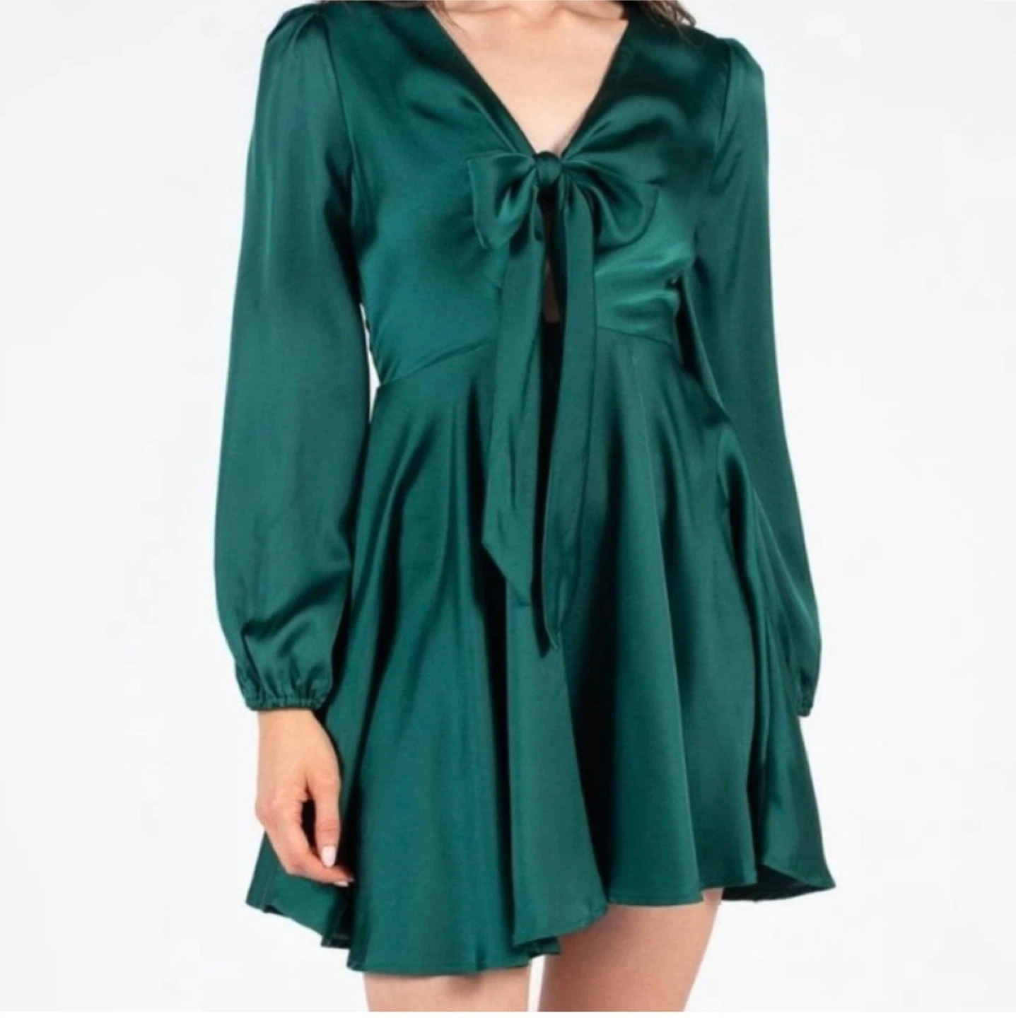 This elegant green satin dress features a flattering fit and a stylish bow detail