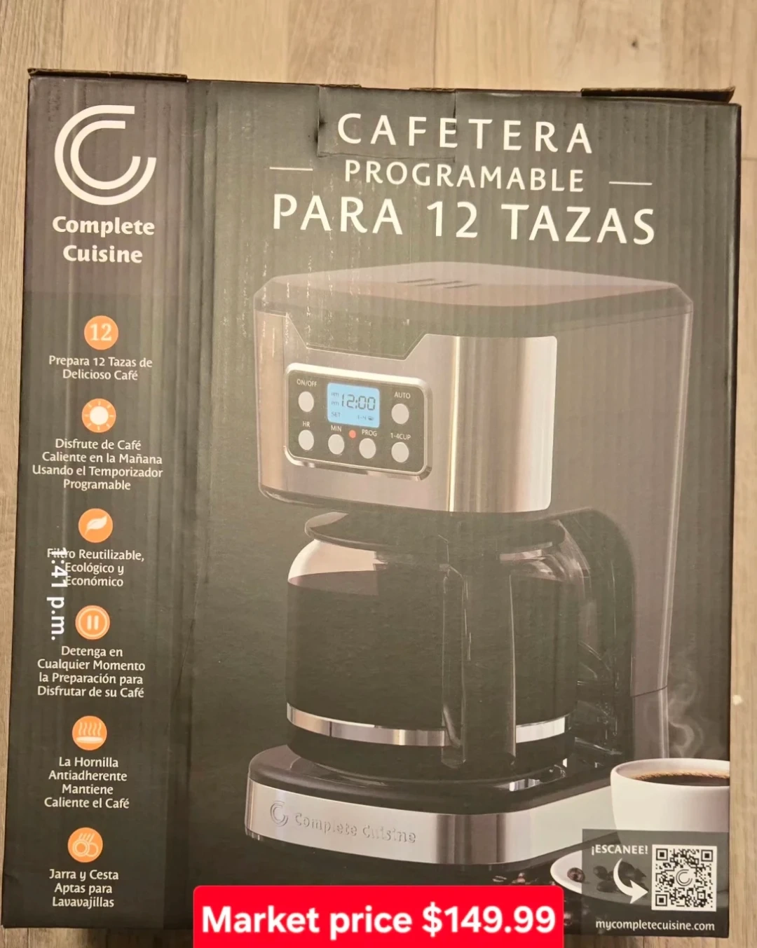 Selling a Complete Cuisine coffee maker that brews up to 12 cups. It's in excellent condition and comes with the box. It features a reusable filter and a non-stick warming plate to keep your coffee hot. I bought this for $149.99