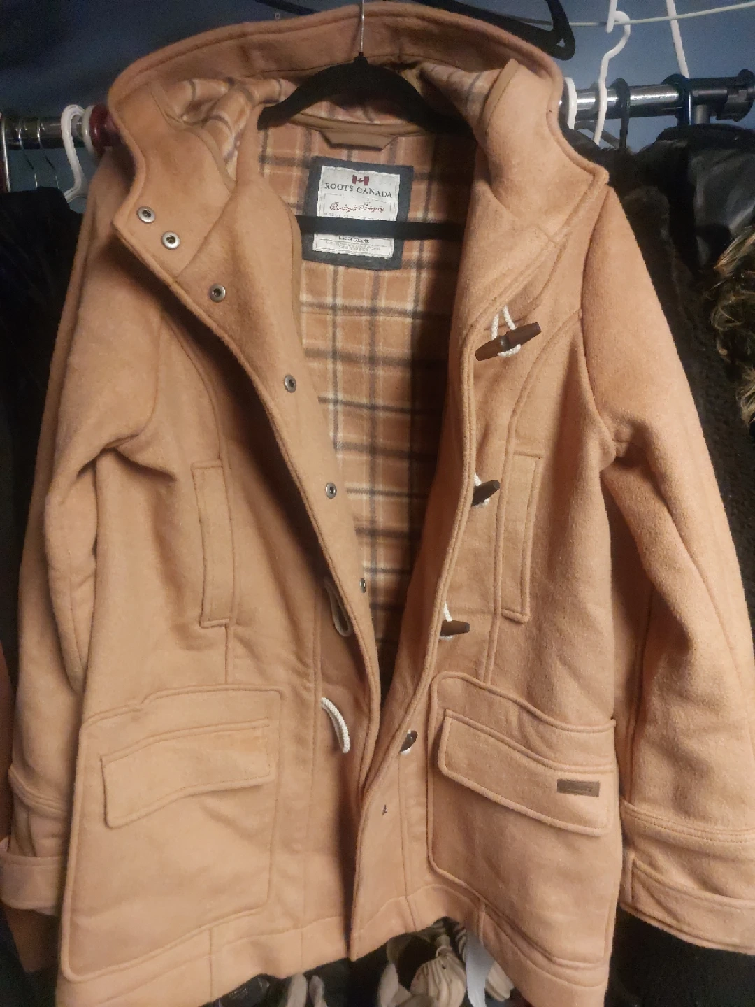 Roots Canada duffle coat in a tan colour. Great for keeping warm during the cooler months. The coat has a hood and toggle closures. It's in great condition and ready for a new owner! Size LG