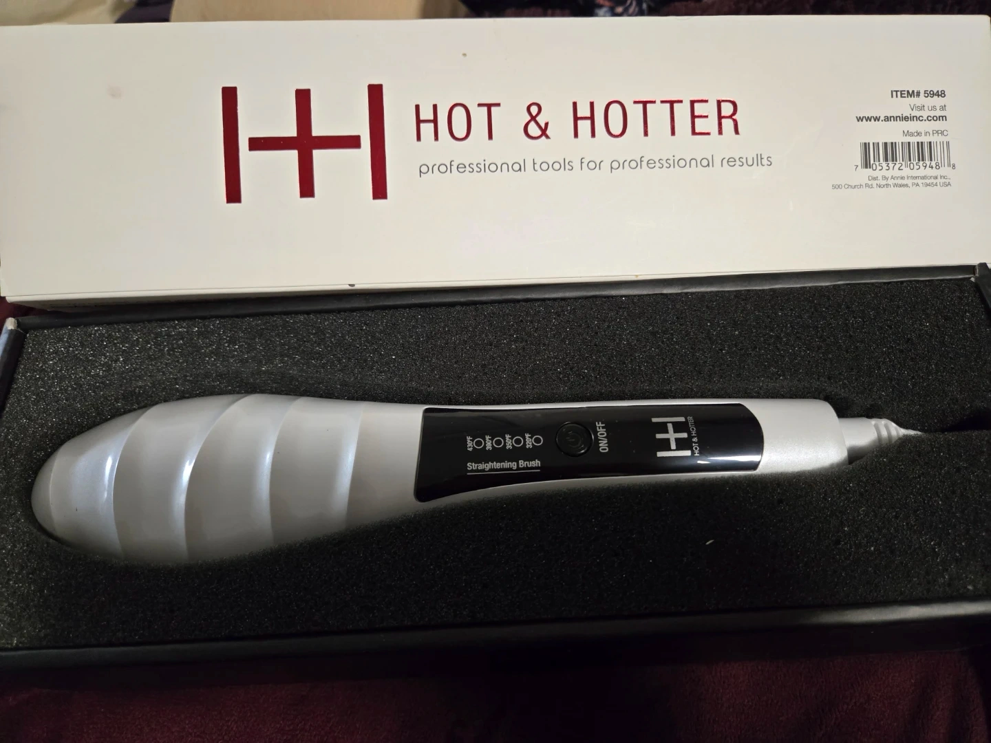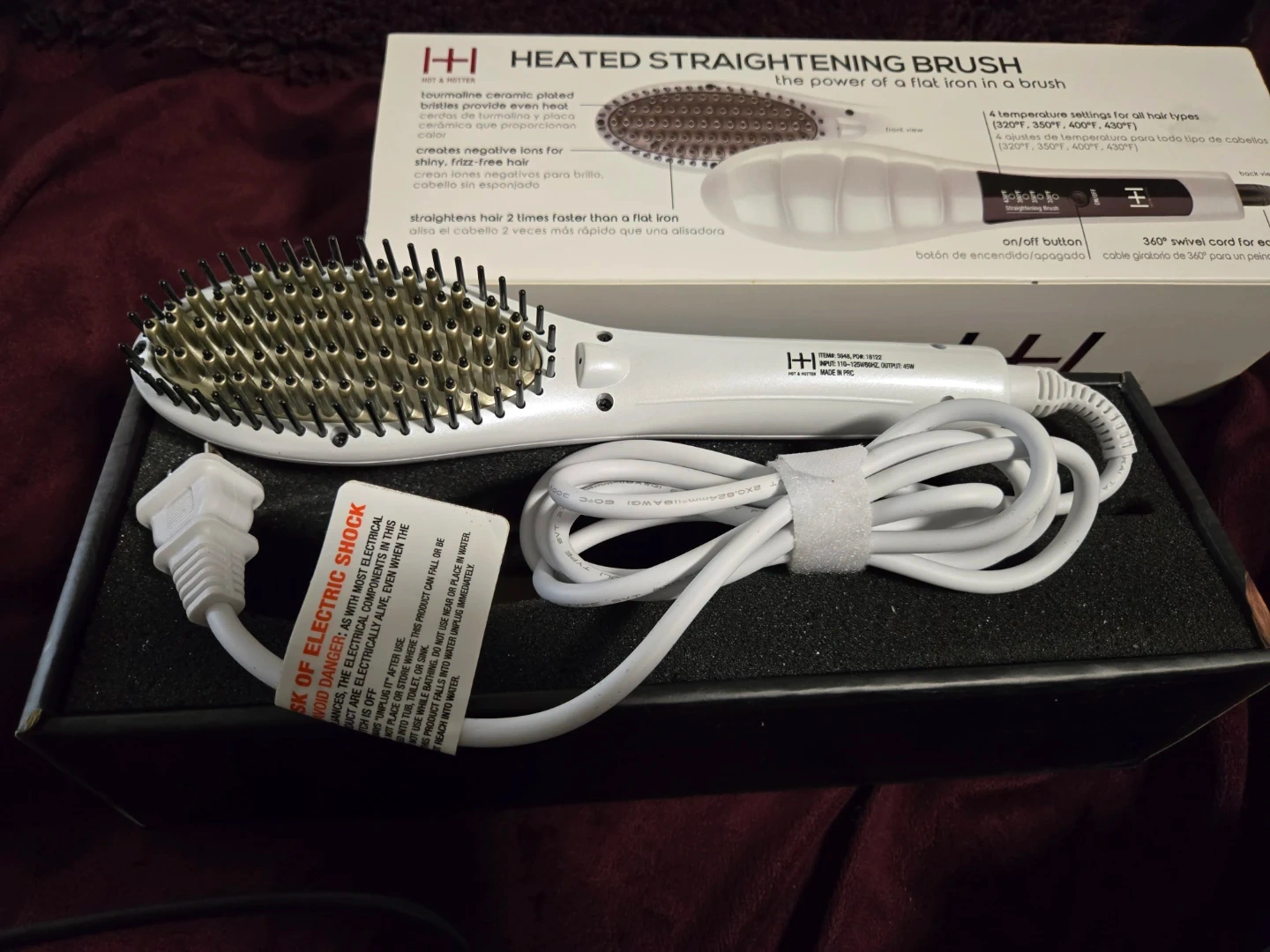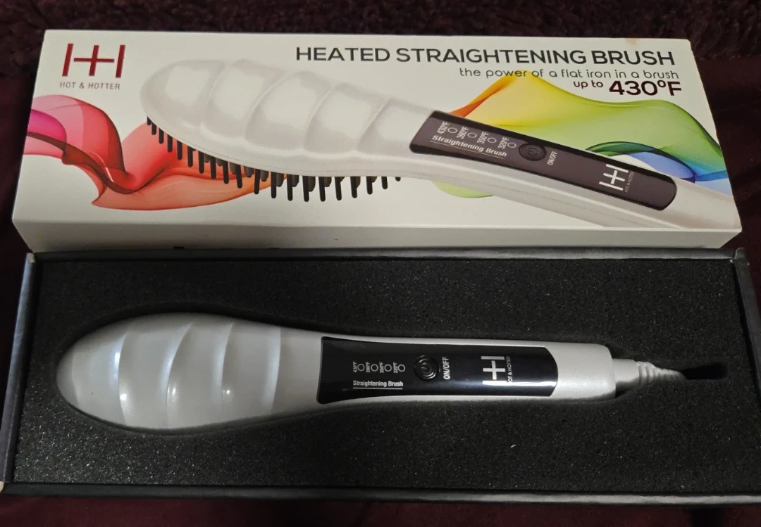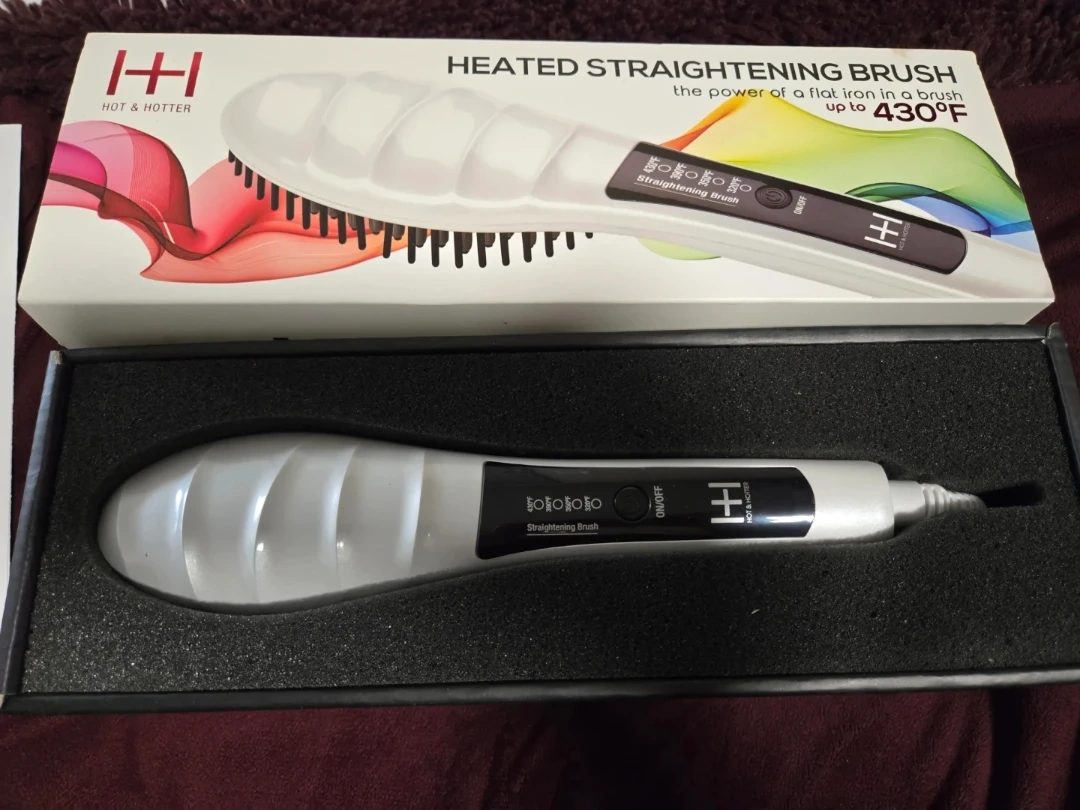 Selling a Hot & Hotter Heated Straightening Brush! It's in brand new condition in orginal packaging. This brush can heat up from 4 levels from 320 to 430°F. It has tourmaline ceramic plated bristles that provide even heat for shiny, frizz-free hair. It also has a 360° swivel cord for easy use. It straightens hair 2 times faster than a flat iron.