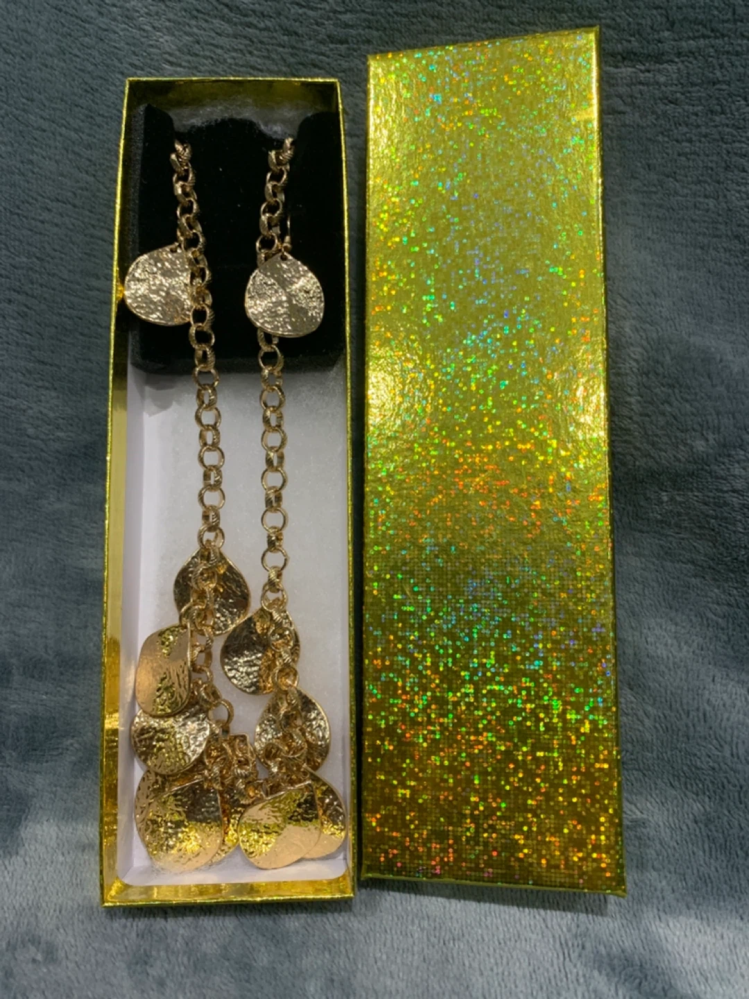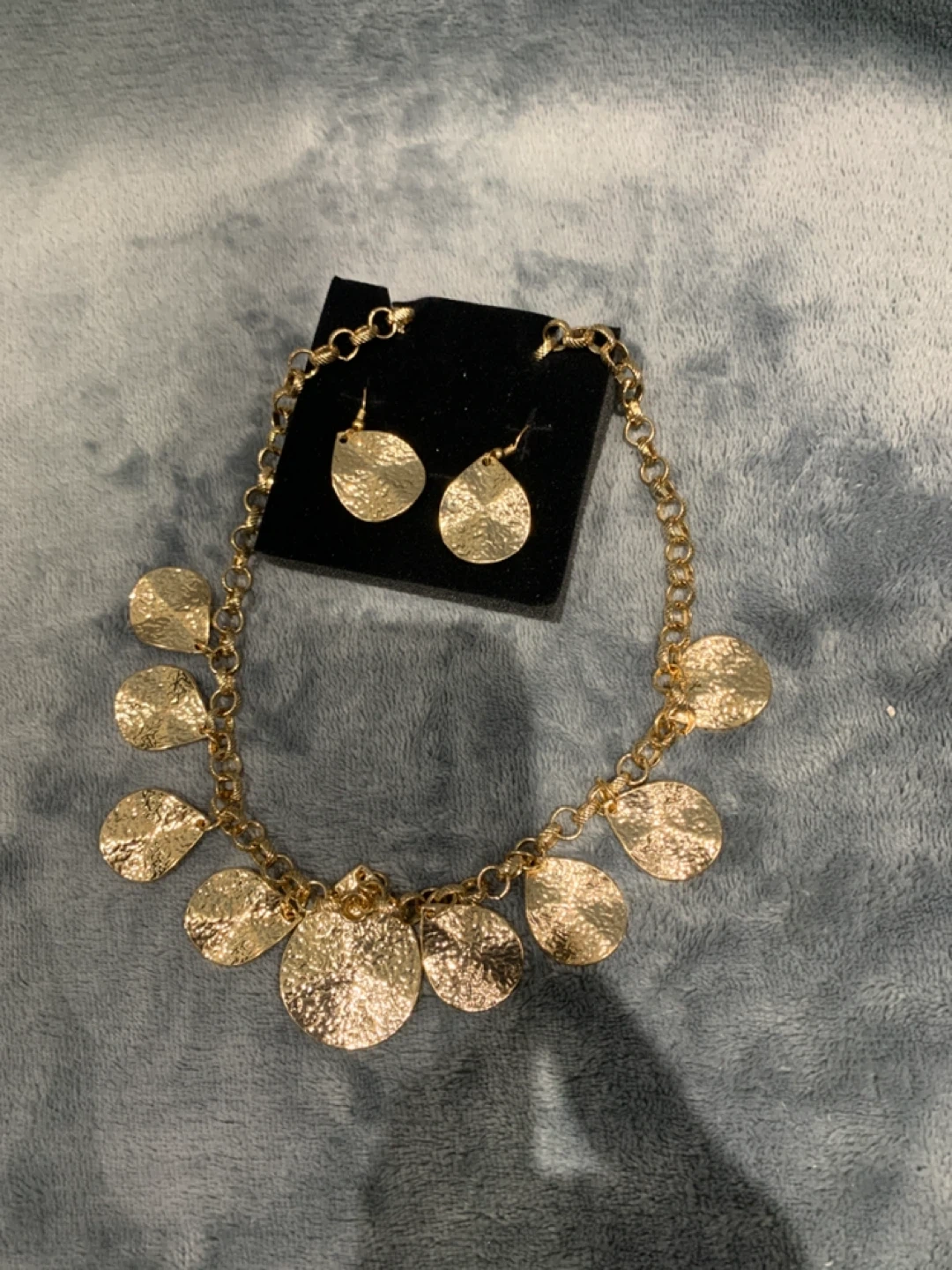 Here's a lovely gold-tone necklace and earring set! The set comes in a box, perfect for gifting or keeping it safe. The necklace has a unique design with textured, disc-shaped pendants. The earrings match, completing the set for a coordinated look