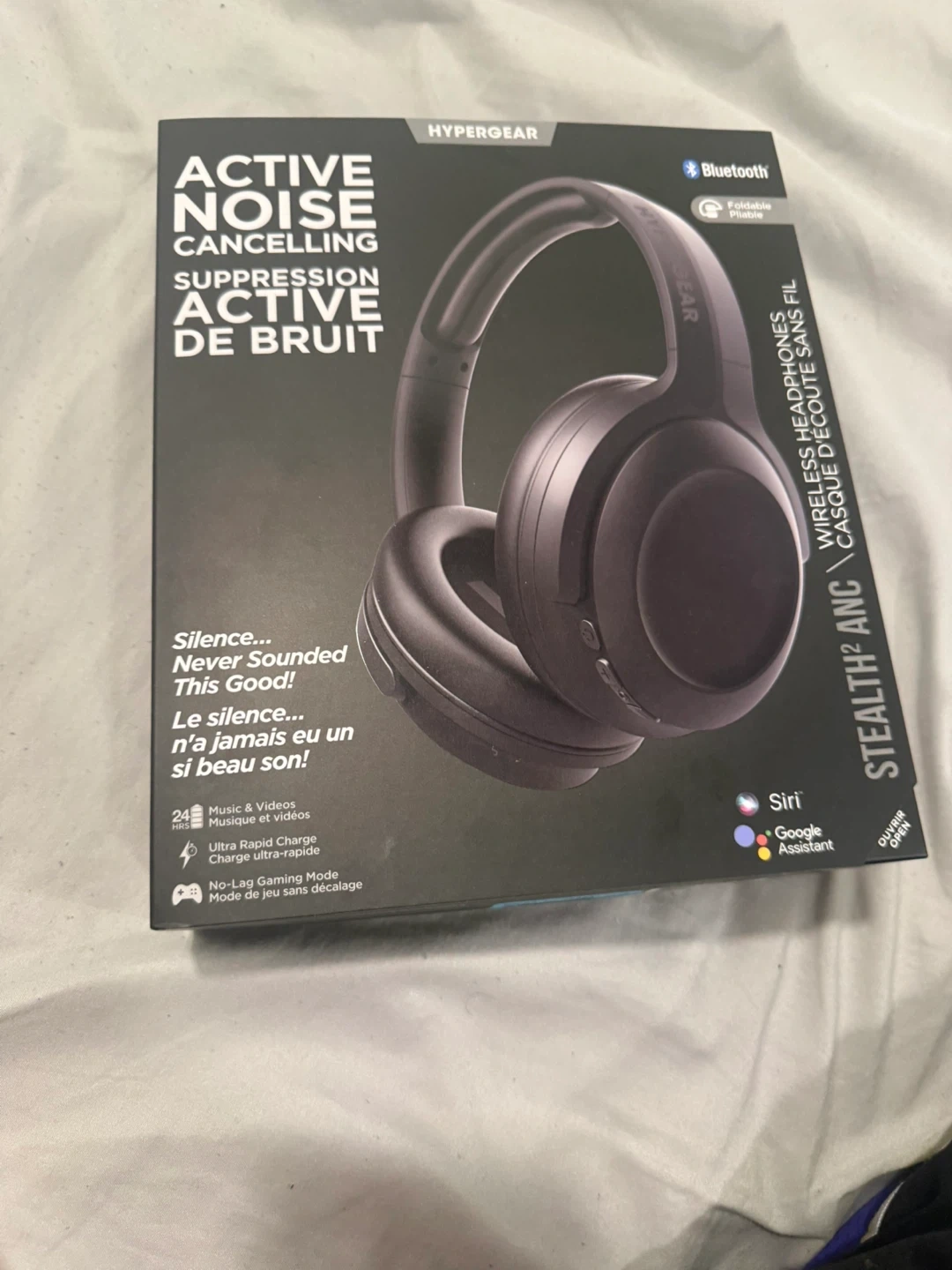 Selling a brand new pair of Hypergear Stealth2 ANC wireless headphones! The box includes the headphones themselves, ready for you to enjoy active noise cancelling and high-quality sound. These headphones feature Bluetooth connectivity and a foldable design for easy portability. They also have ultra-rapid charging and a no-lag gaming mode for an immersive experience