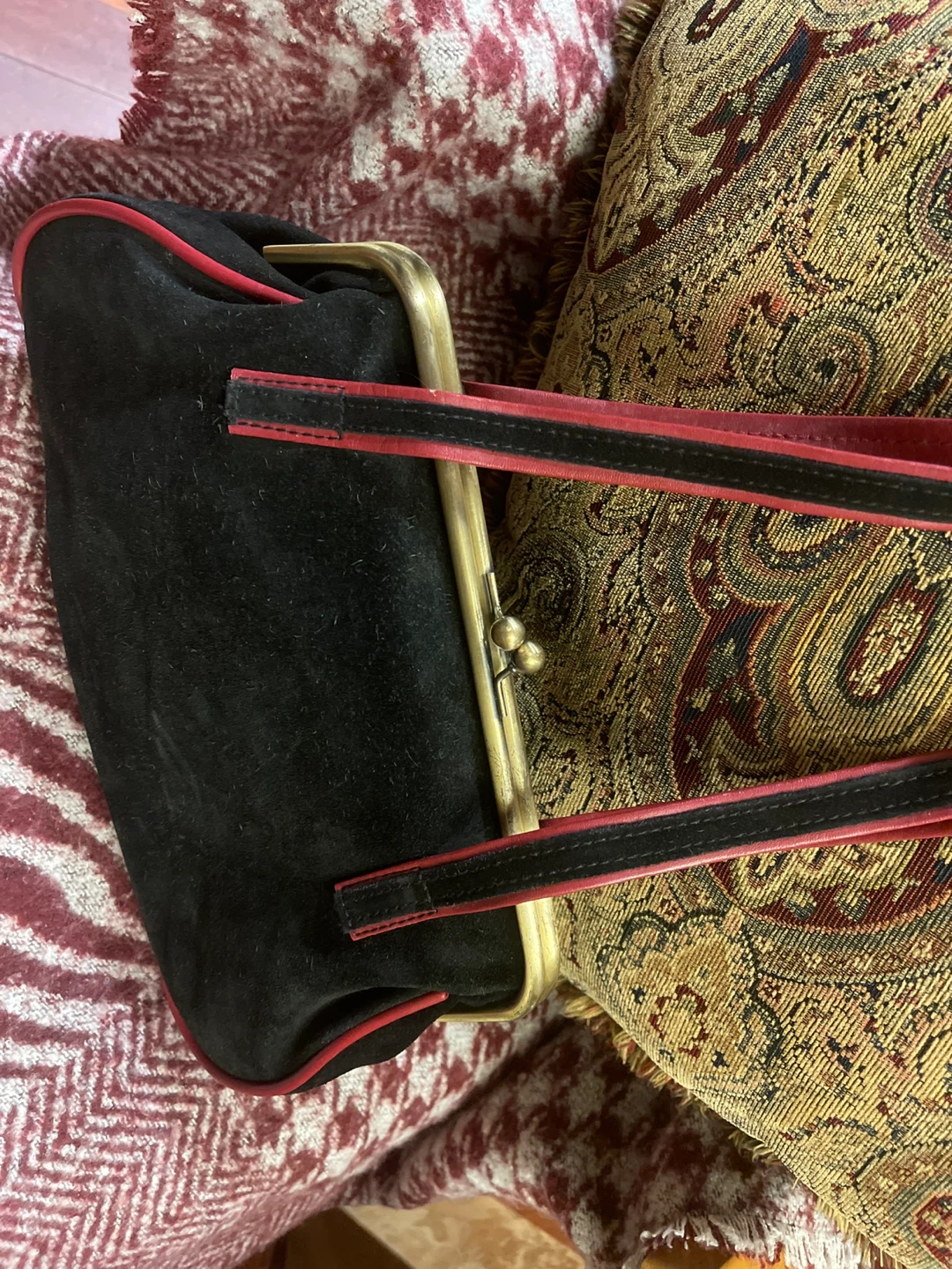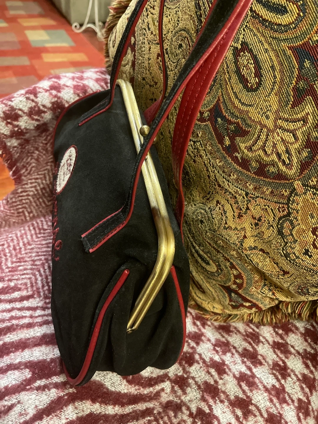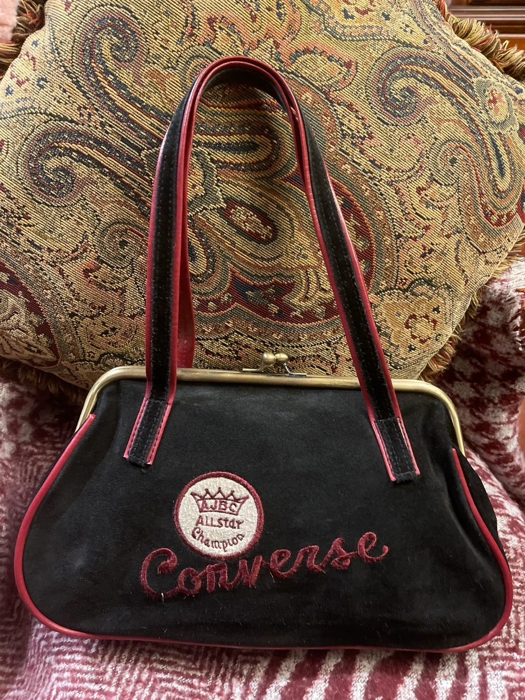 Here's a stylish Converse handbag in black with red trim! It has a unique clasp closure and a classic design. Perfect for adding a touch of vintage flair to your outfit