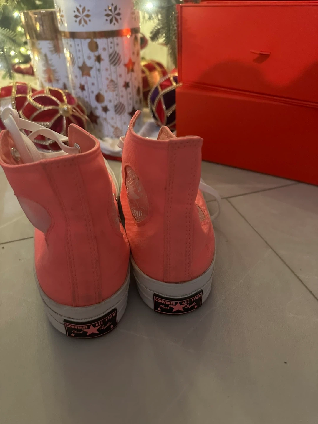 Selling a pair of Converse All Star high top sneakers in a vibrant pink colour! They show some signs of wear, but still have lots of life left in them. Perfect for adding a pop of colour to your outfit!
