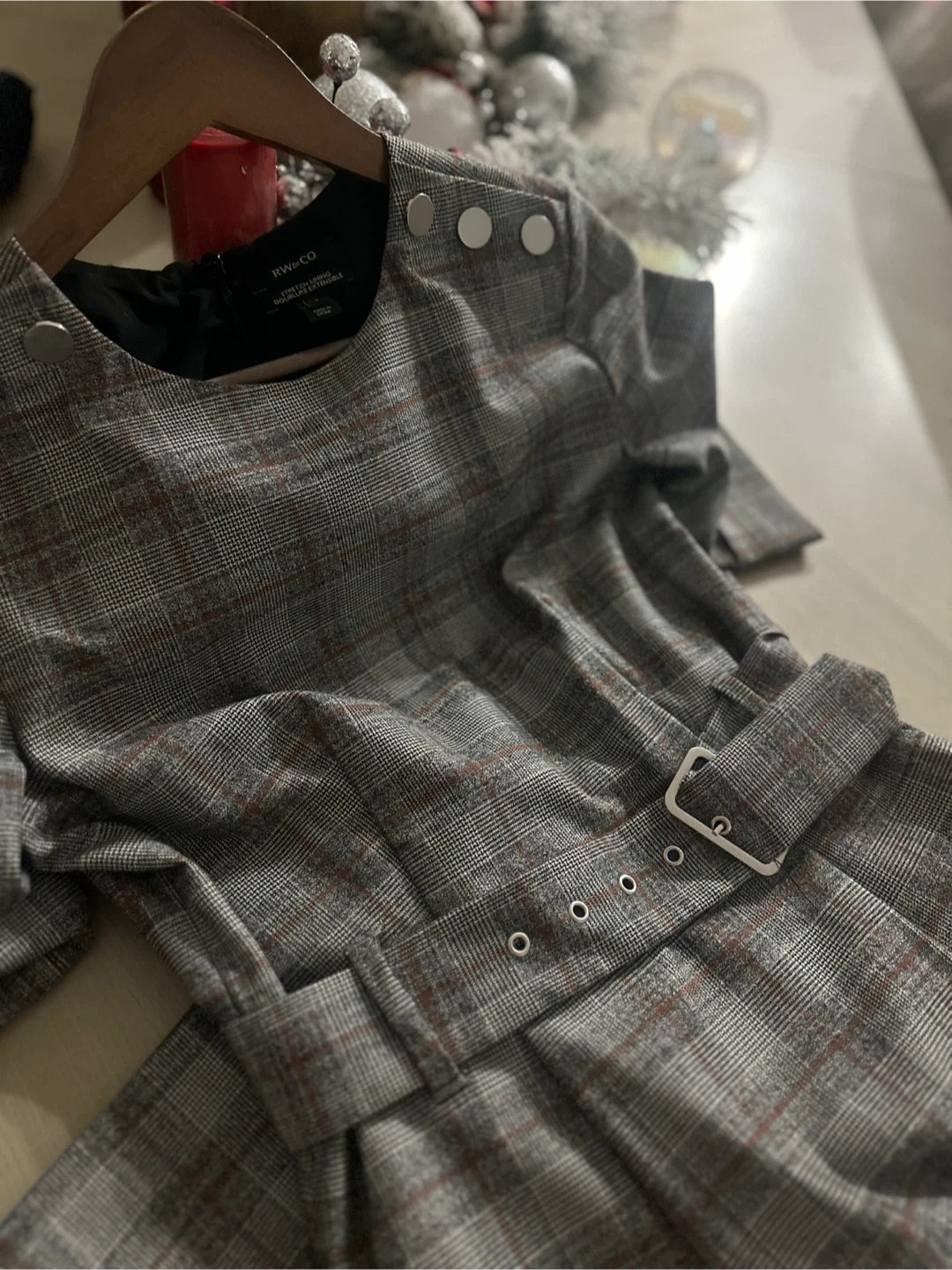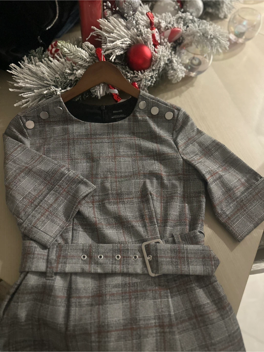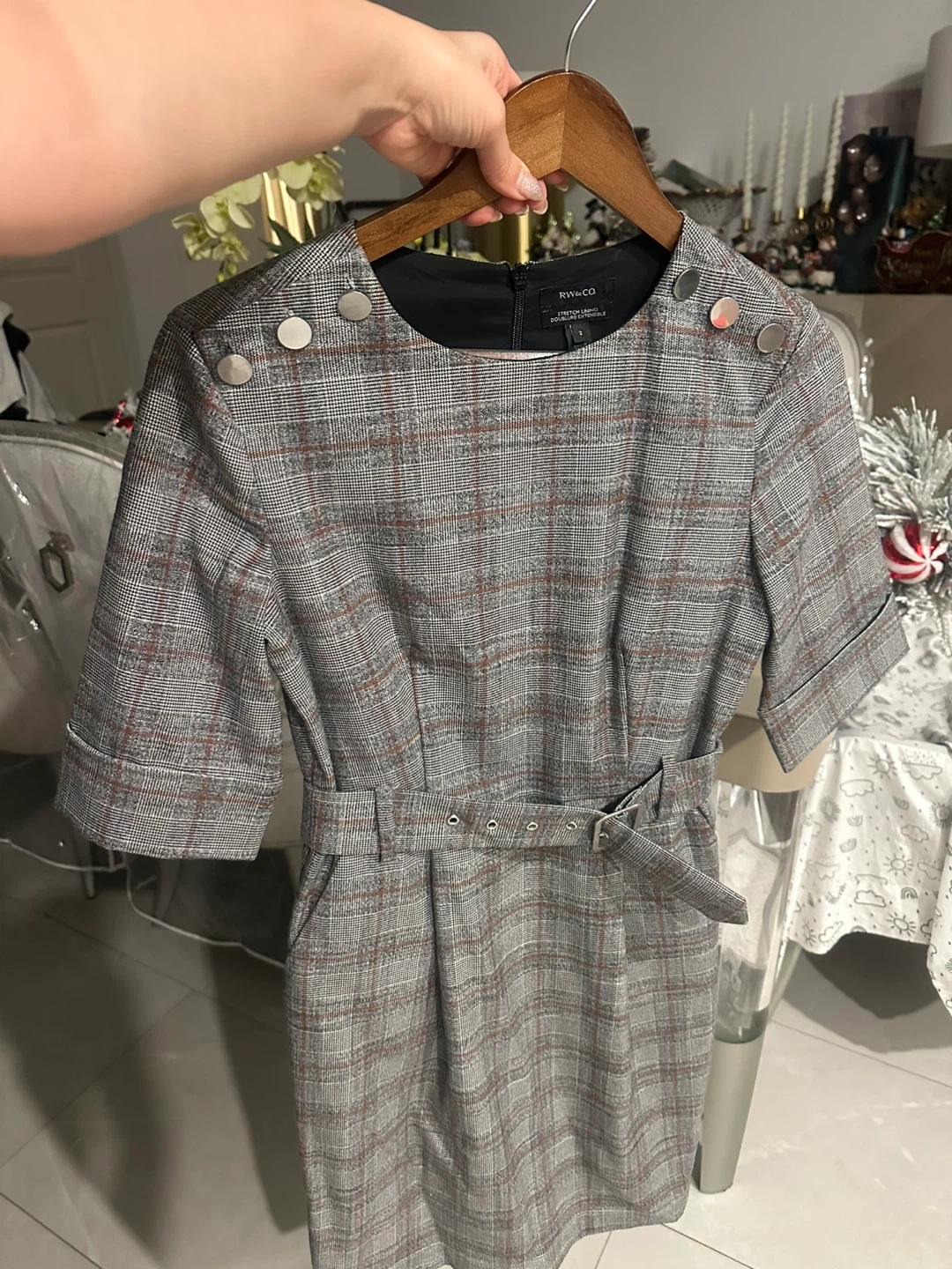 Selling a cute RW&CO dress! It's a size 2 and has a stylish plaid pattern. The dress features a belt and button details on the shoulders. Perfect for work or a special occasion!