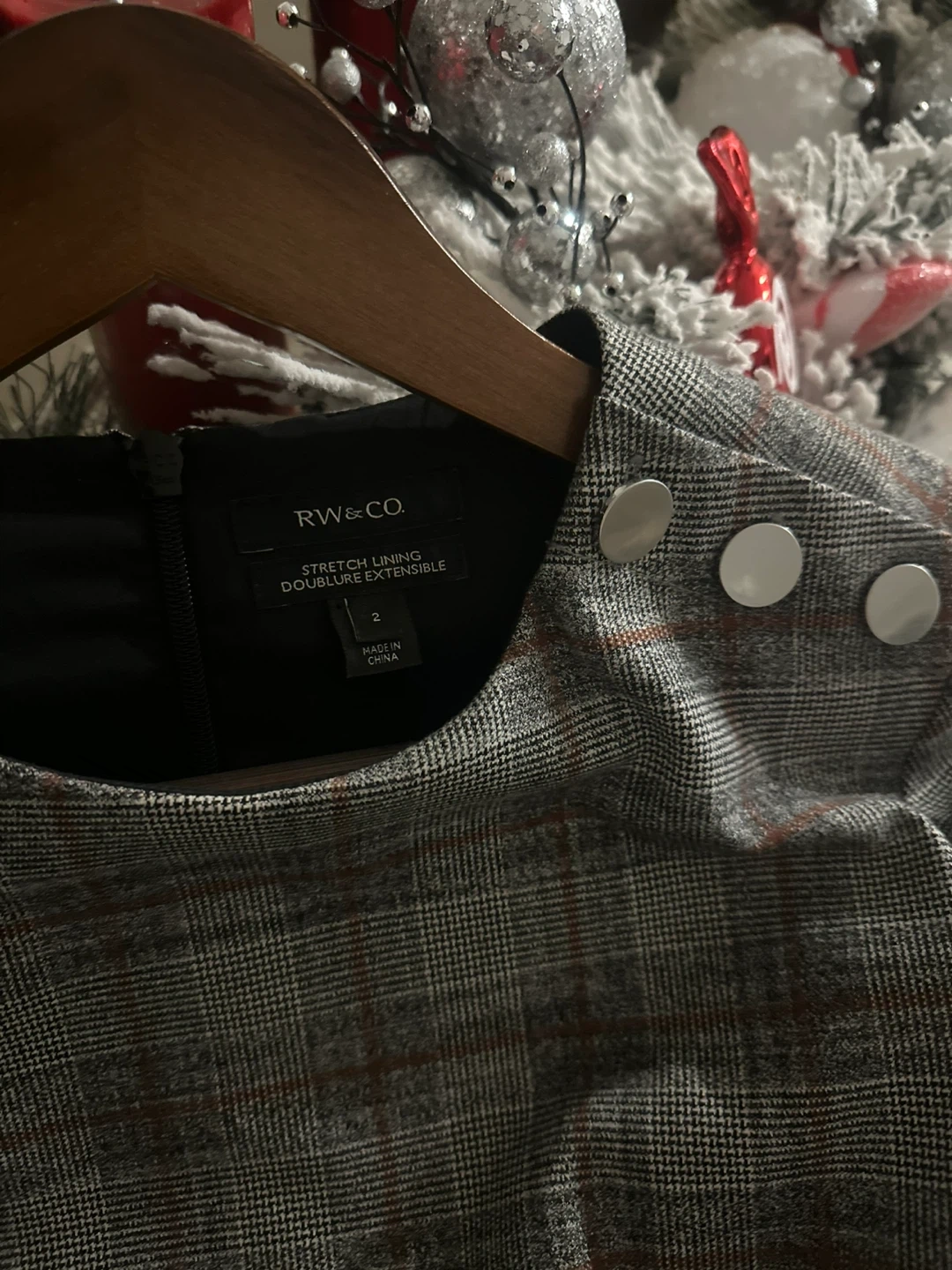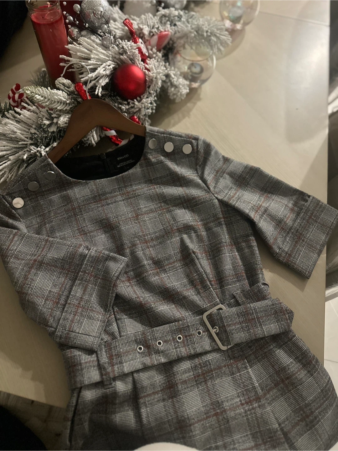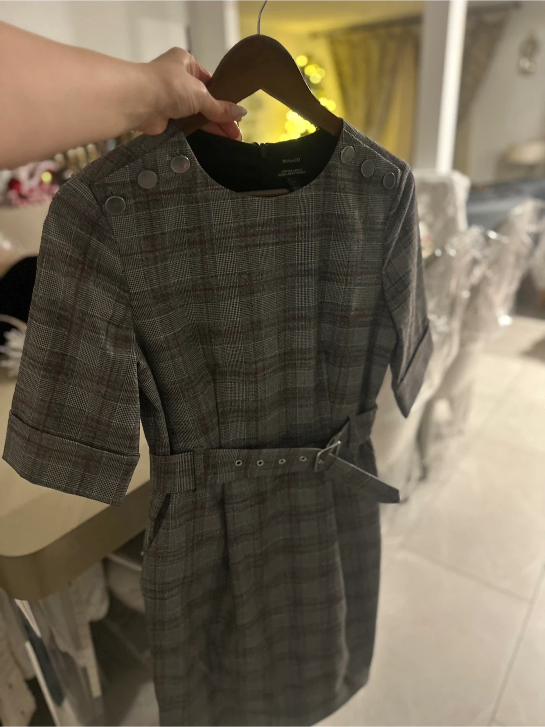 Selling a cute RW&CO dress! It's a size 2 and has a stylish plaid pattern. The dress features a belt and button details on the shoulders. Perfect for work or a special occasion!