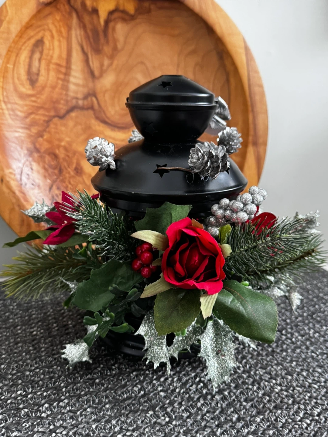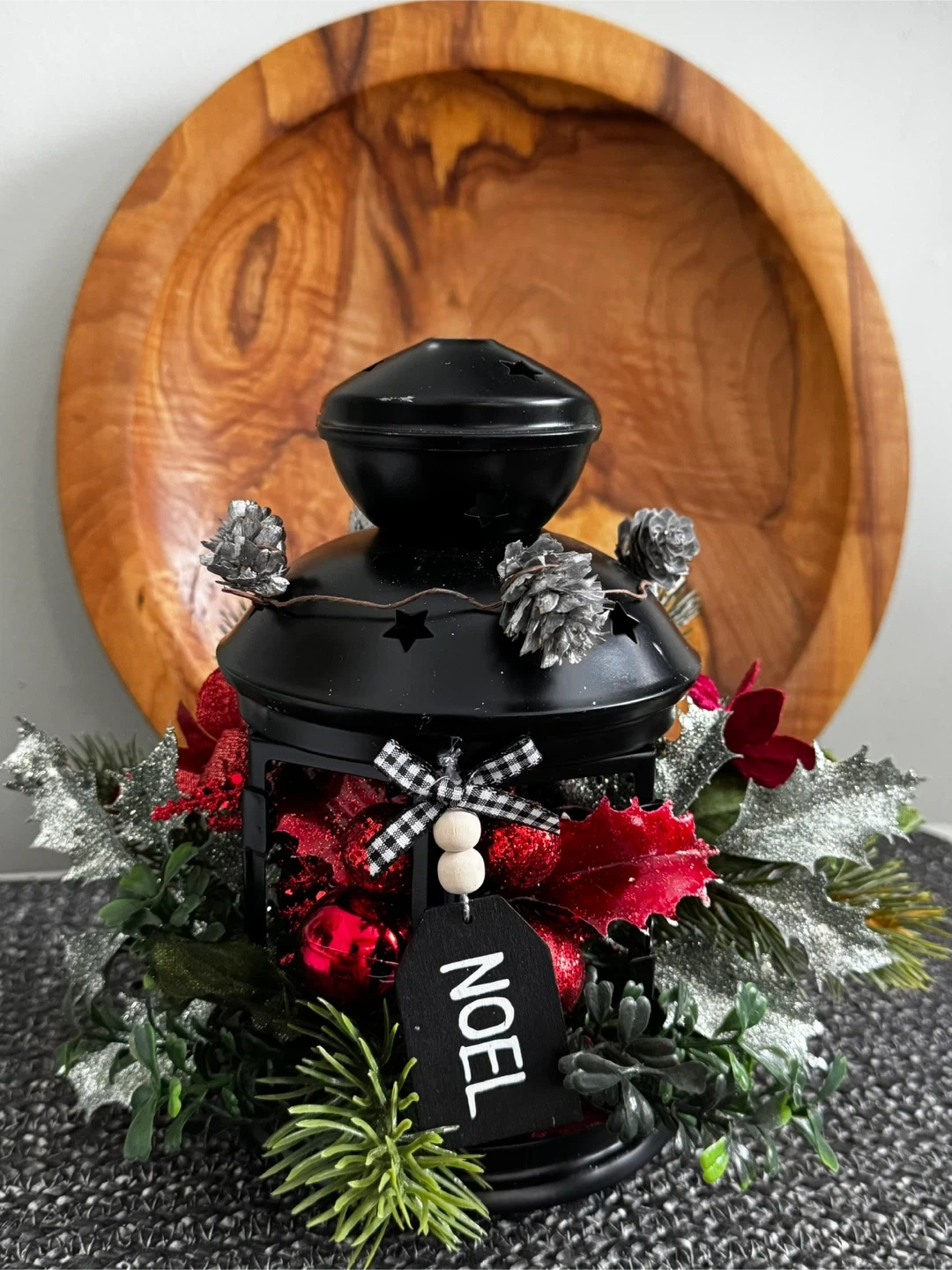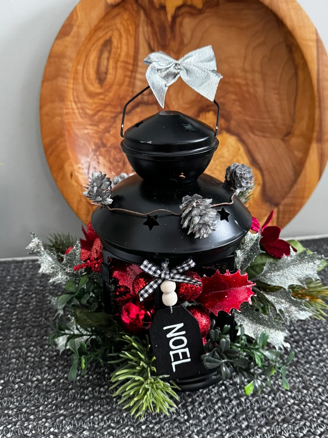 Festive Christmas lantern decoration! It is ready to bring some holiday cheer to your home. The lantern is black and adorned with festive decorations.