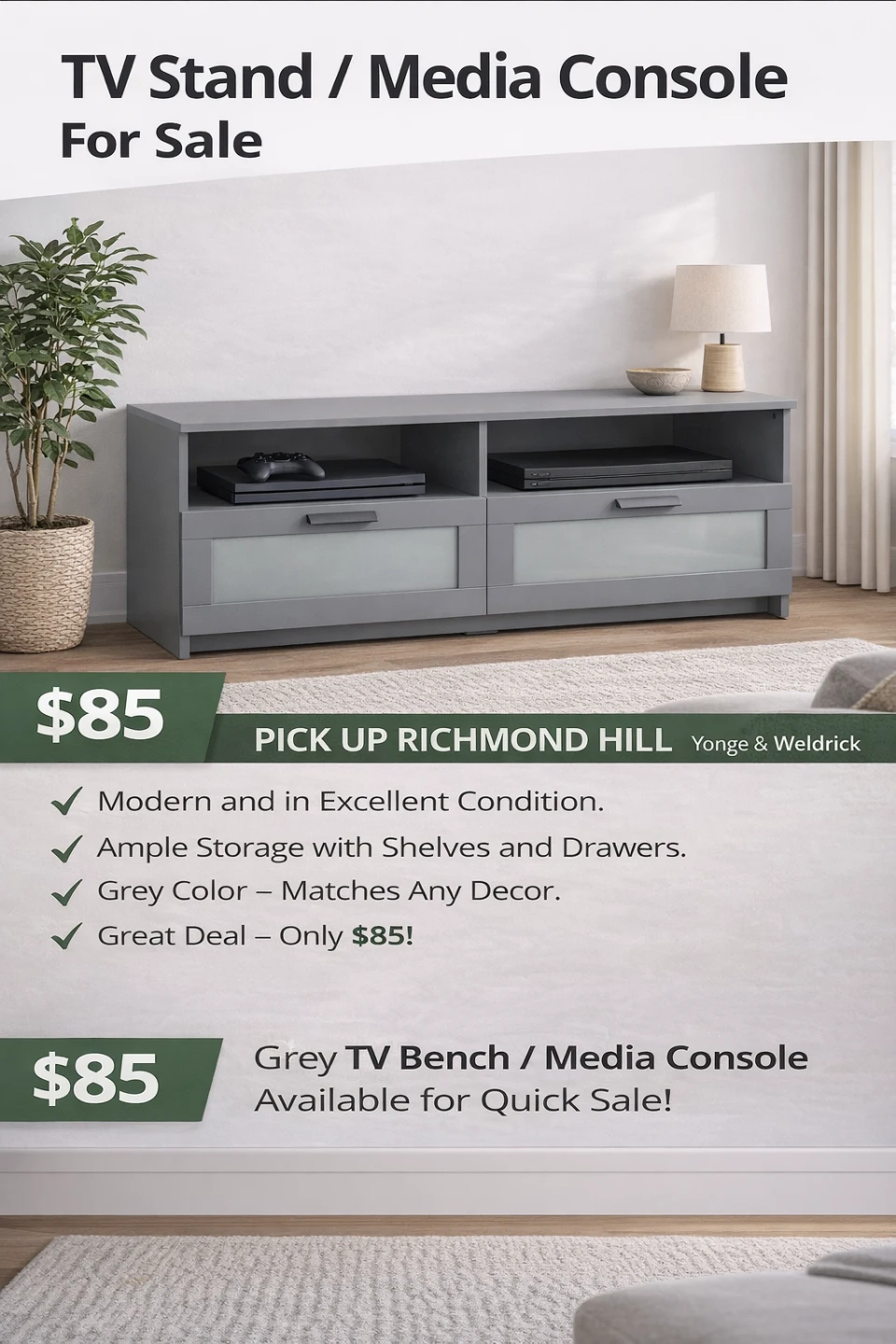 Clean, modern grey TV bench in great condition. Perfect for living room or family room. Plenty of storage with drawers and open shelving. Dimensions: • Width: 120 cm (47¼”) • Depth: 41 cm (16⅛”) • Height: 53 cm (20⅞”) ✔ Neutral grey – matches any décor ✔ Strong and sturdy ✔ Excellent condition 📍 Pick-up: Richmond Hill (Yonge & Weldrick) 📞 Call/Text: 416-732-1986 Serious buyers only. Fast pickup preferred.