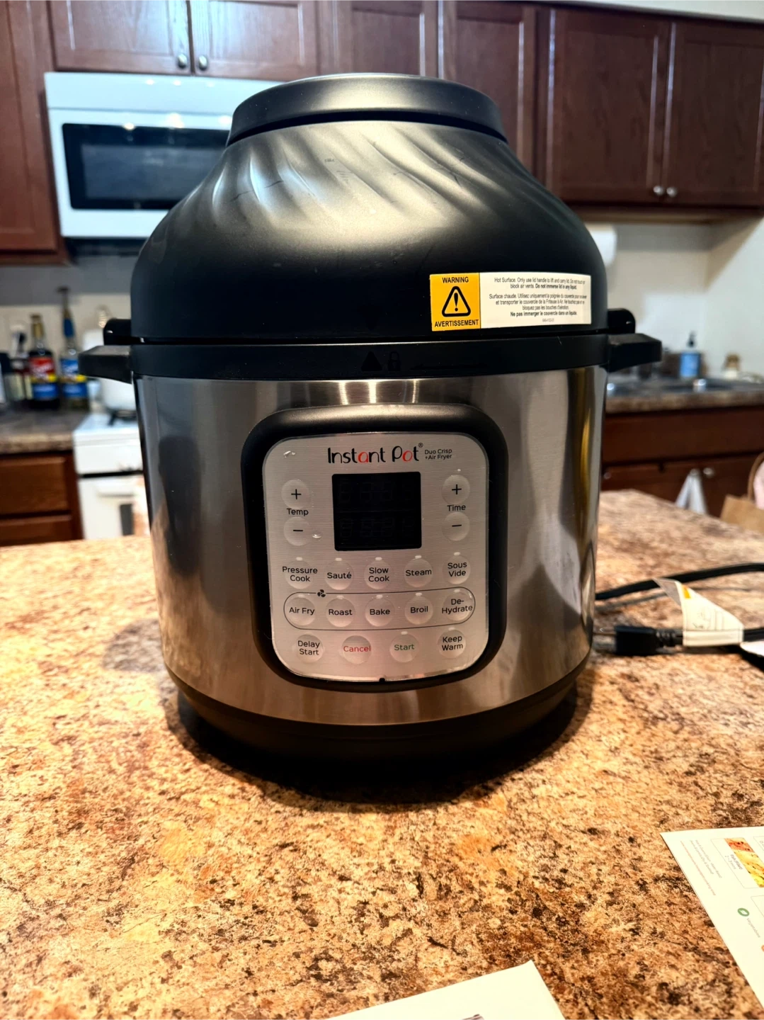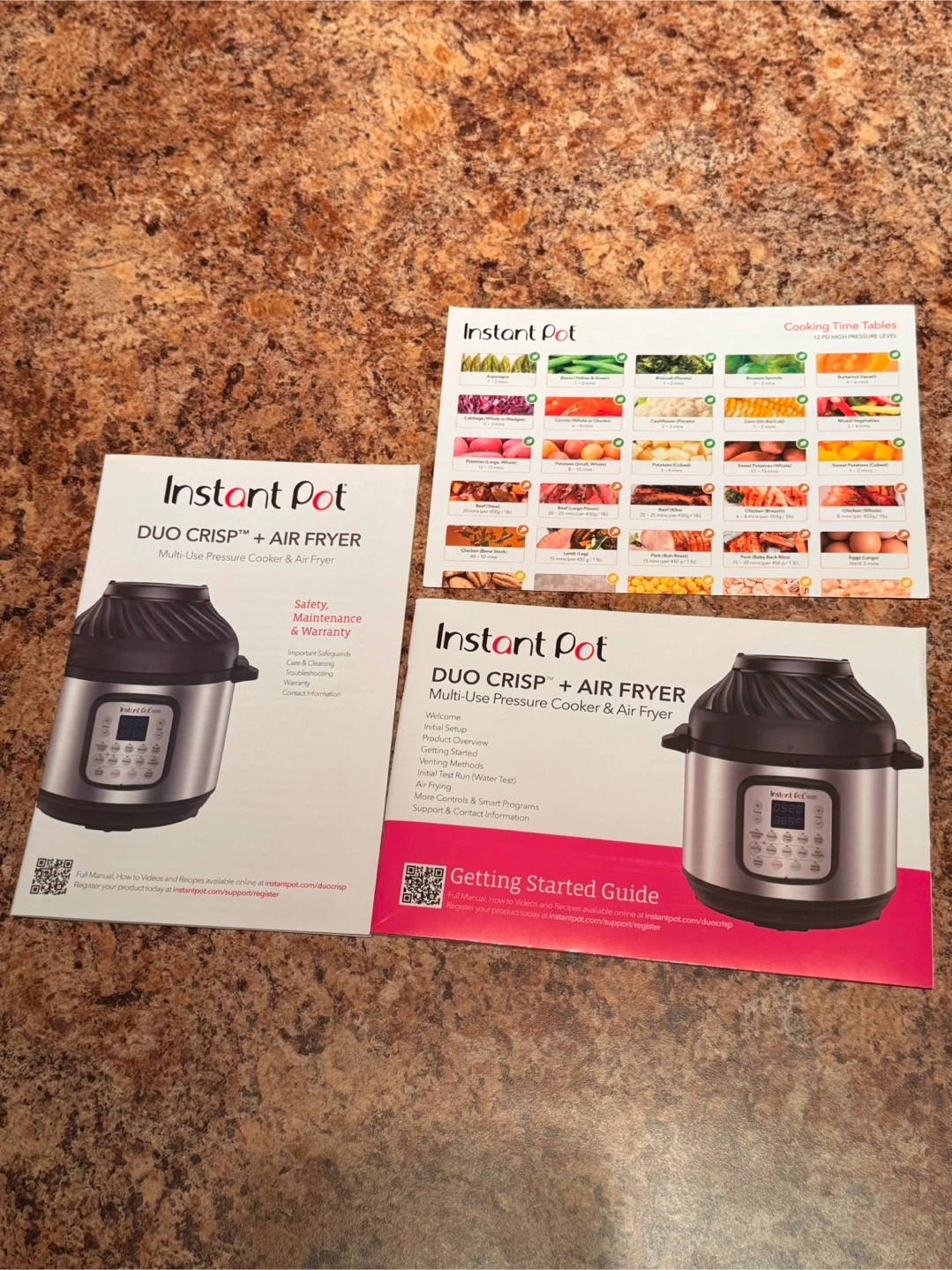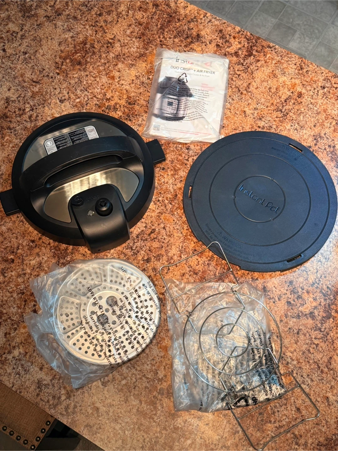 Selling an 8QT Instant Pot Duo Crisp + Air Fryer! It's a multi-use pressure cooker and air fryer combo. Included accessories are the broil/dehydrating tray, multi-level air fry basket, air fryer basket base, protective pad and storage cover, and multi-purpose rack. Also comes with the getting started guide and safety, maintenance & warranty information
