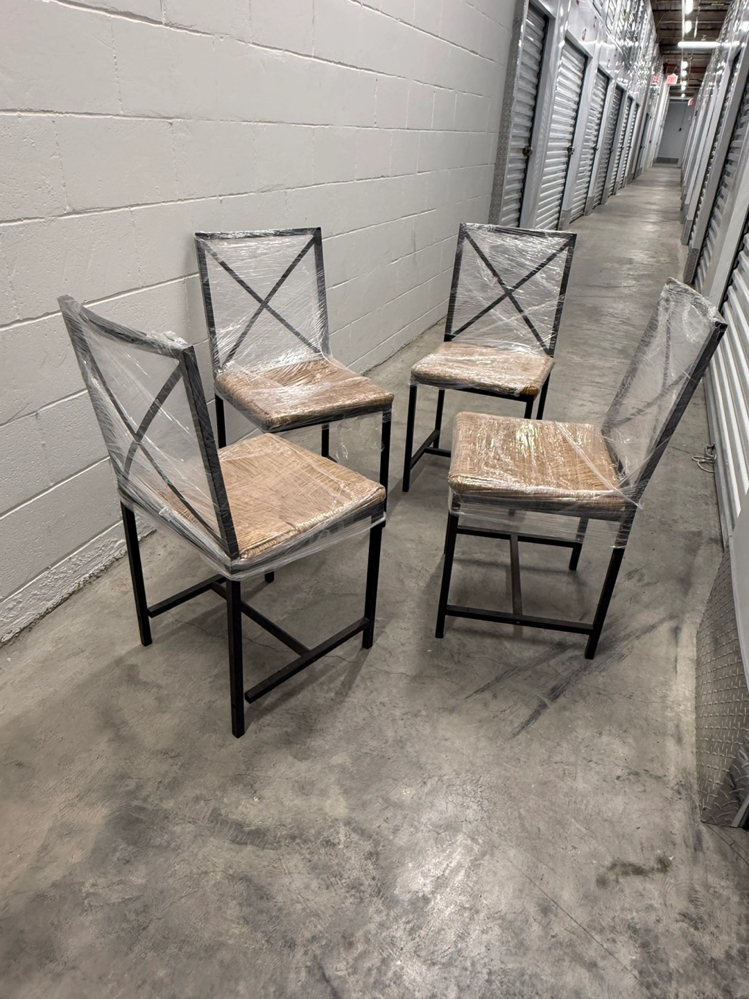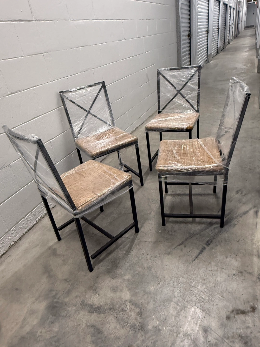 Selling a set of four dining chairs with a metal frame and woven seat. They are wrapped in plastic for protection. Great for adding a modern touch to your dining space!