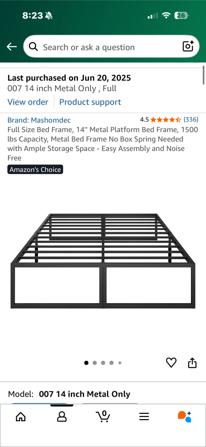 Selling a full-size bed frame from Mashomdec. It's a 14-inch metal platform bed frame with a 1500 lbs capacity. It's designed to be used without a box spring and has ample storage space. It's also designed for easy assembly and is noise-free
