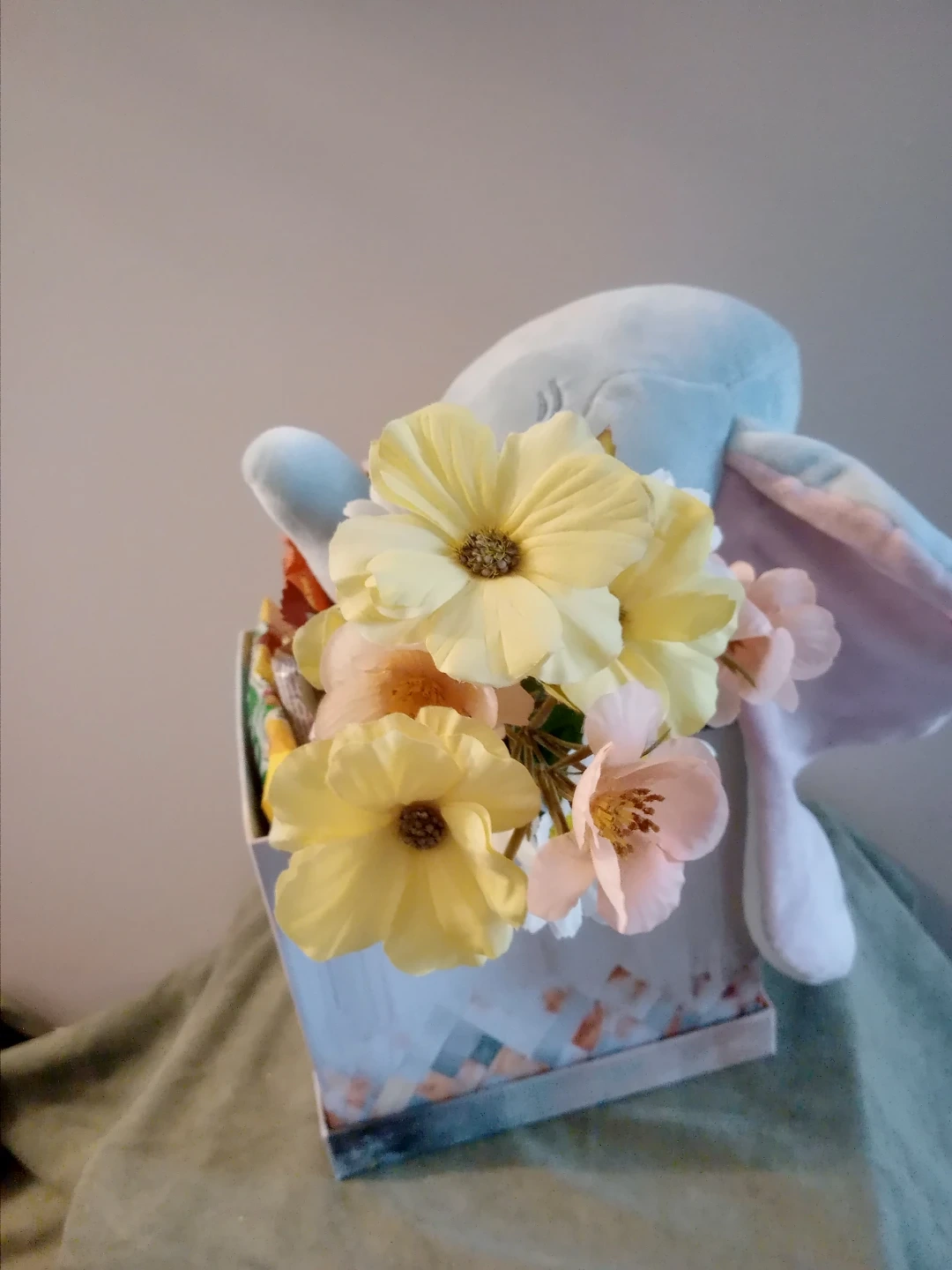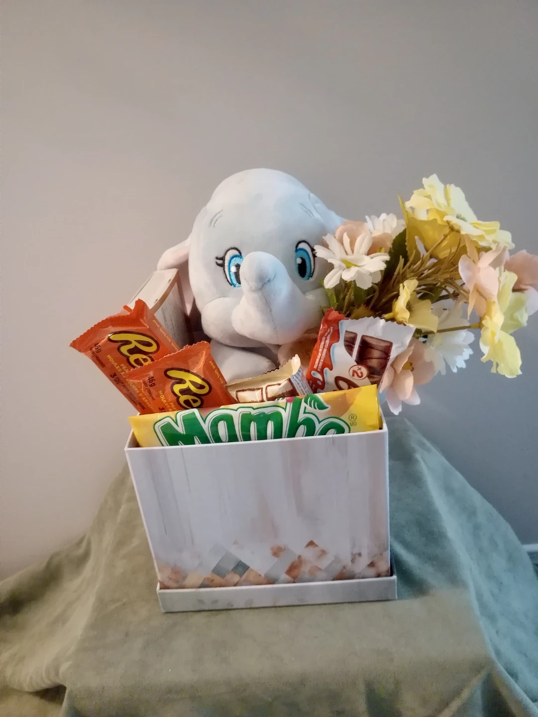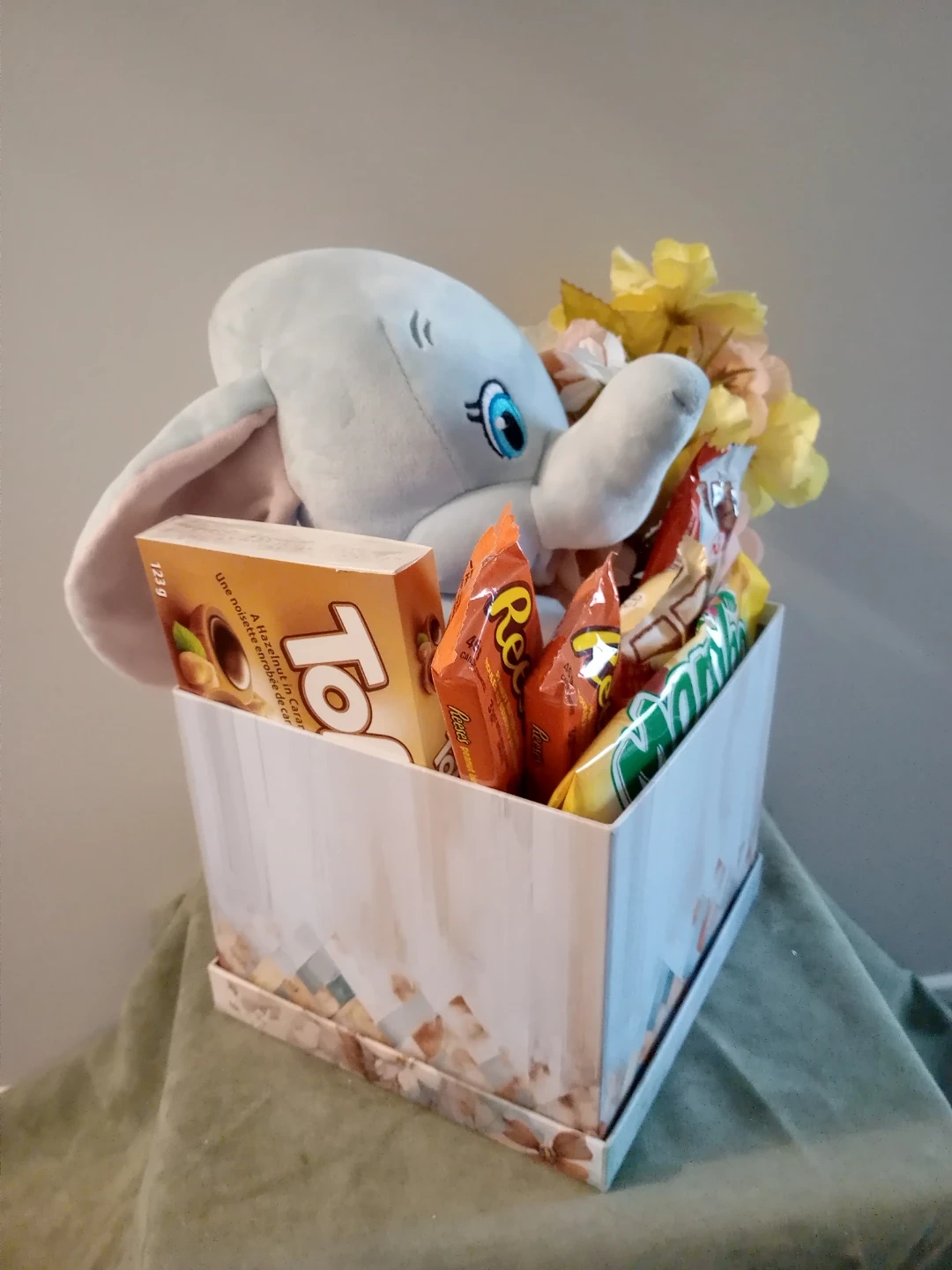 This adorable gift box includes an elephant plush, candy and decorative flowers. It is gift wrapped in cellophane tied with ribbons and ready to give to someone special!