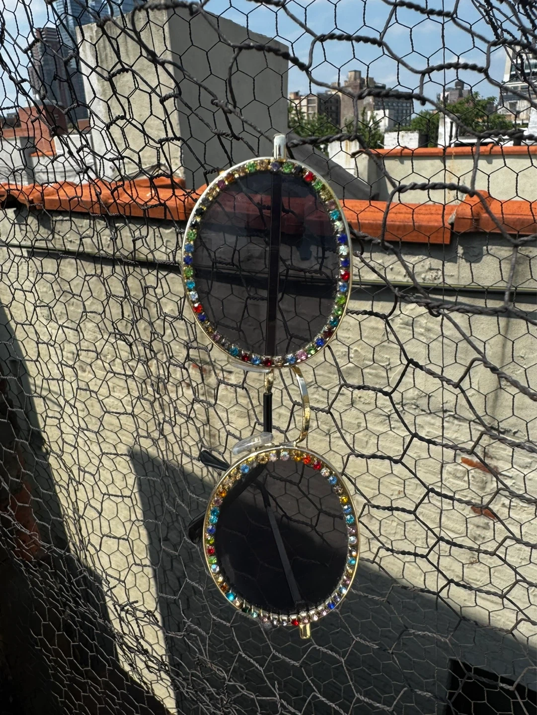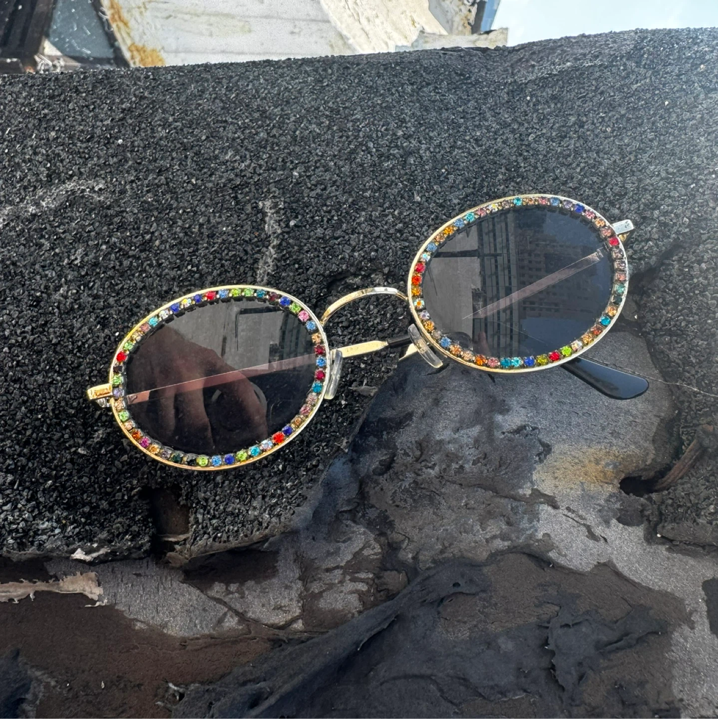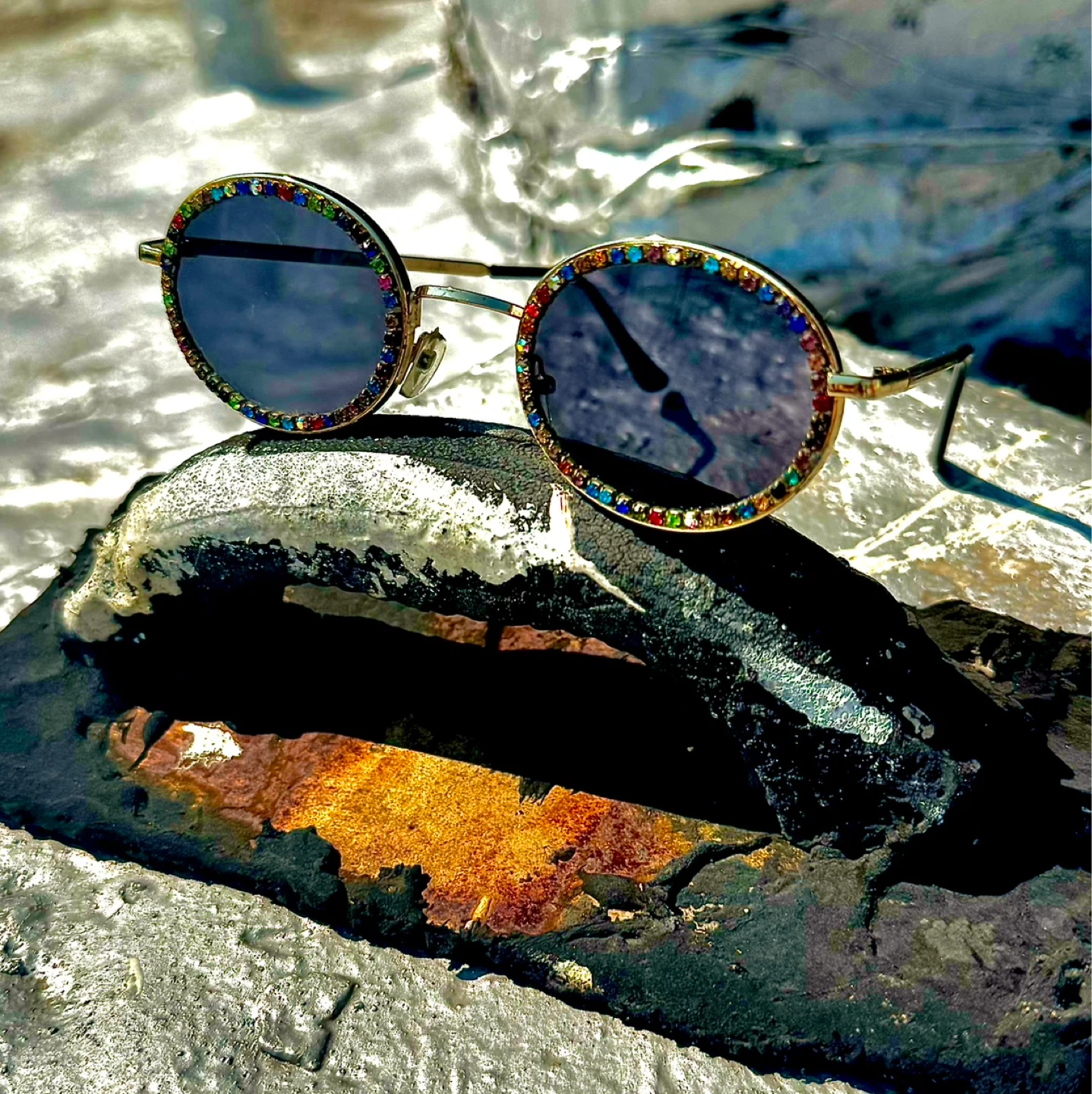 Featuring a luxurious gold metal frame adorned with vibrant multicolored rhinestones (red, blue, green, pink, and more) encircling the lenses for maximum sparkle and glamour. Perfect retro-vintage vibe – think festival-ready, beach chic, or everyday statement piece.