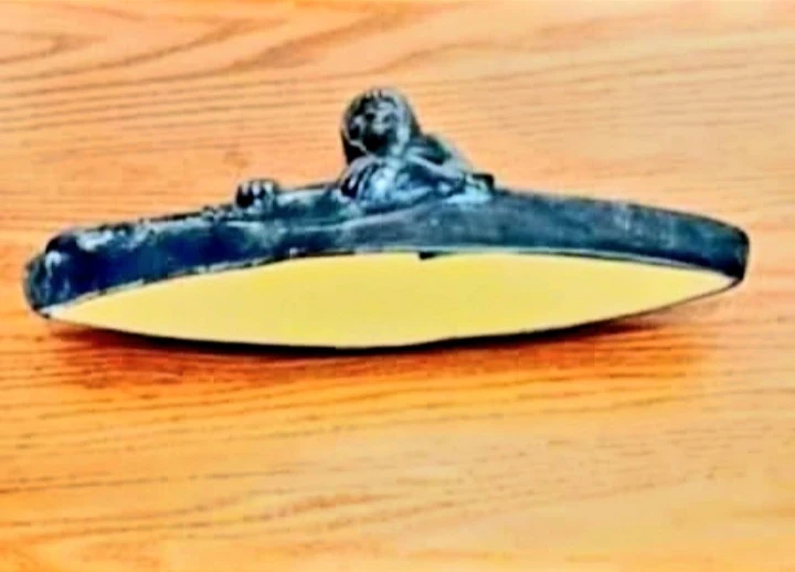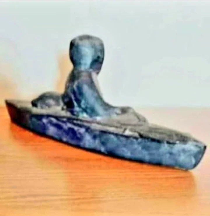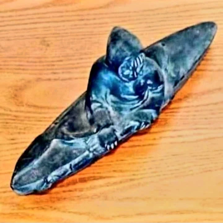 Unique striking Inuit sculpture depicts a figure in a kayak, meticulously carved from stone. It's a captivating piece that showcases the artistry of Inuit craftsmanship. Hand Carved Stoneware