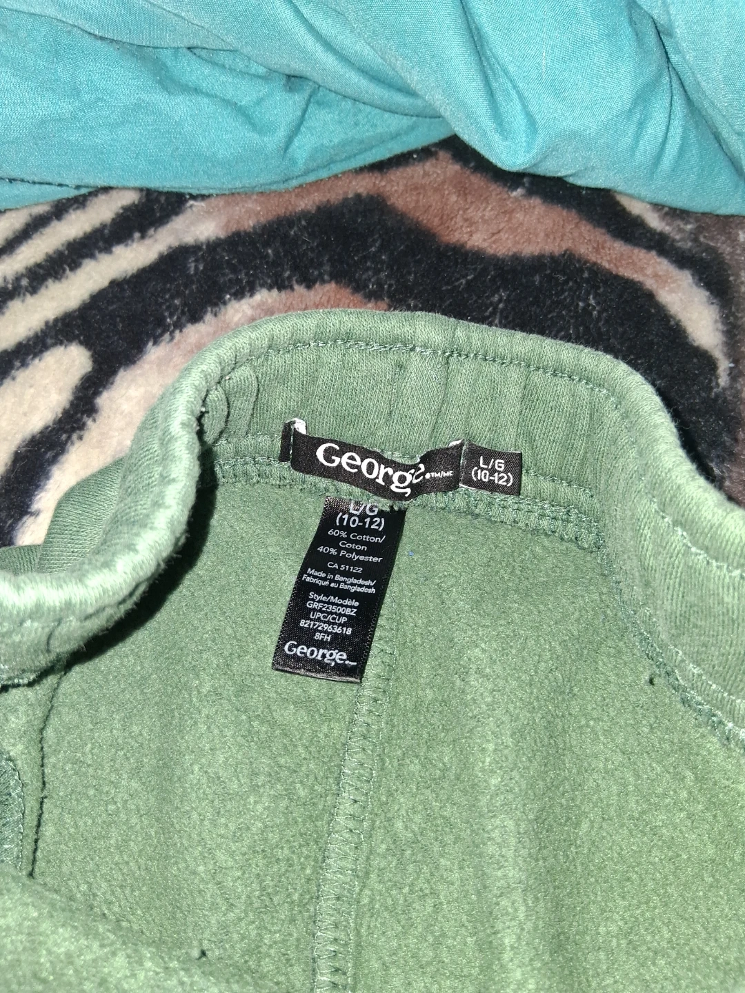 These are a comfy pair of George brand sweatpants for girls in a size large (10-12). They're green and made of 60% cotton and 40% polyester. Perfect for lounging or playing!