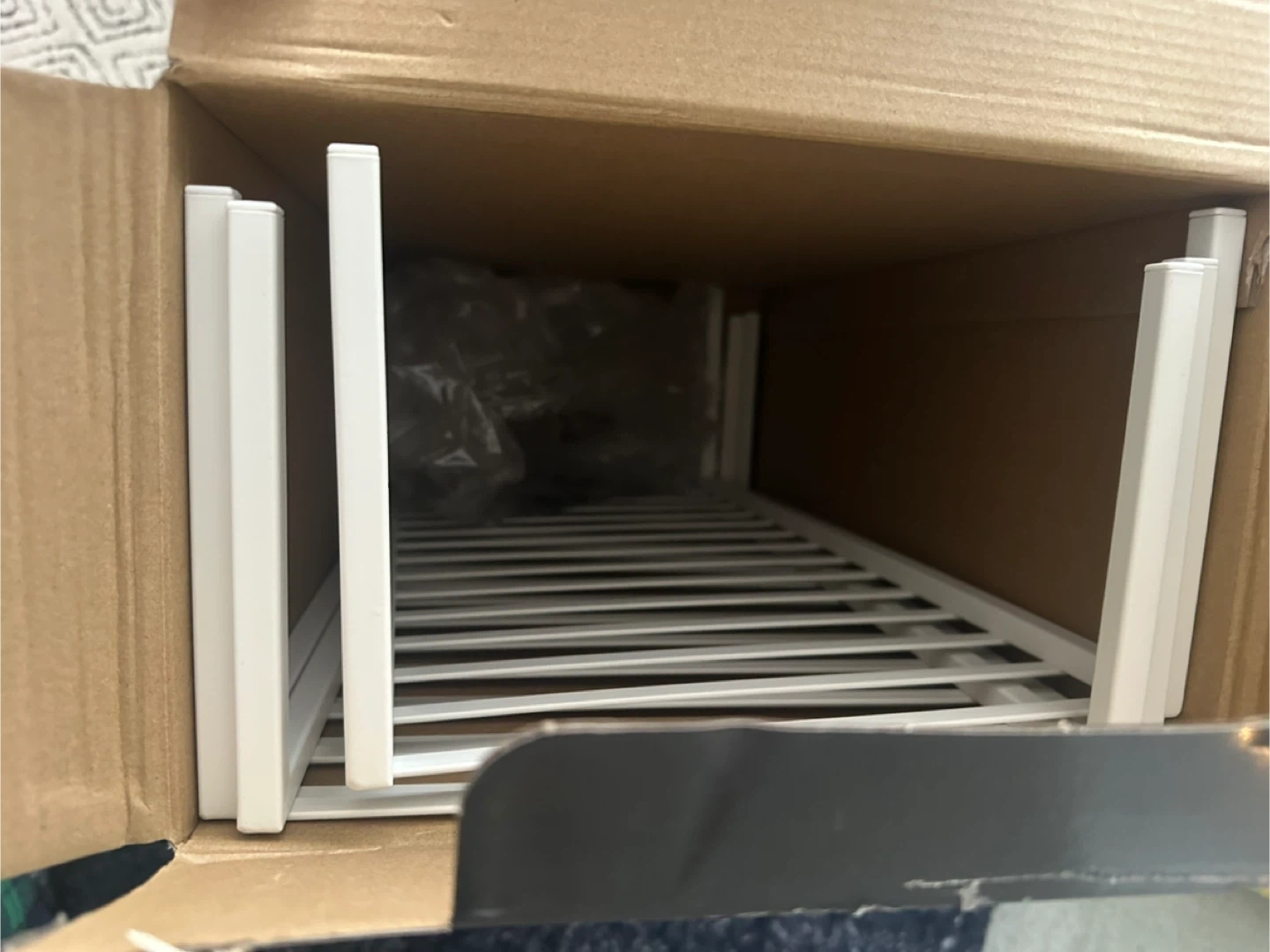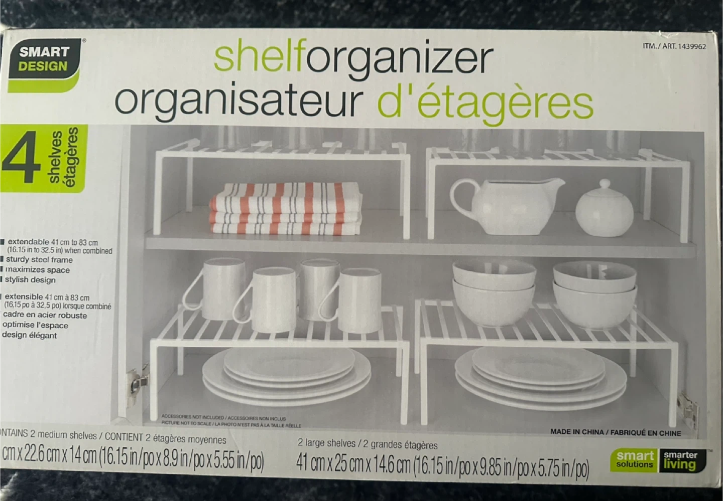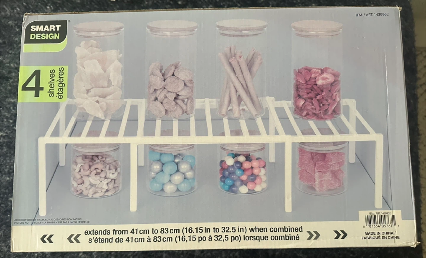 Selling a brand new Smart Design shelf organizer! It's still in its original packaging. This expandable shelf organizer extends from 41 cm to 83 cm (16.15 in to 32.5 in) when combined. It features a sturdy steel frame and maximizes space with its stylish design. Comes with 2 medium shelves (22.6 cm x 14 cm x 14 cm) and 2 large shelves (41 cm x 25 cm x 14.6 cm).