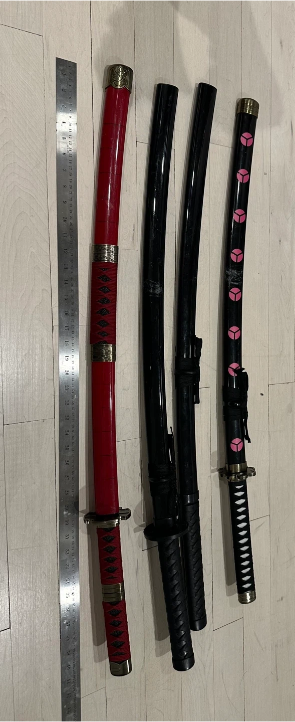 Selling a set of 4 decorative katana swords. One is red, and the other 3 are black. They are in used condition with some wear and scratches on the scabbards. Perfect for display or cosplay!
