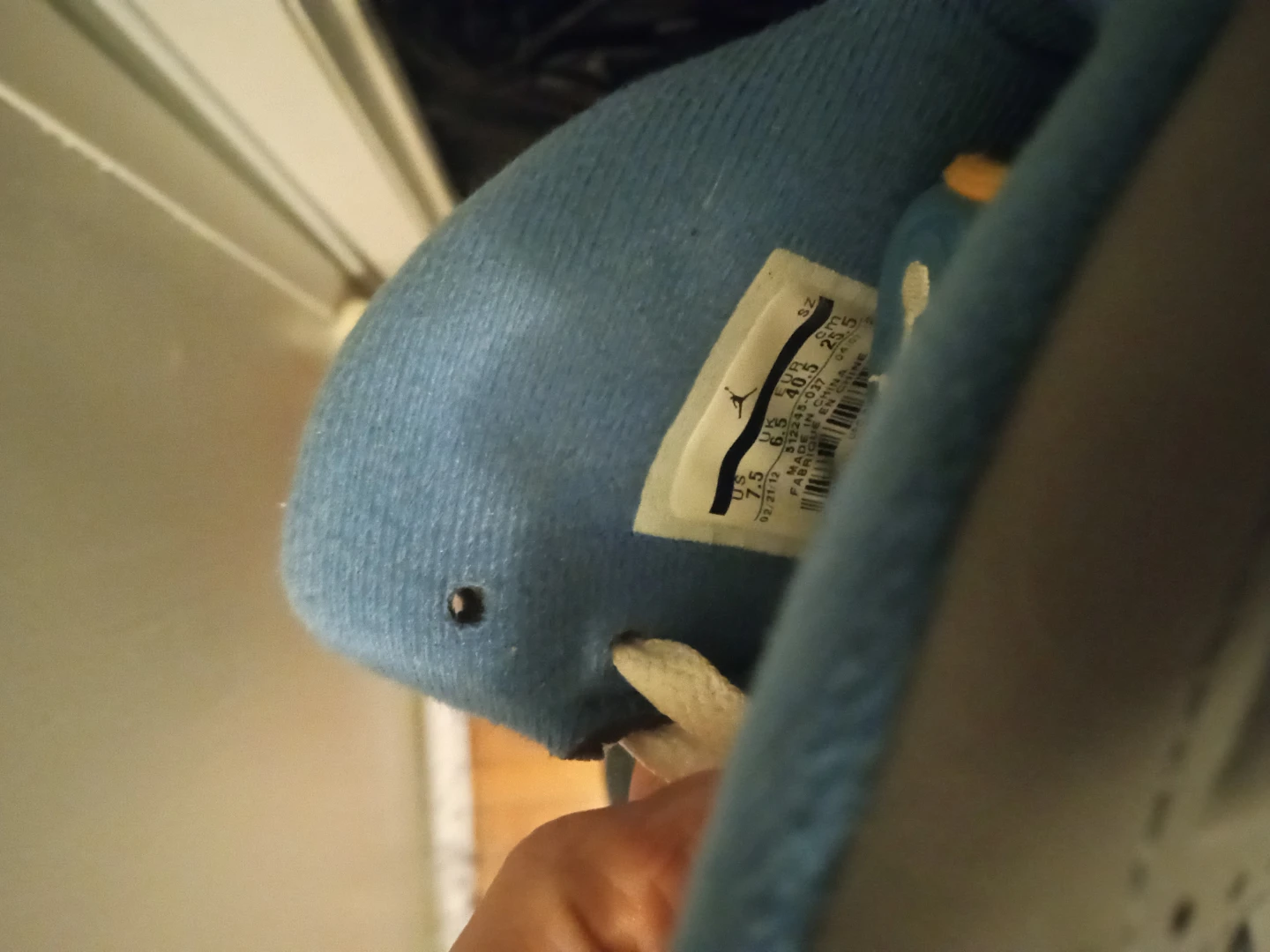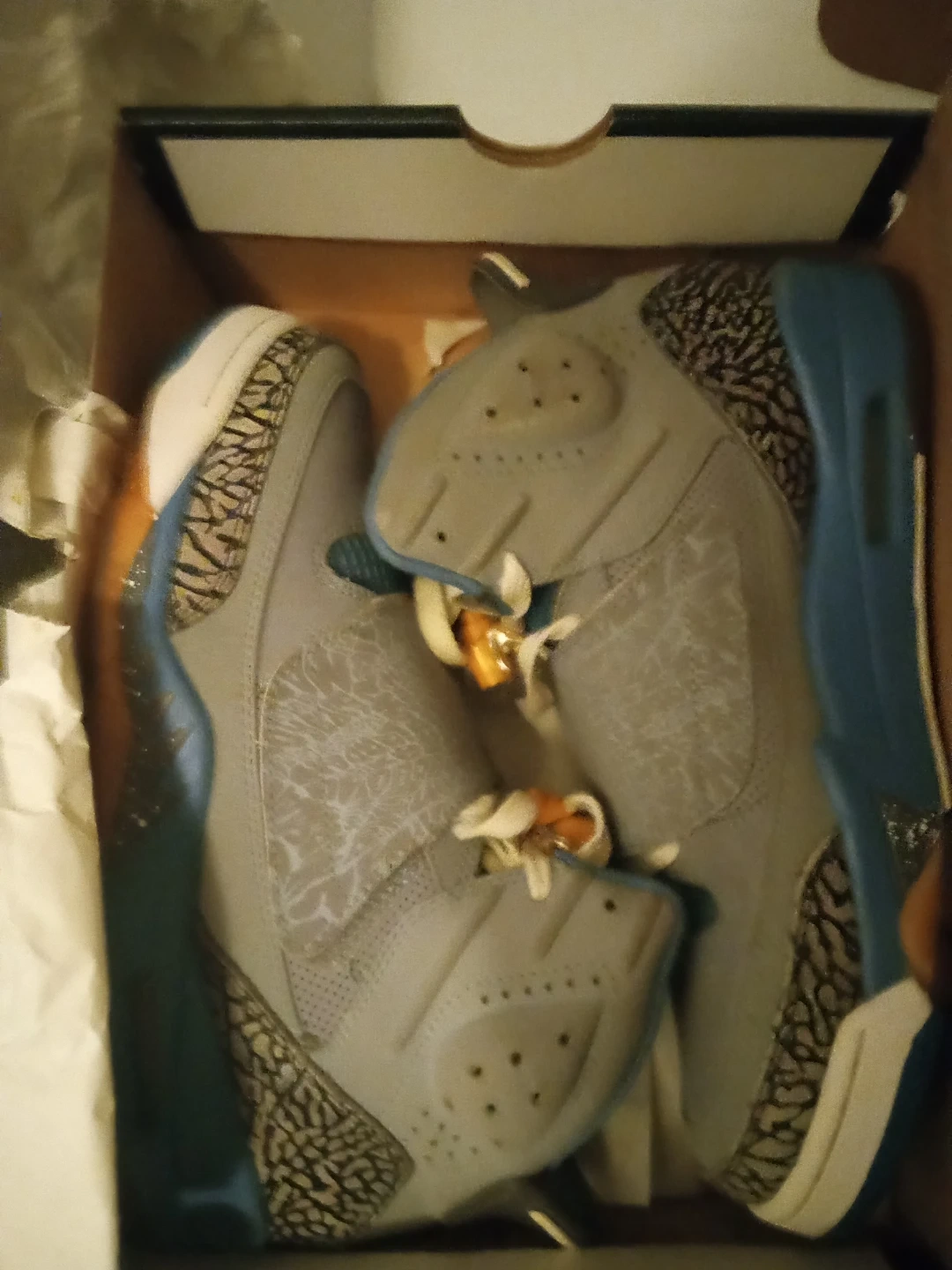 Selling a pair of Jordan Son of Mars sneakers in a grey and blue colorway. They are a US size 7.5 and come with the original box. The size tag indicates a manufacturing date of 2018 March 23.