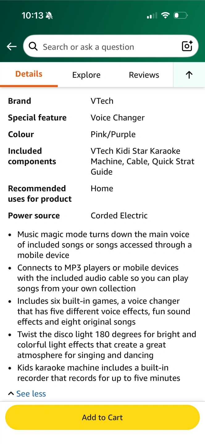 Selling a band new in box VTech Kidi Star Karaoke Machine in pink and purple! It comes with the VTech Kidi Star Karaoke Machine, cable, and quick start guide. It features a voice changer, six built-in games, fun sound effects, and eight original songs. The disco light twists 180 degrees for bright and colourful light effects to create a great atmosphere for singing and dancing. It also includes a built-in recorder for up to five minutes!