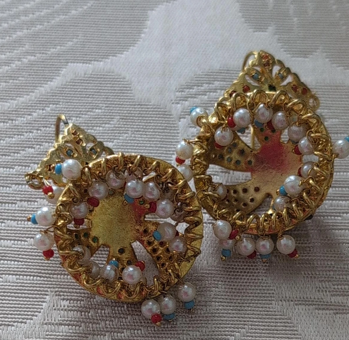 These are a pair of gold-tone dangle earrings. They have a circular design with pearl and coloured bead accents. They are in good condition and ready to wear!