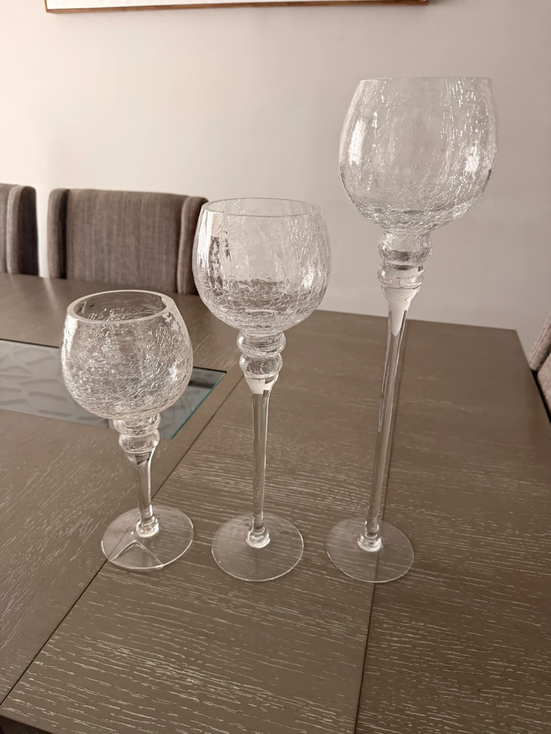 Selling a set of three clear glass candle holders. They have a crackle glass design and varying heights. Perfect for adding a touch of elegance to any room!
