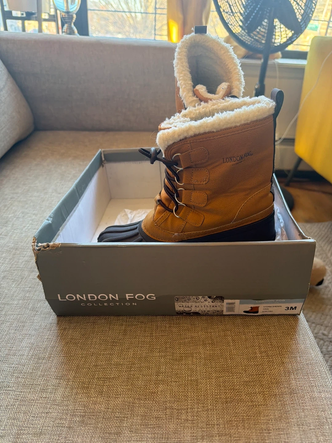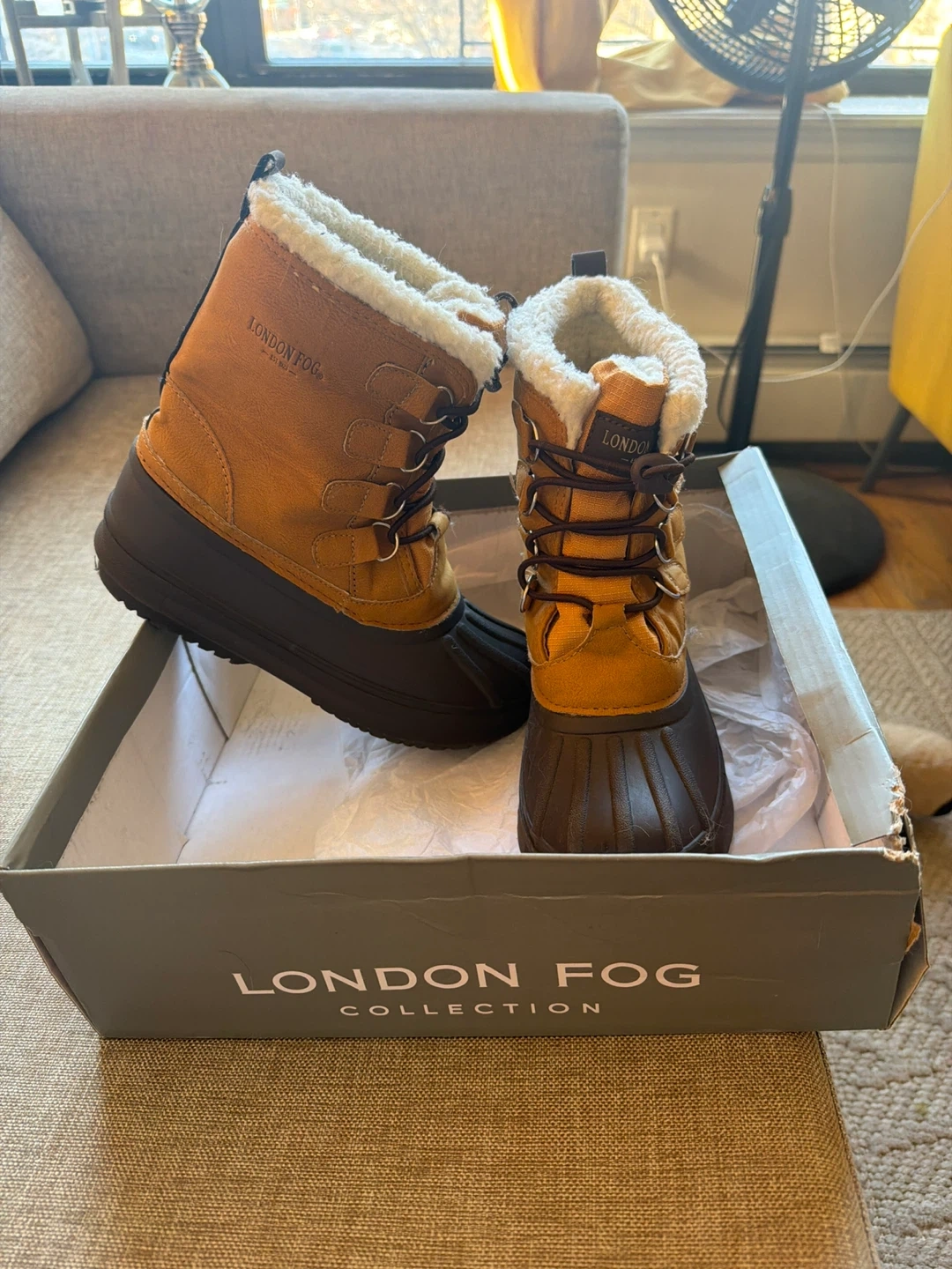 London Fog Collection women's boots in size 3M. These boots are water-resistant and come with the original box. They feature a cozy, fur-lined interior, perfect for keeping your feet warm and dry!