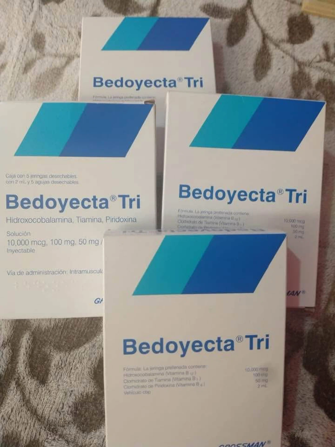 Selling boxes of Bedoyecta Tri injectable solution. Each box contains 5 disposable syringes with 2 ml and 5 disposable needles. Each solution contains Hidroxocobalamina, Tiamina, and Piridoxina.