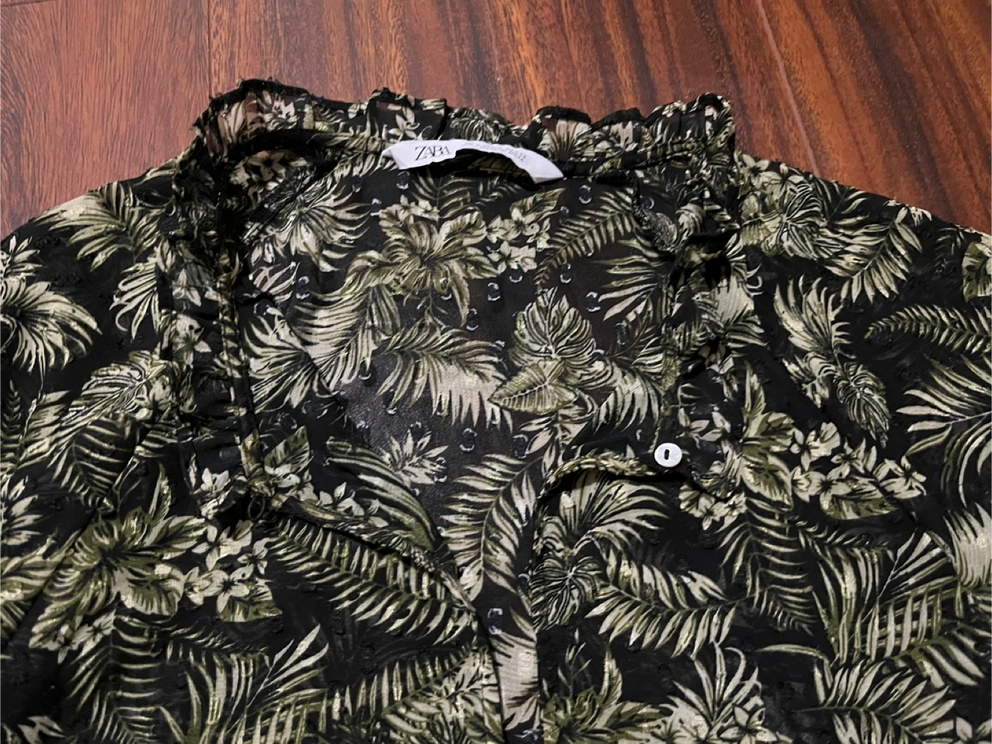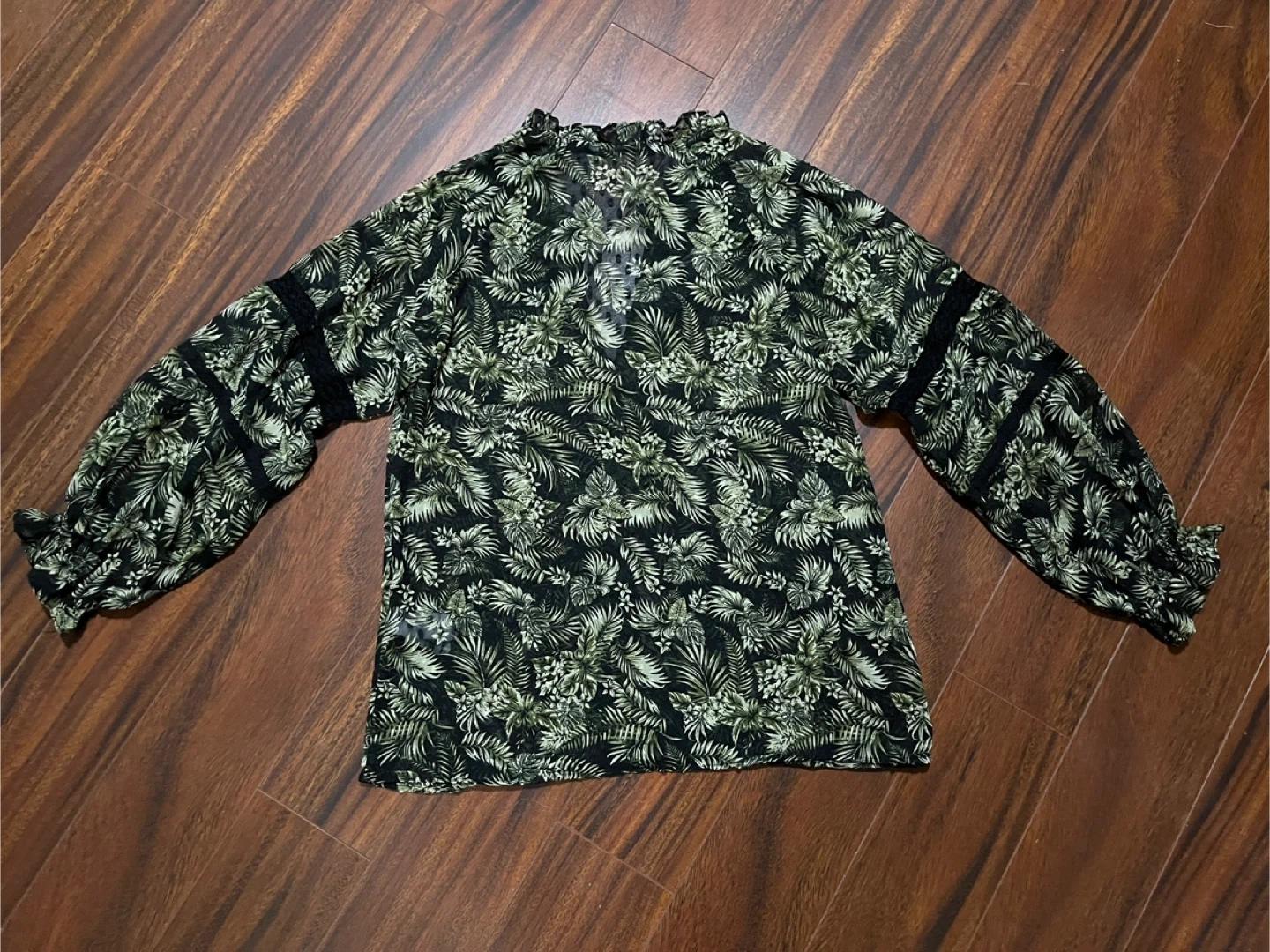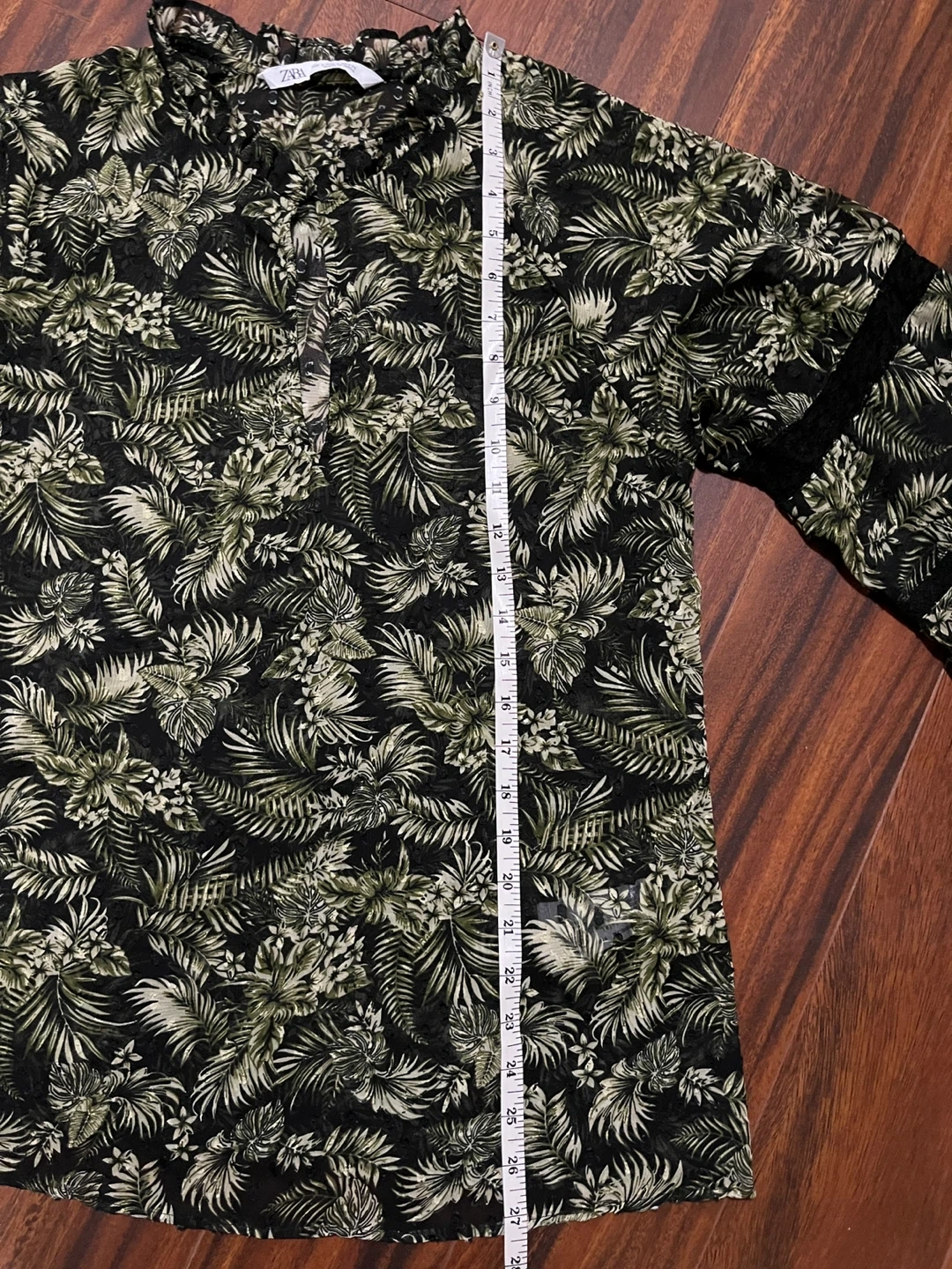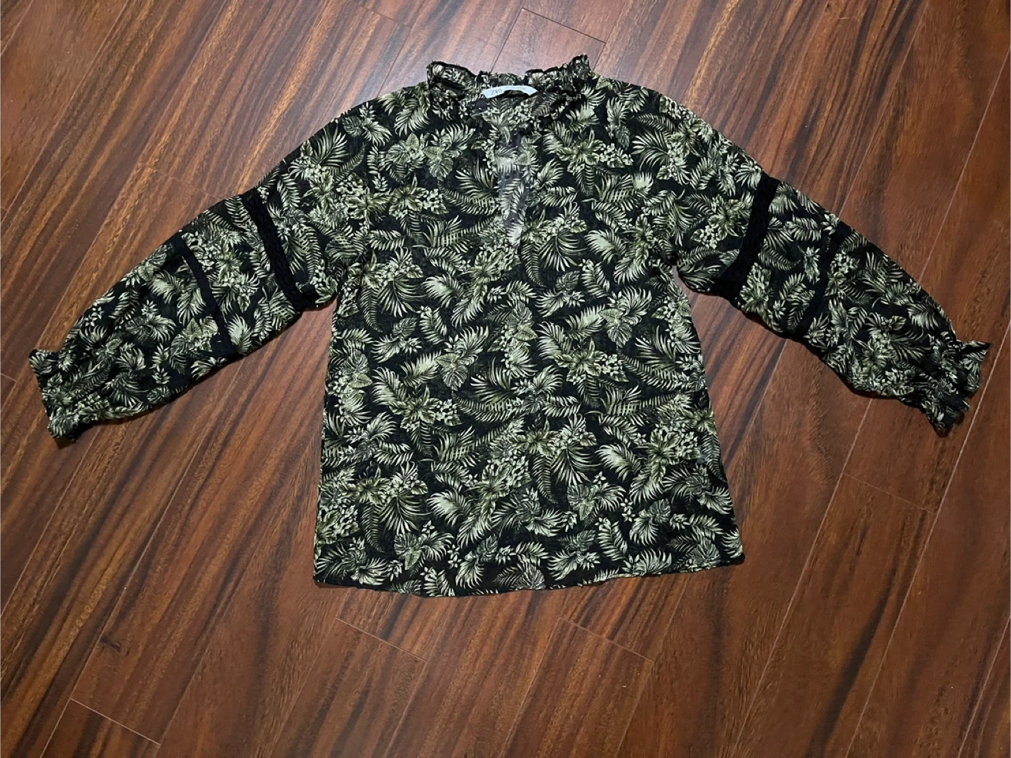 Zara women’s small balloon sleeve leaf print blouse, black green