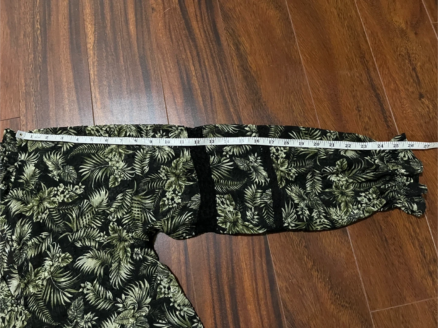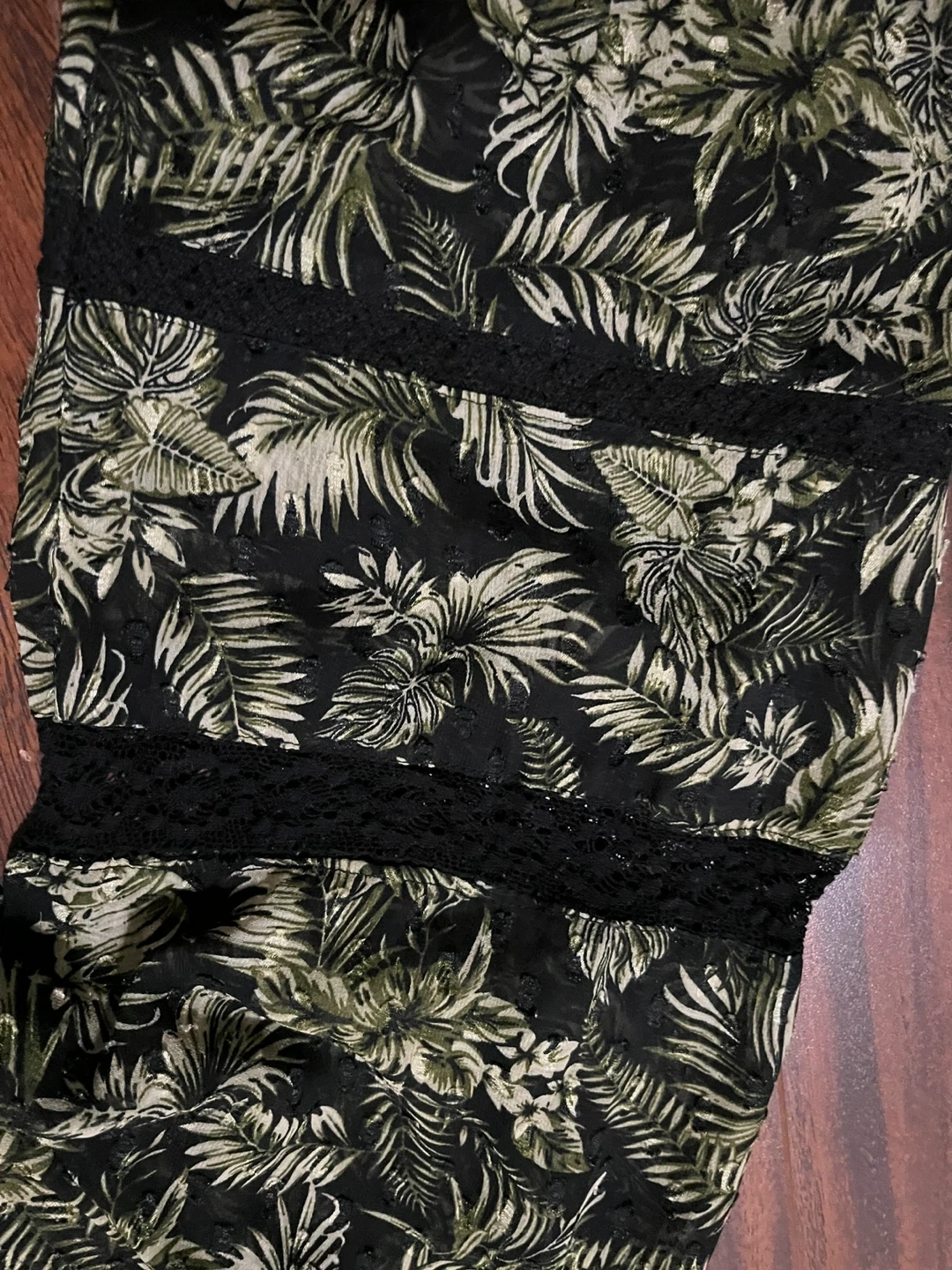 Zara women’s blouse in size small. Black background with green and beige leaf print. Lightweight semi-sheer fabric with embroidered dot texture. High frilly neckline with keyhole button closure. Balloon sleeves with lace trim bands and frilled cuffs. Excellent condition. Smoke free home. Approximate flat measurements: • Pit to pit: 18.5” • Hip: 21.5” • Length: 27.5” • Sleeve (neck to cuff frill): 26” Pickup in Oshawa - Harmony/Rossland area
