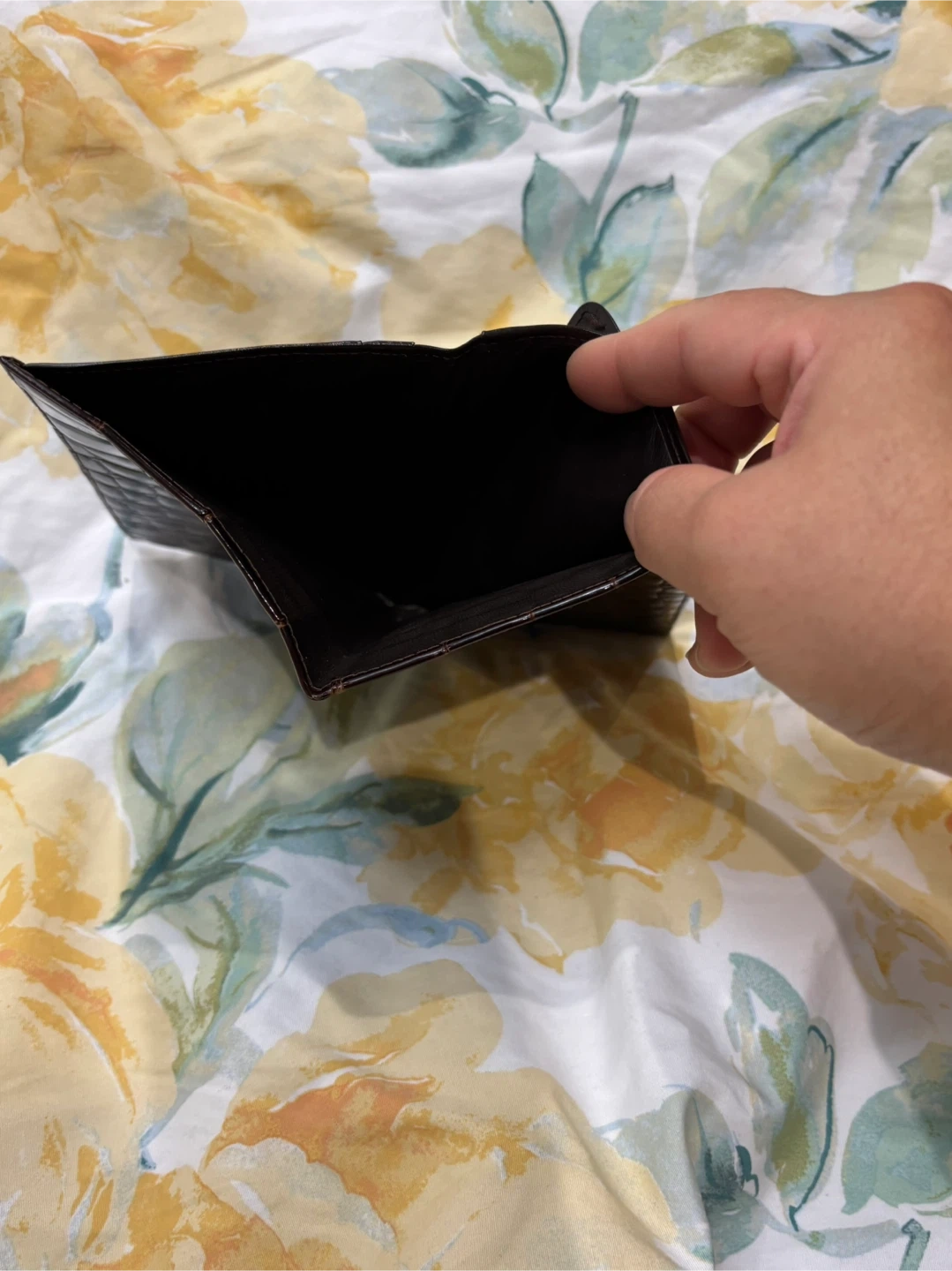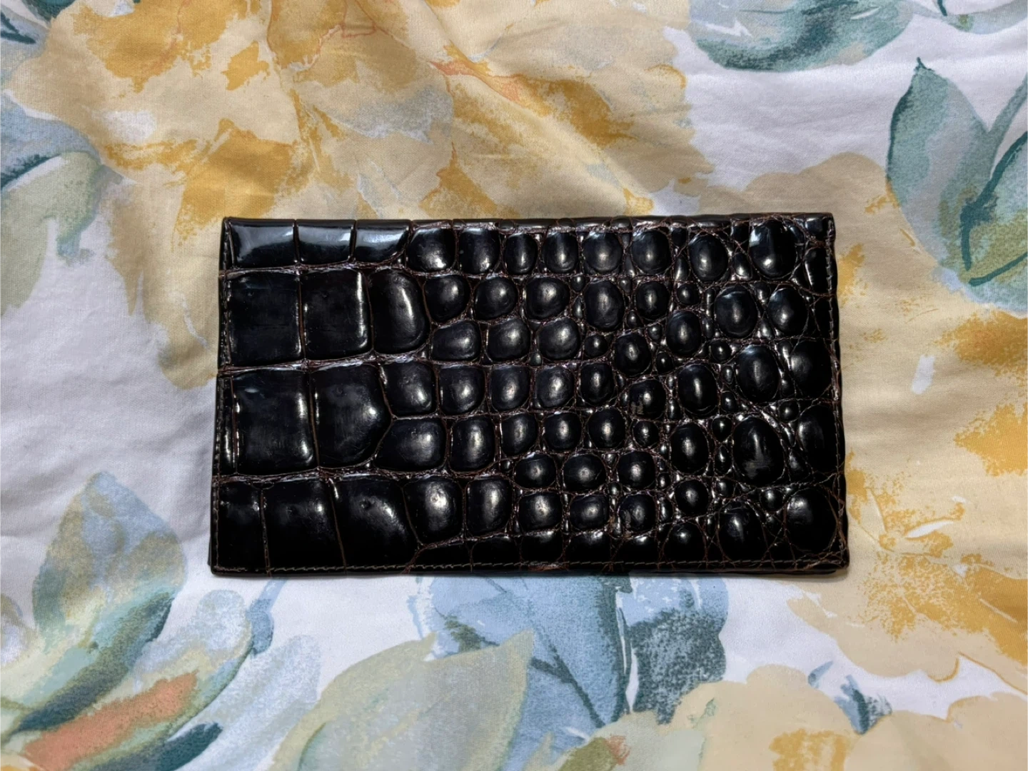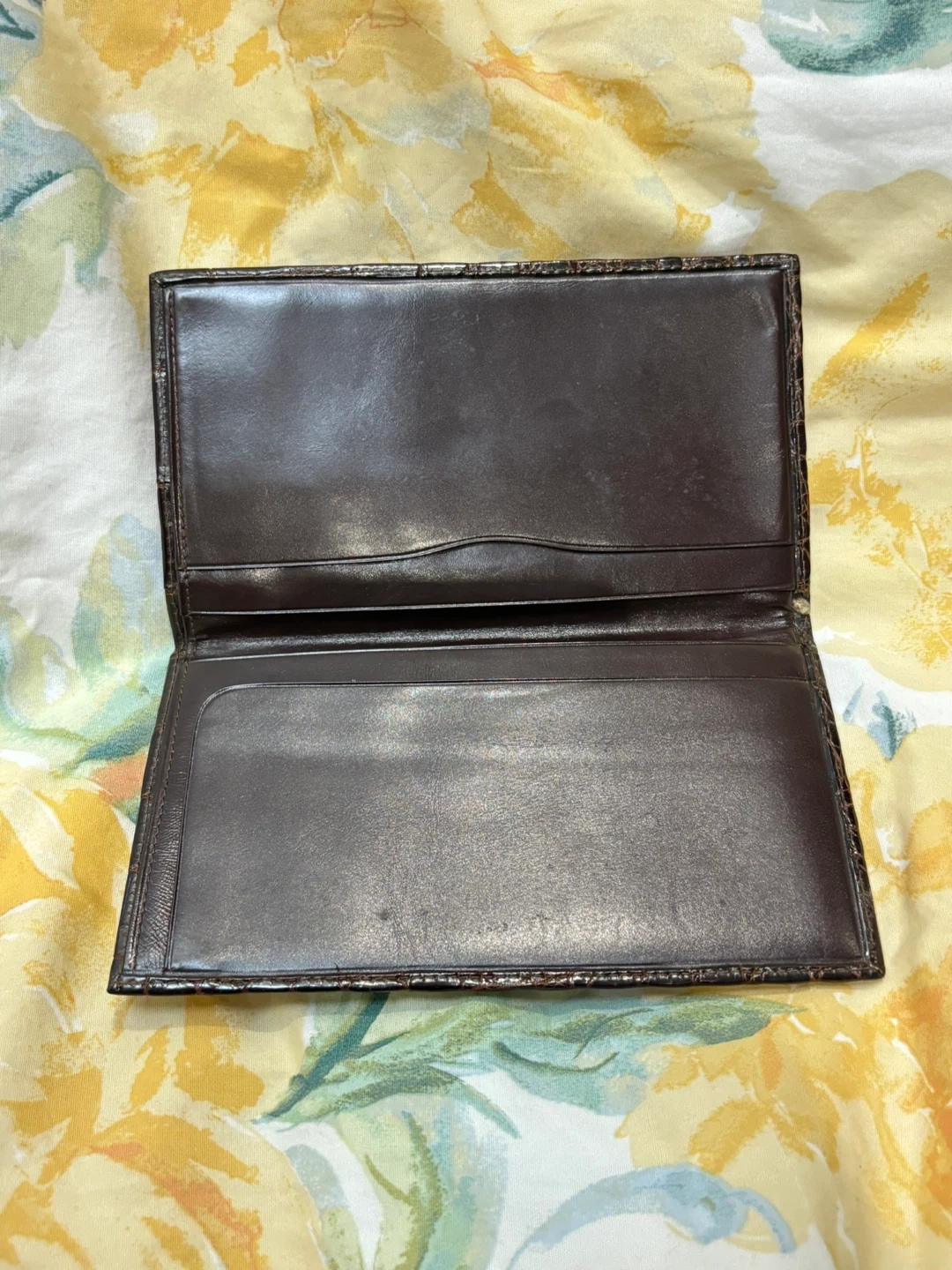 Selling a gently used brown leather wallet. It has a unique crocodile-like texture. It's perfect for keeping your cards and cash organized. It shows some signs of wear. No holds first come first serve