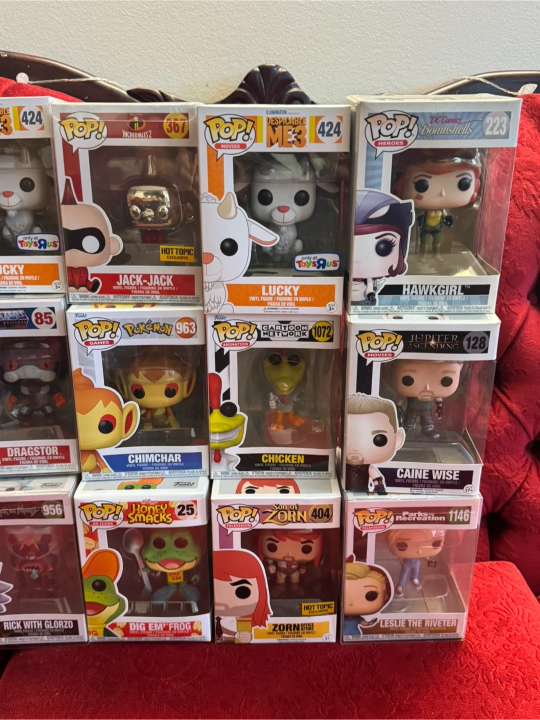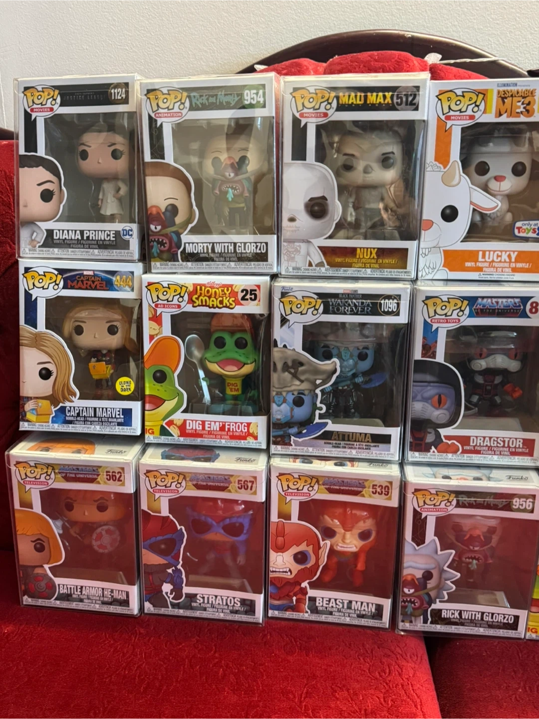 Selling a variety of Funko Pop! vinyl figures. All are in their original boxes. Great for collectors! Various characters available, including Diana Prince, Morty with Glorzo, Nux, Lucky, Captain Marvel, Dig Em' Frog, Atuma, Dragstor, Battle Armor He-Man, Stratos, Beast Man, Rick with Glorzo, Jack-Jack, Chicken, Caine Wise, Leslie the Riveter, and more! Feel free to ask about specific characters.