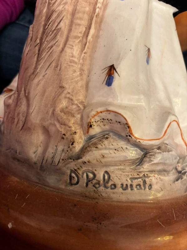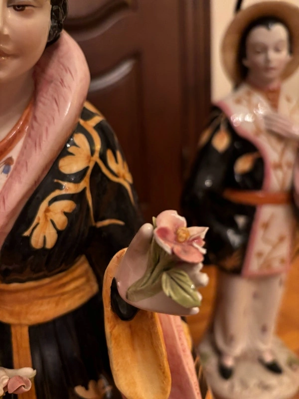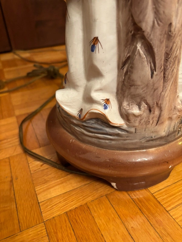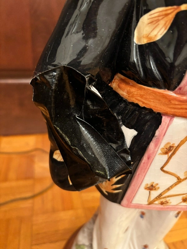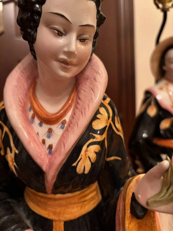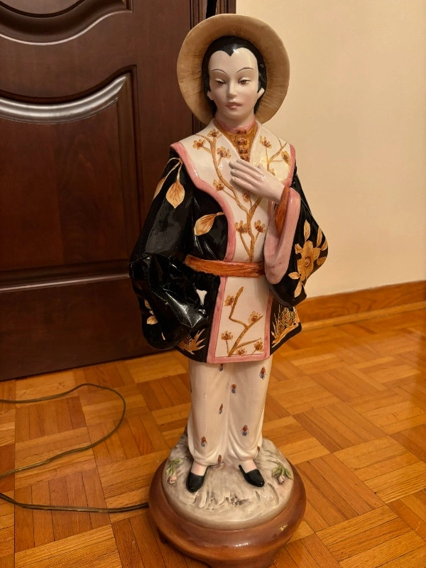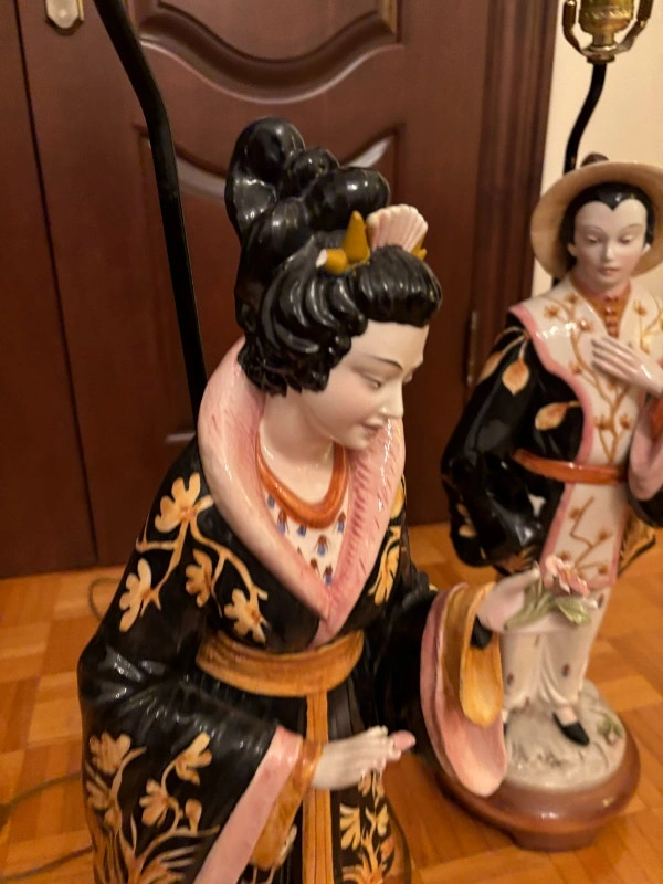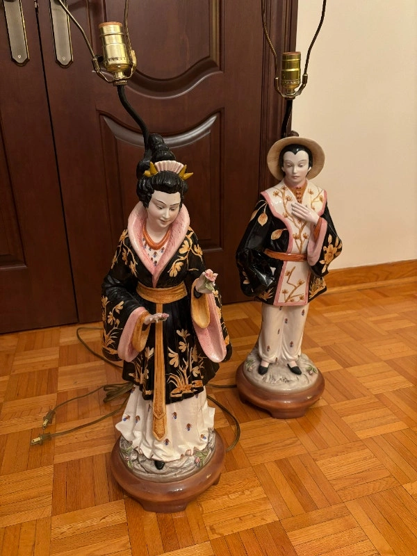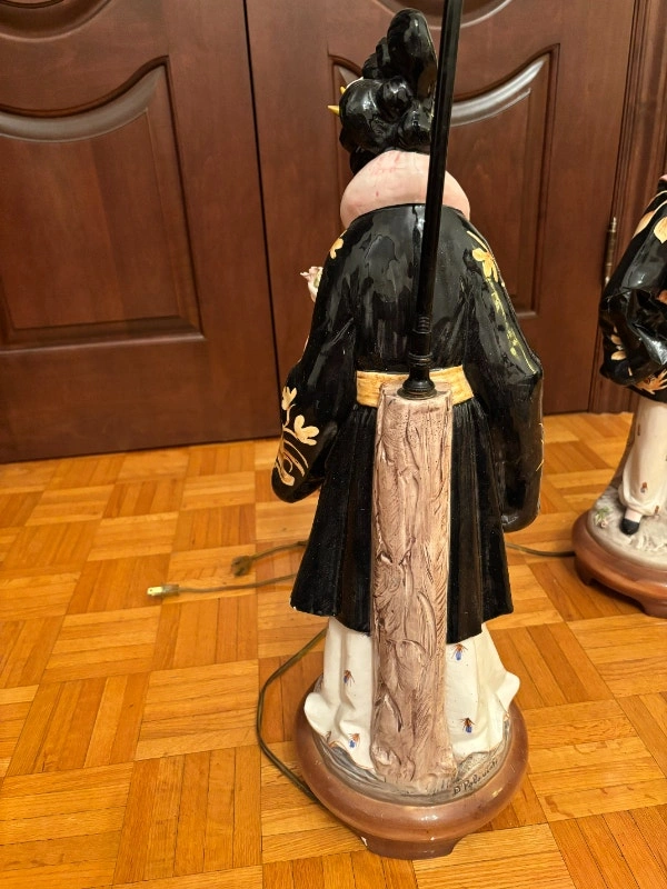 Two Japanese figures (male and female) late 1960 lamp bases (without shades) from renowed artist D. Polo Uito and made in Italy. They are both damaged but with some TLC can probably be restored or repurposed. They are Capo di Monte. The lamp fixtures are in working order. They measure approximately 40 inches tall to the top of the lamp fixture (and 25 inches with the female/male figure only ) and with a 23 inches diameter at the base. Unfortunately, they were damaged while in storage over the many years. The faces however are exquisite. The price reflects the condition of the pieces. Would prefer to sell as a pair as they belong together. However, if you only want one, then it is $50. In pristine condition, these would go for $1000 each or more. From a PF and SF home. Pickup only in the St Lawrence market area of downtown Toronto. Cash only.