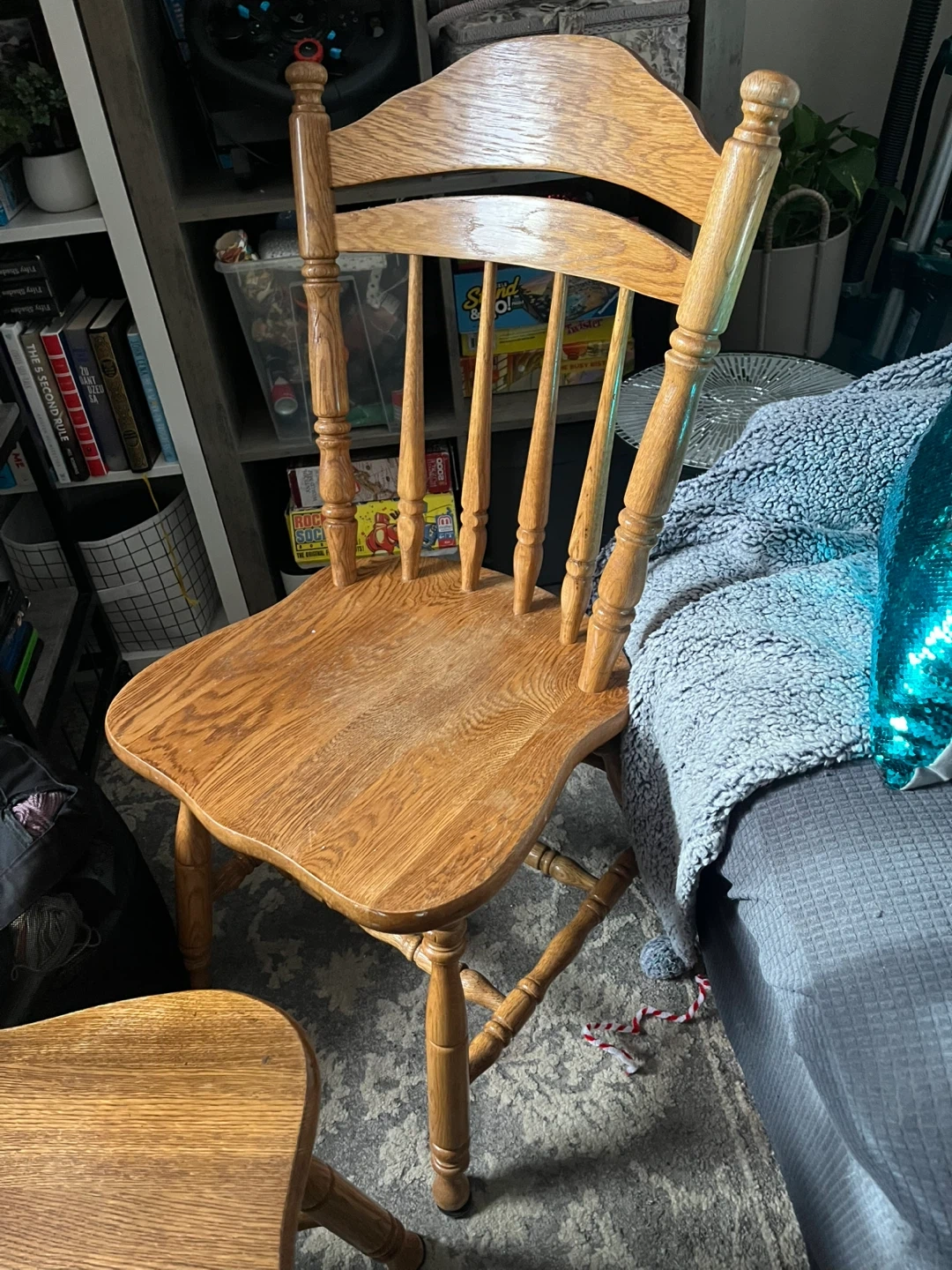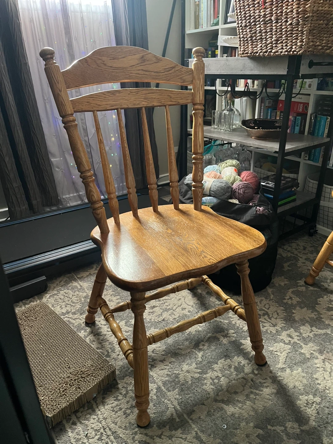 Selling a classic wooden dining chair. It's sturdy and in good condition, perfect for adding a touch of warmth to your dining space. The natural wood finish complements any decor. It's ready to be a part of your home!