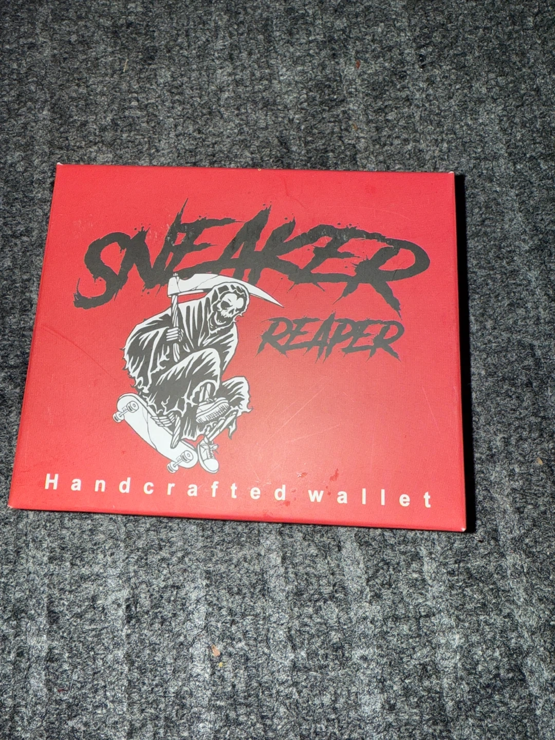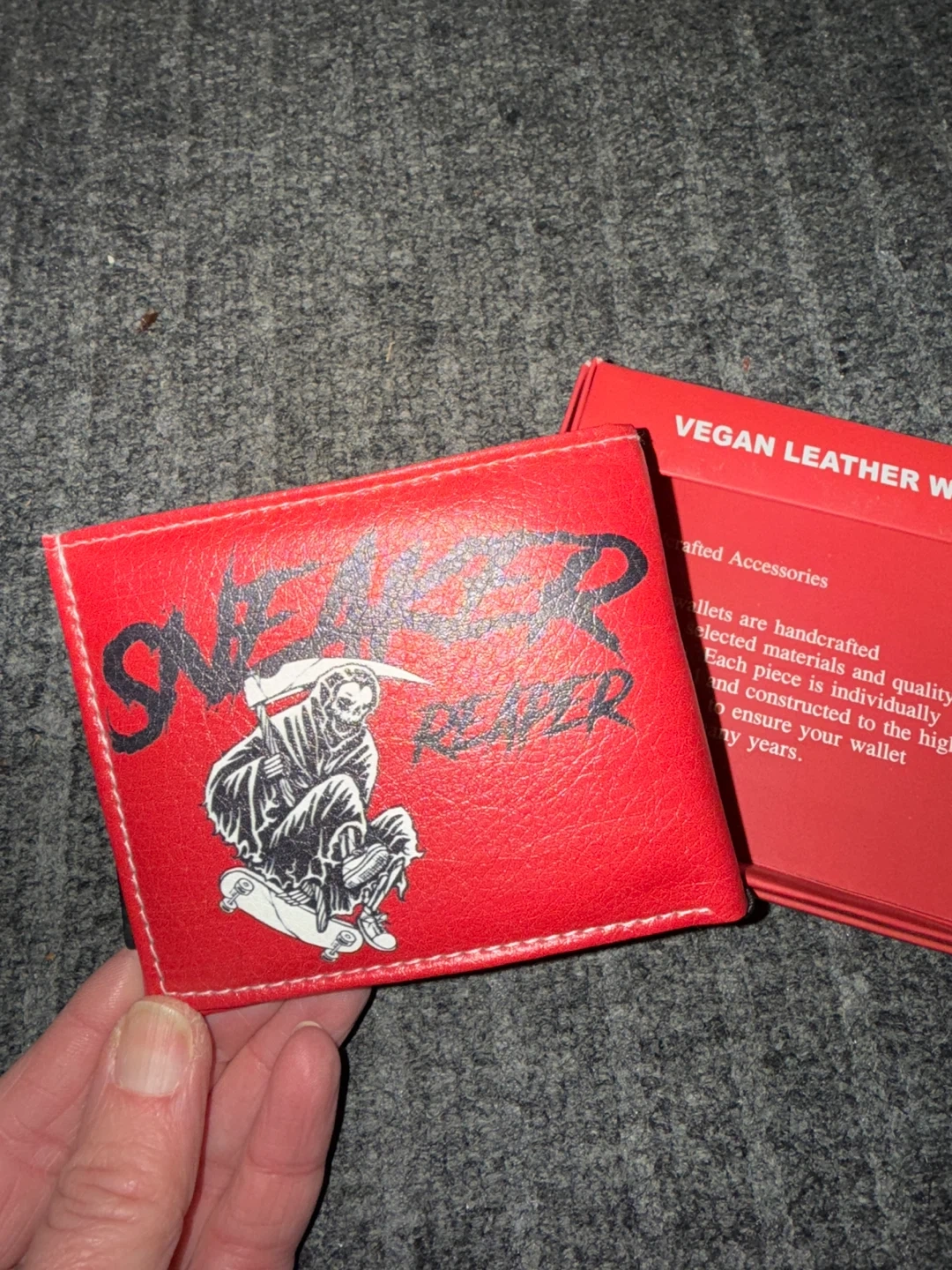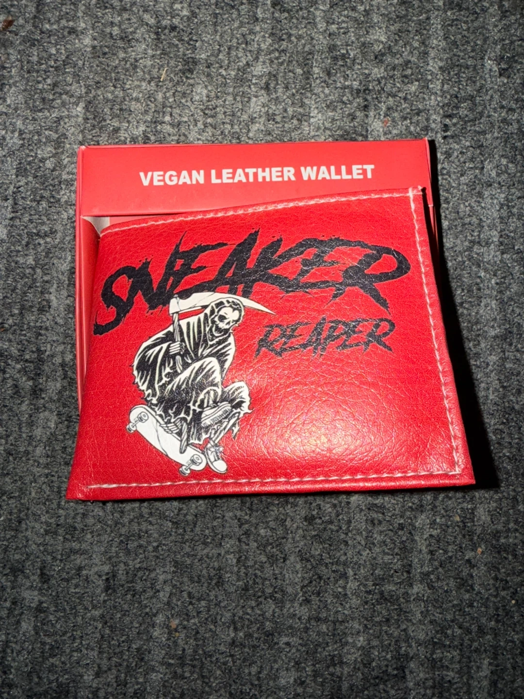 Selling a brand new Sneaker Reaper vegan leather wallet! It's a vibrant red color with a unique design. The wallet is handcrafted using selected materials and quality fittings, ensuring it's designed to last for years. Comes with the original box!