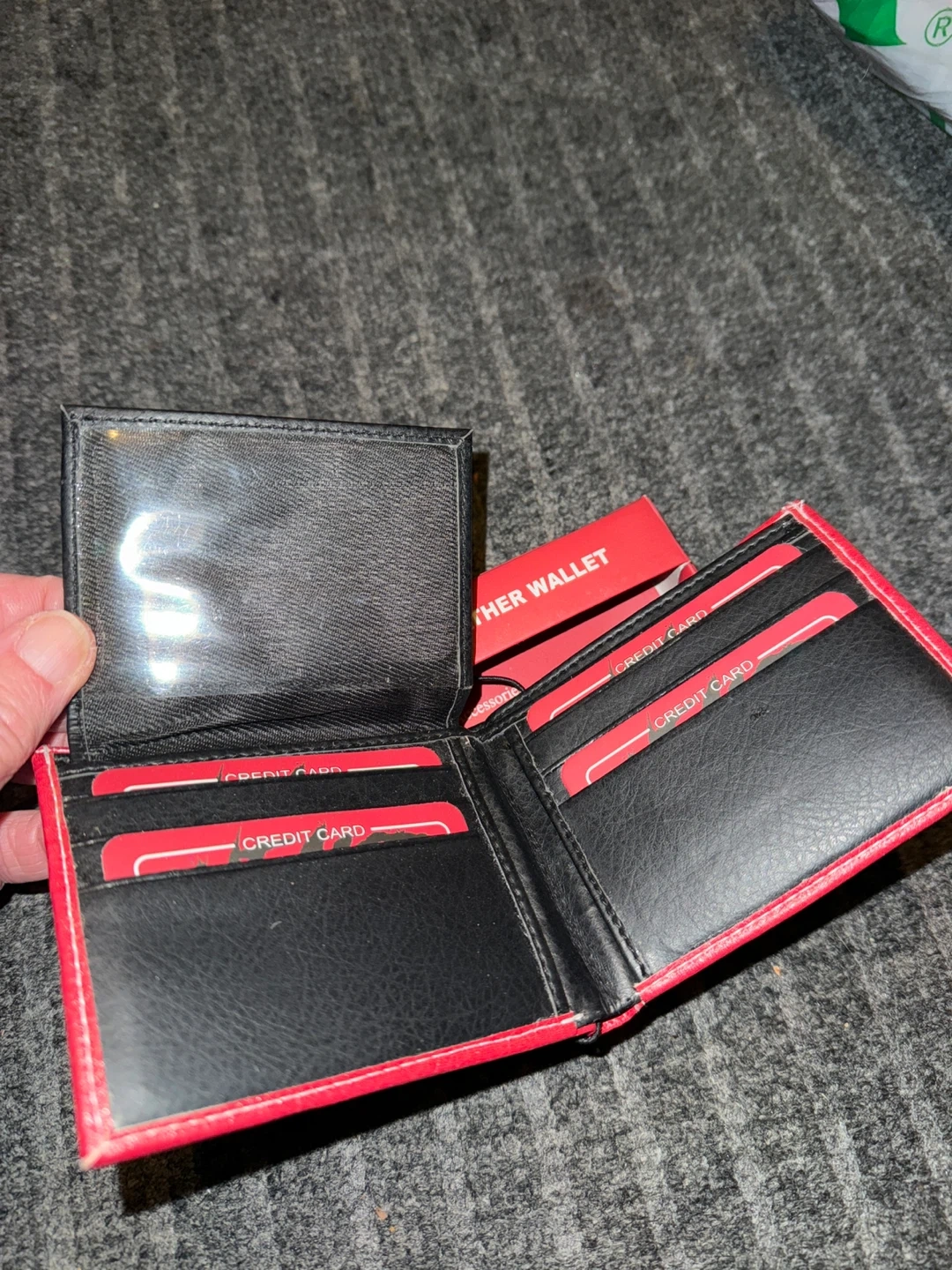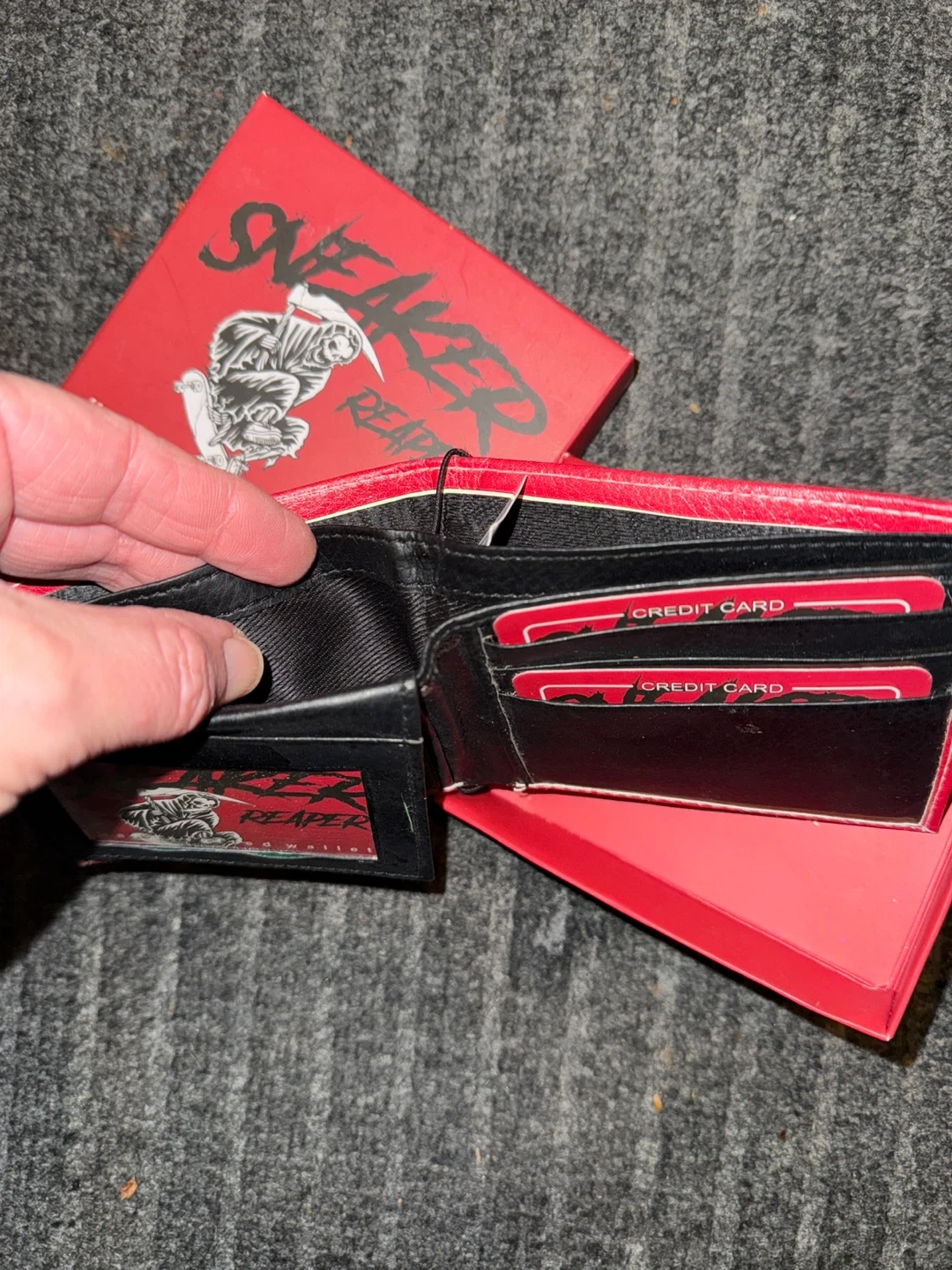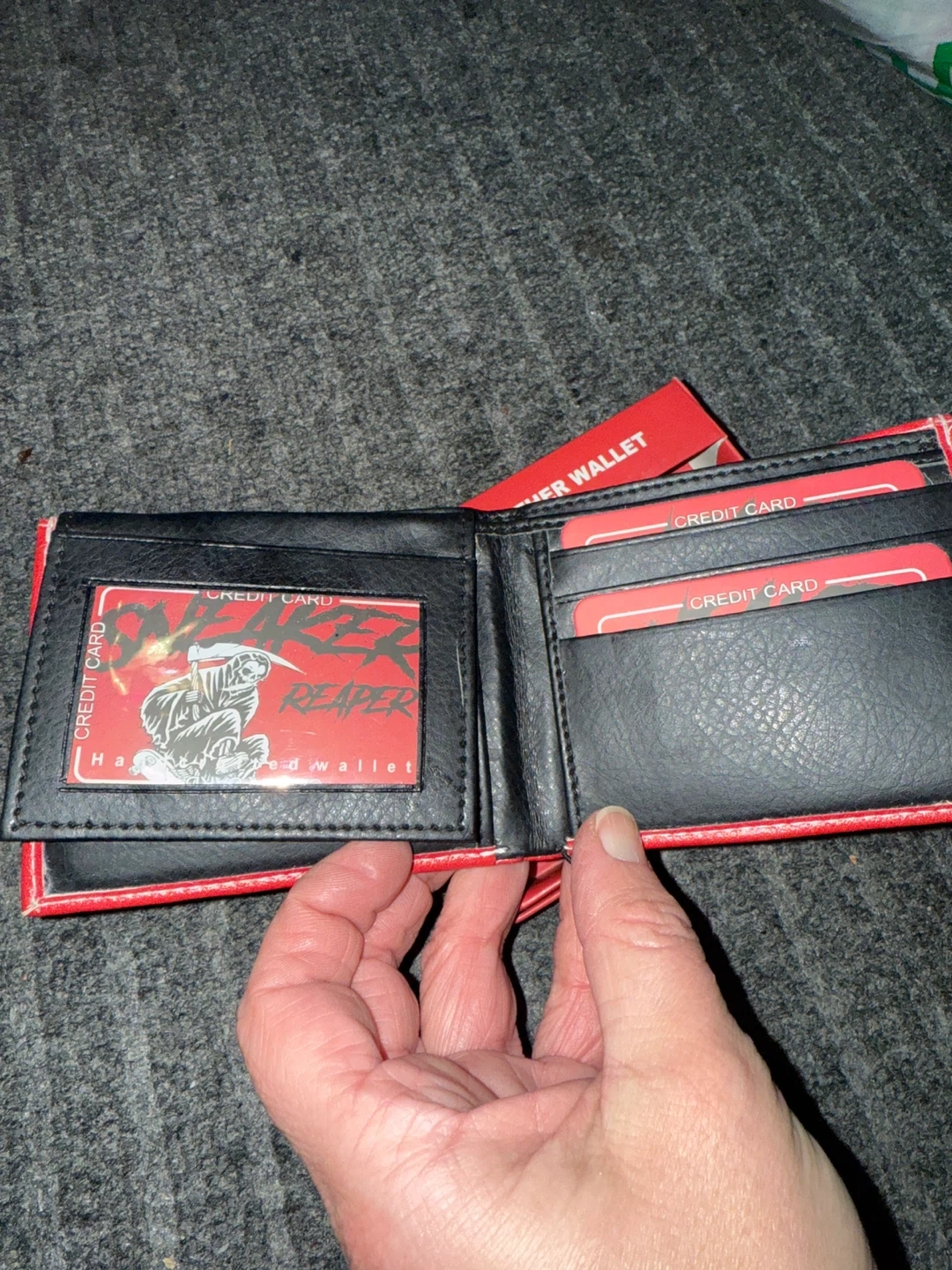 Selling a brand new Sneaker Reaper vegan leather wallet! It's a vibrant red color with a unique design. The wallet is handcrafted using selected materials and quality fittings, ensuring it's designed to last for years. Comes with the original box!